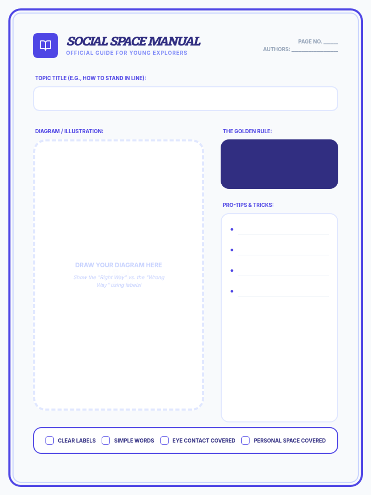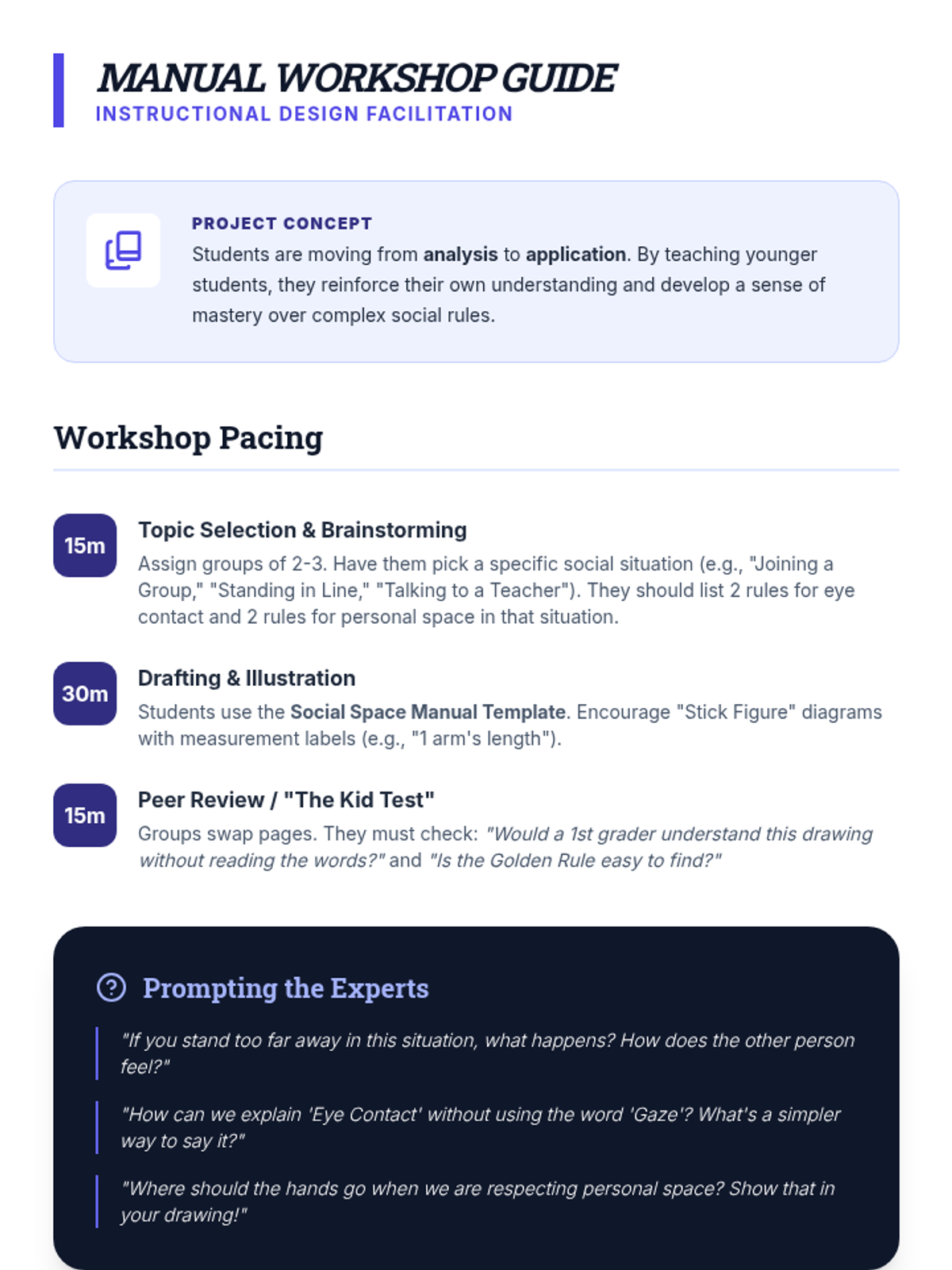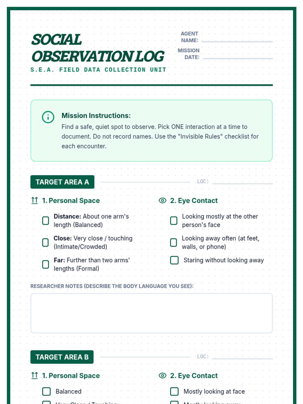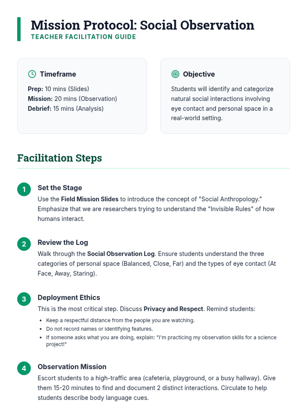 A project-based sequence where 5th-grade students act as 'Social Anthropologists' to study and teach the nuances of eye contact and personal space. Students observe real-world interactions, analyze media, and create a comprehensive 'Social Space Manual' to guide others.