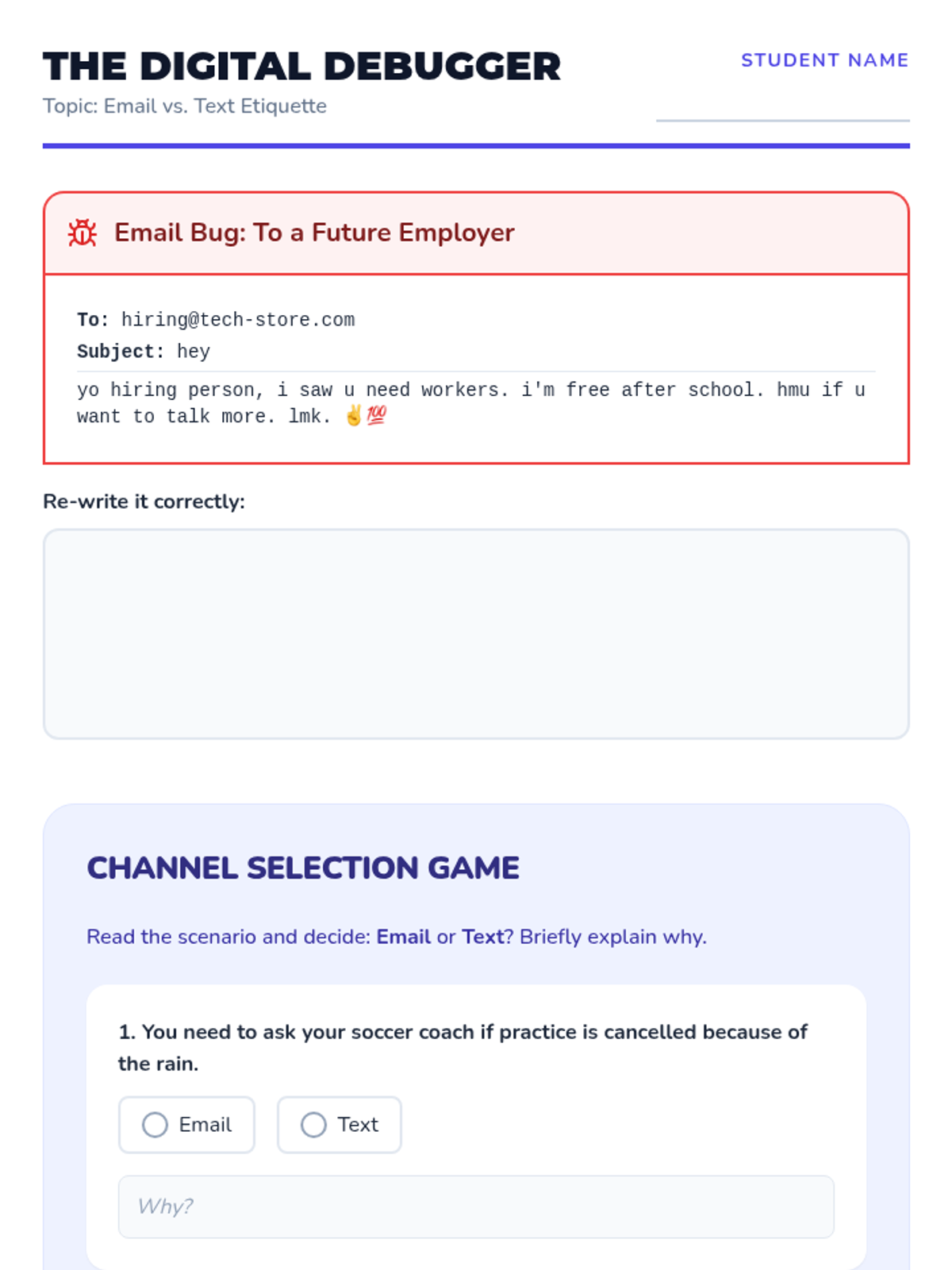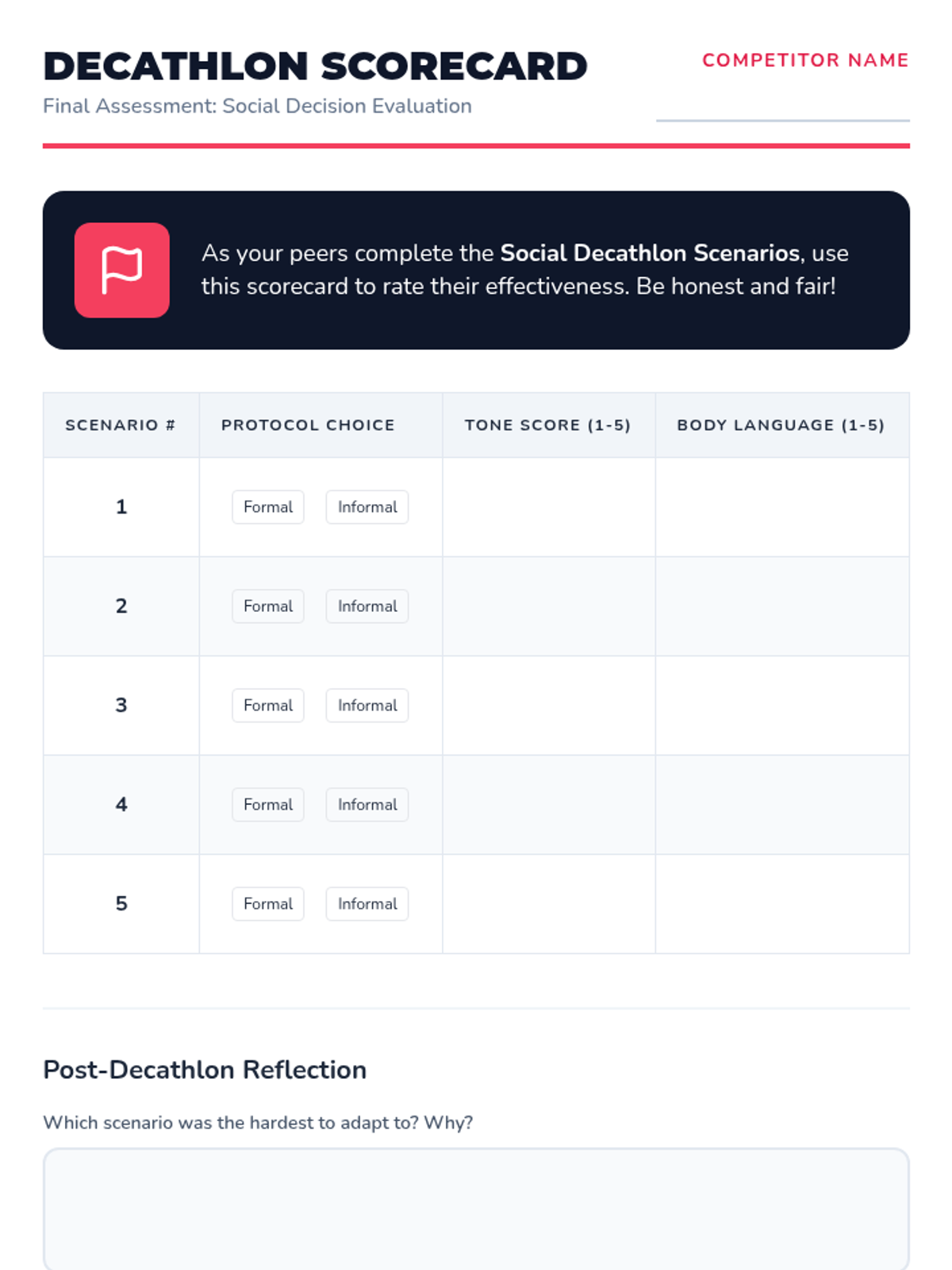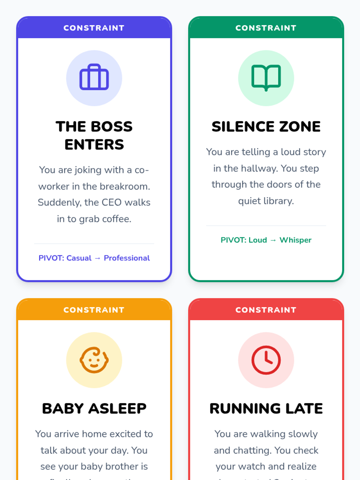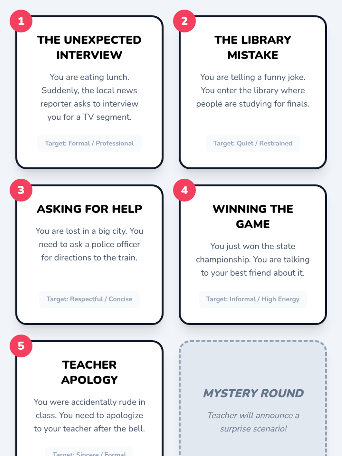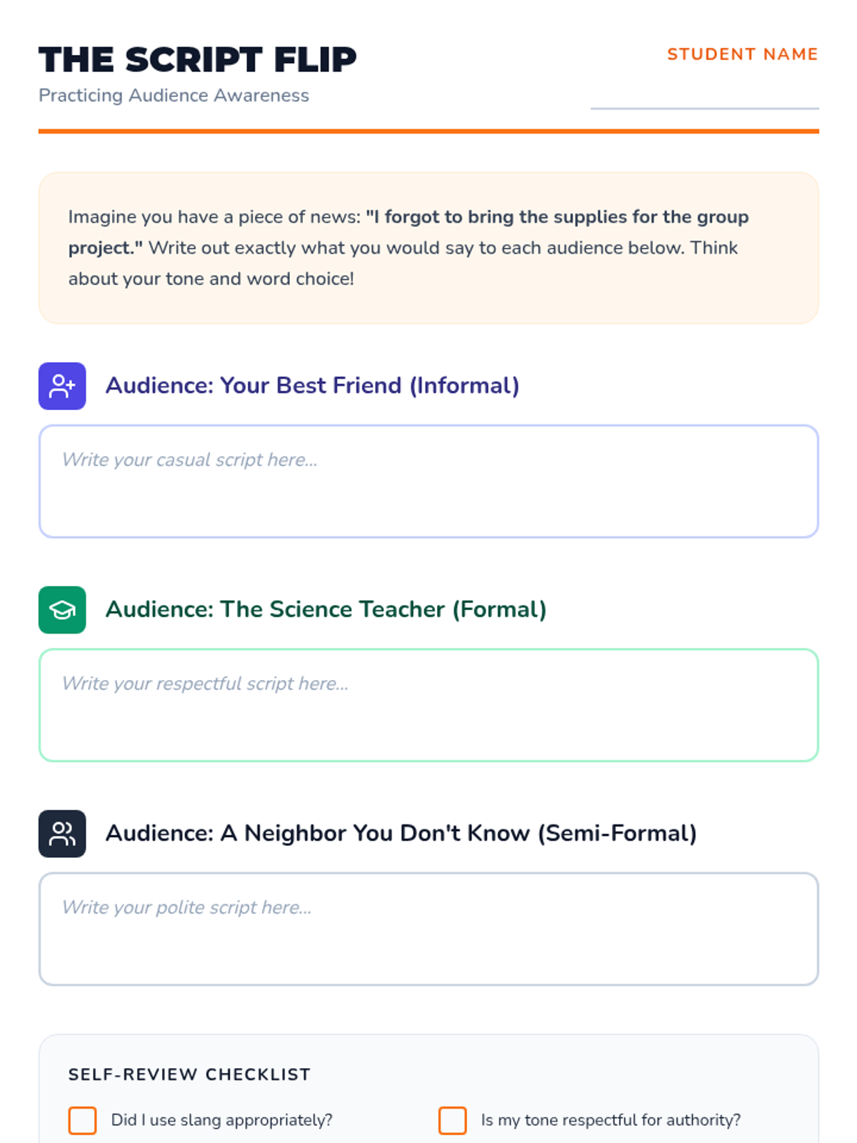 A game-based sequence designed for 7th-grade students to master code-switching and social communication. Students learn to evaluate their audience and adjust their tone, vocabulary, and body language across formal and informal contexts.