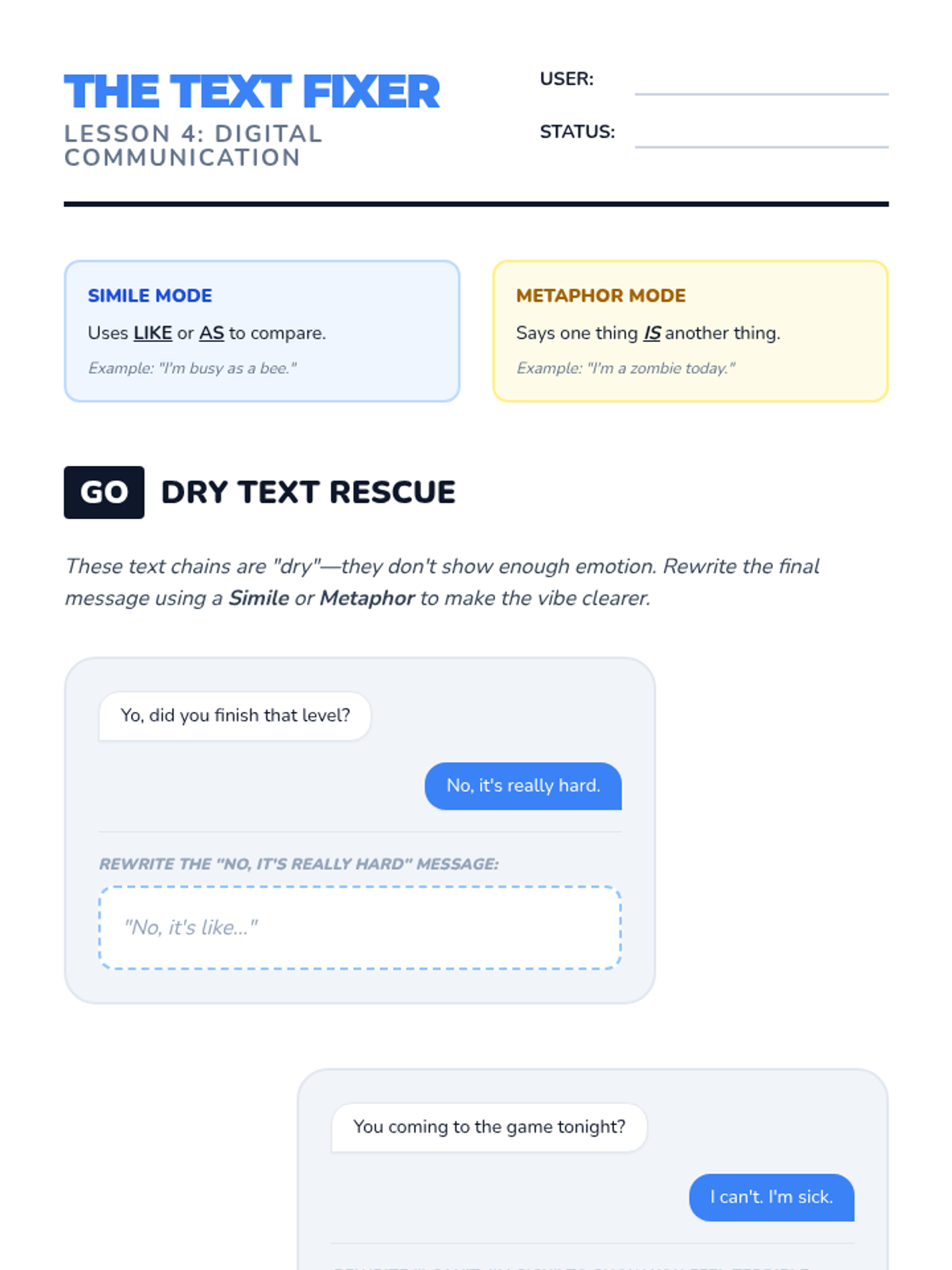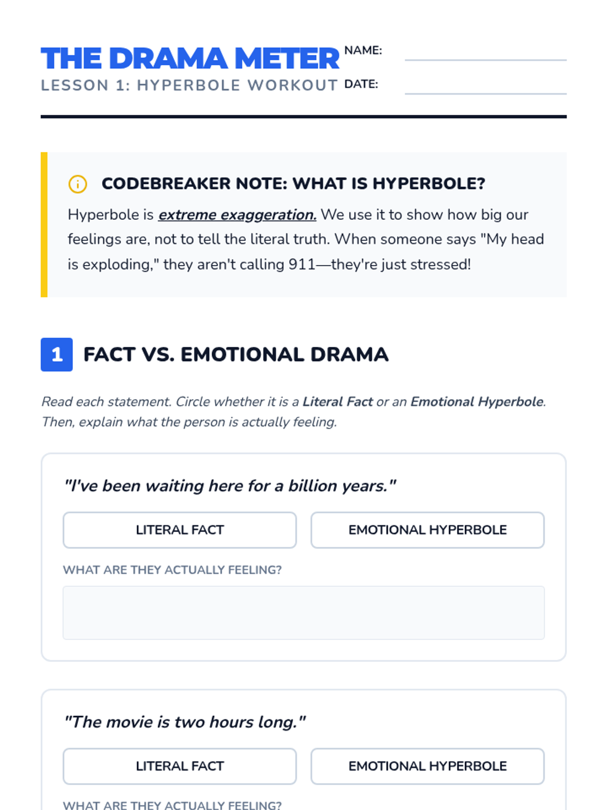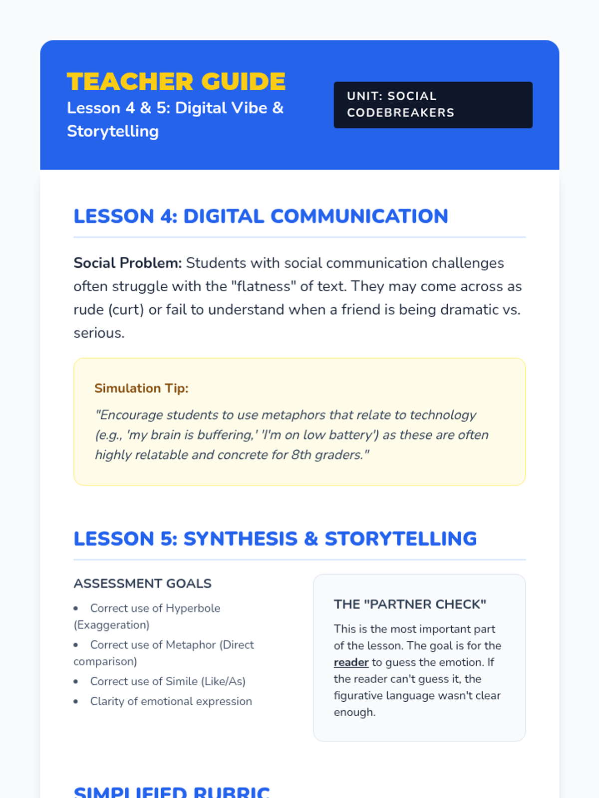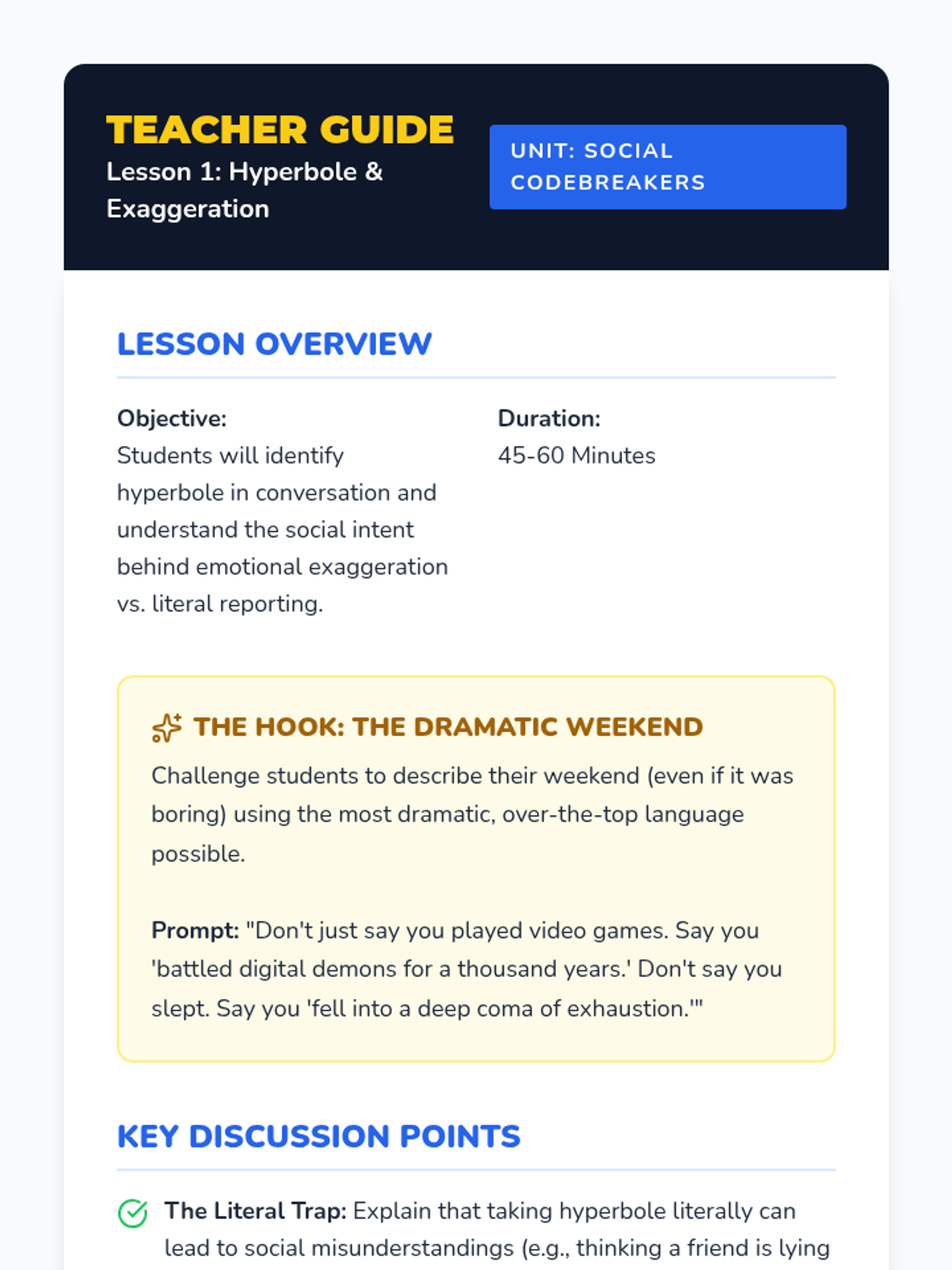 A comprehensive sequence for 8th-grade social communication focused on metaphors and hyperbole. Students move from identifying dramatic exaggerations to using sophisticated figurative language in digital and narrative contexts to better express their emotions.