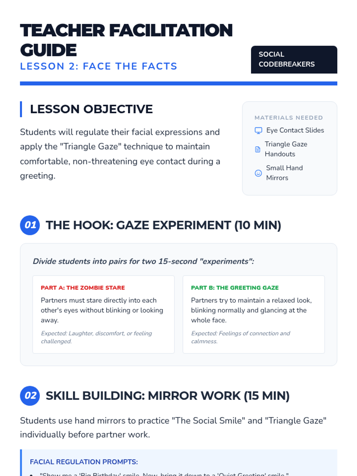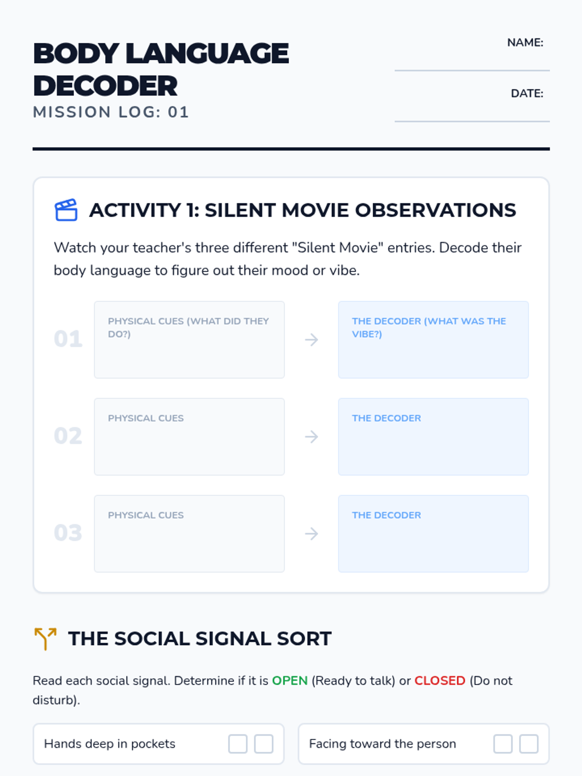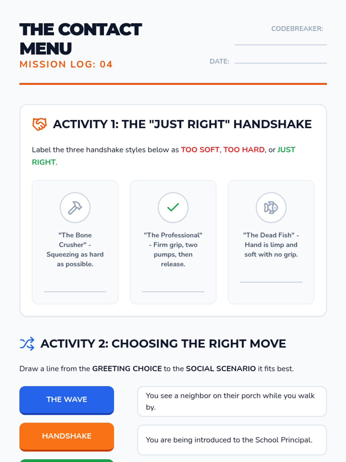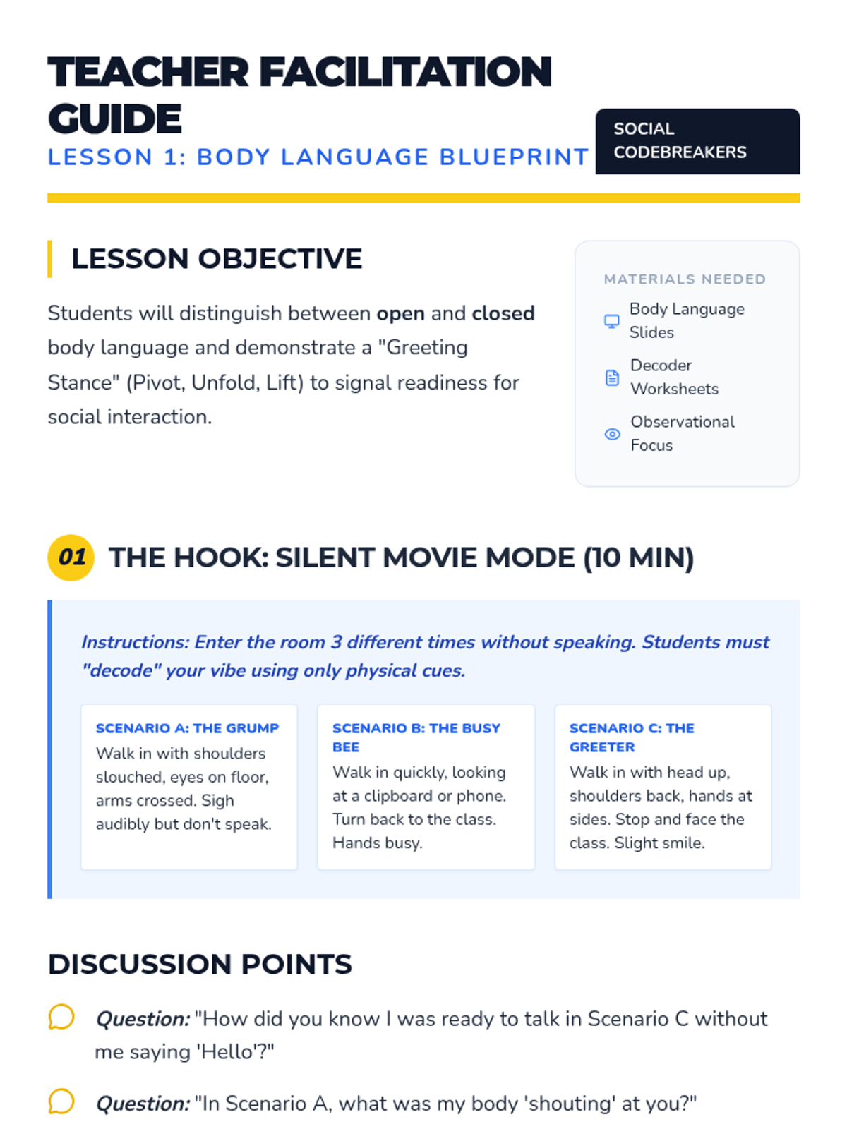 A comprehensive 5th-grade sequence focusing on non-verbal social communication skills during greetings. Students learn to 'decode' body language, eye contact, and personal space to improve their social interactions.