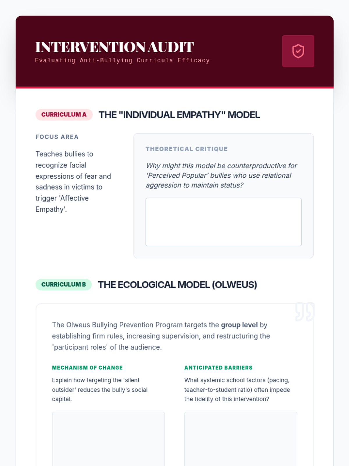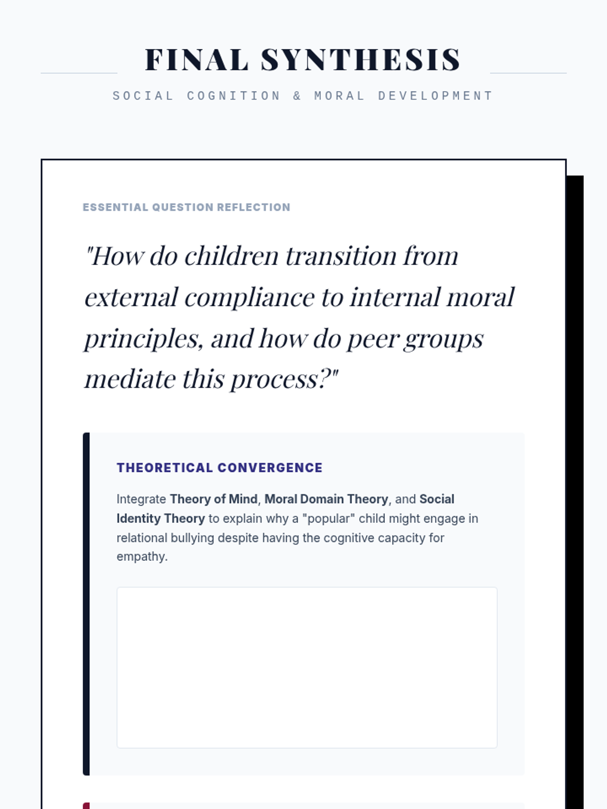This graduate-level sequence explores the evolution of social cognition and moral reasoning in childhood, moving from foundational Theory of Mind to complex peer ecologies and group biases. Students will engage with seminal theories, critique traditional models, and design research-based interventions for school settings.