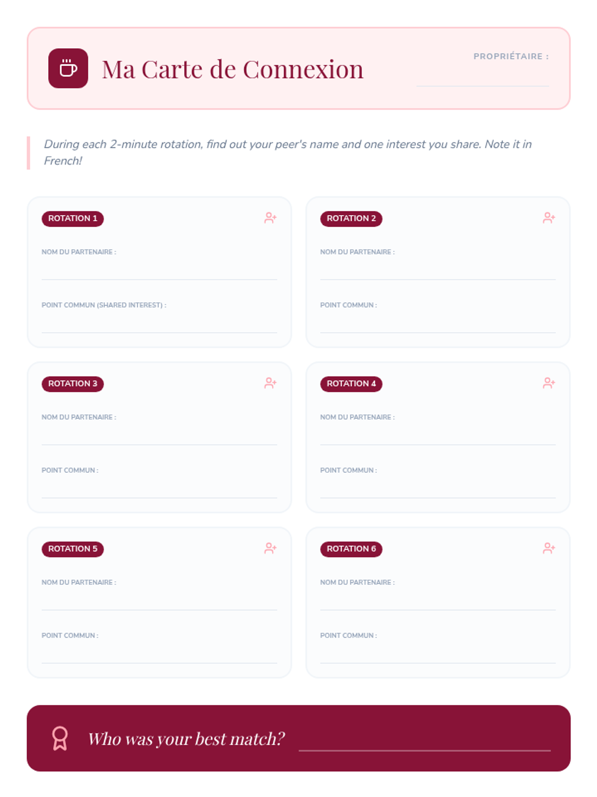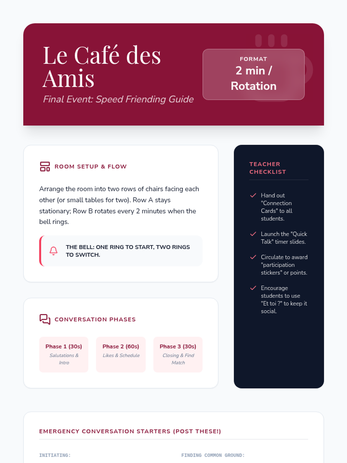 A beginner French sequence for 12th graders focused on building social connections through personal interests. Students progress from expressing basic likes/dislikes to complex question-forming and scheduling, culminating in a spontaneous 'Speed Friending' event.