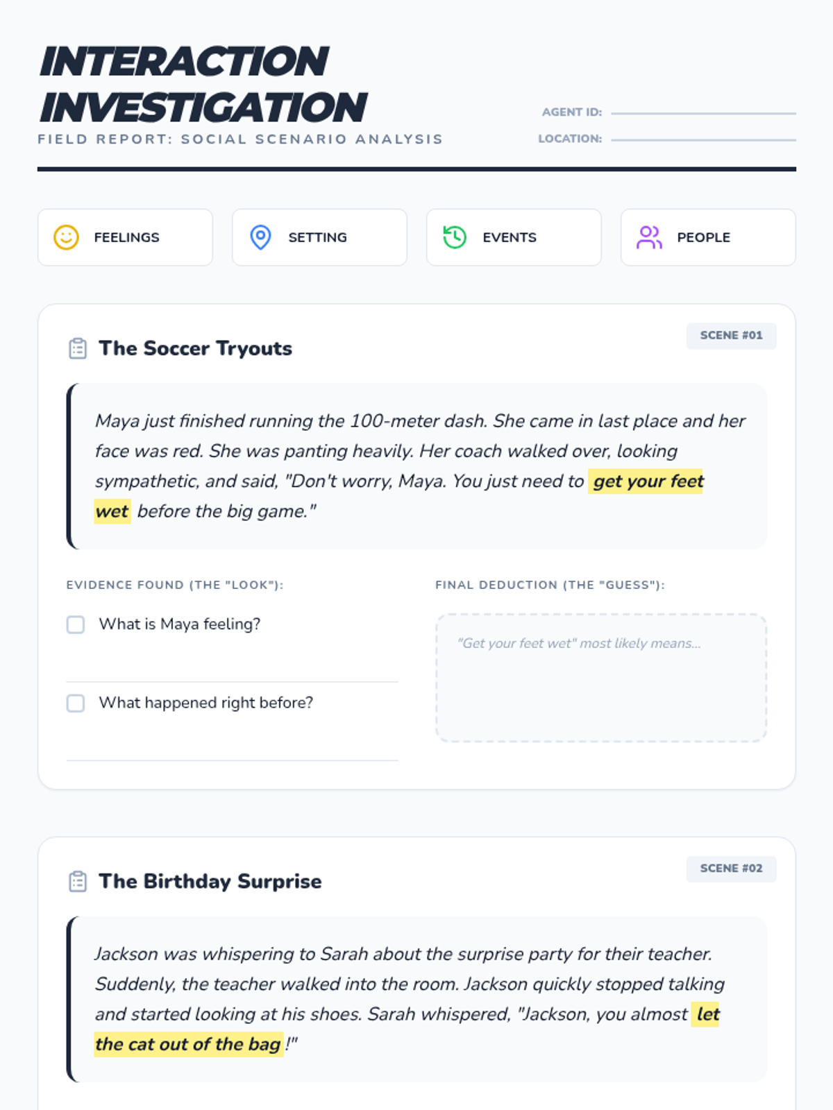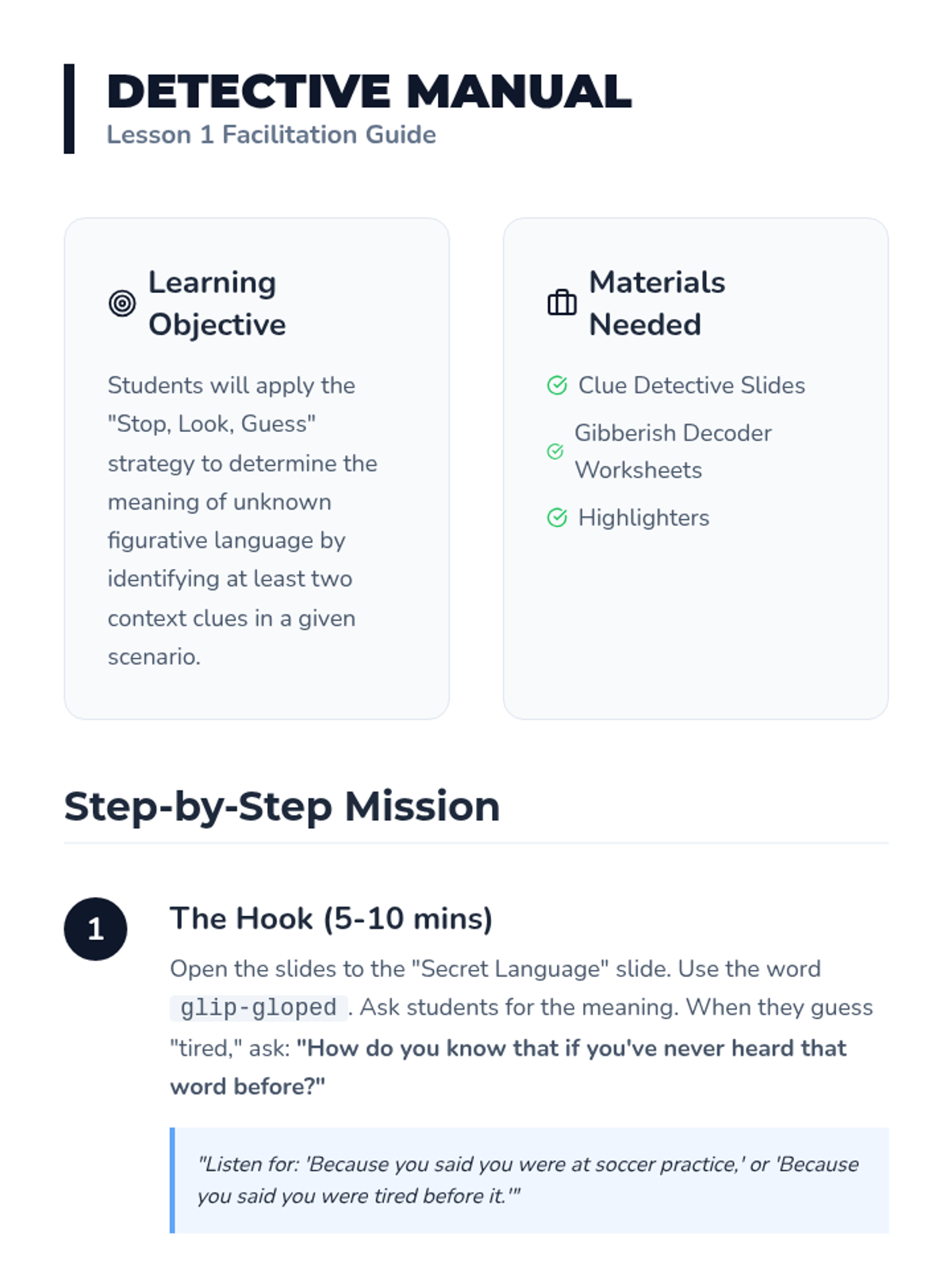 A 5-lesson sequence for 6th-grade social communication students, focusing on the 'Stop, Look, Guess' strategy to infer the meaning of idioms and figurative language using environmental and social context clues.
