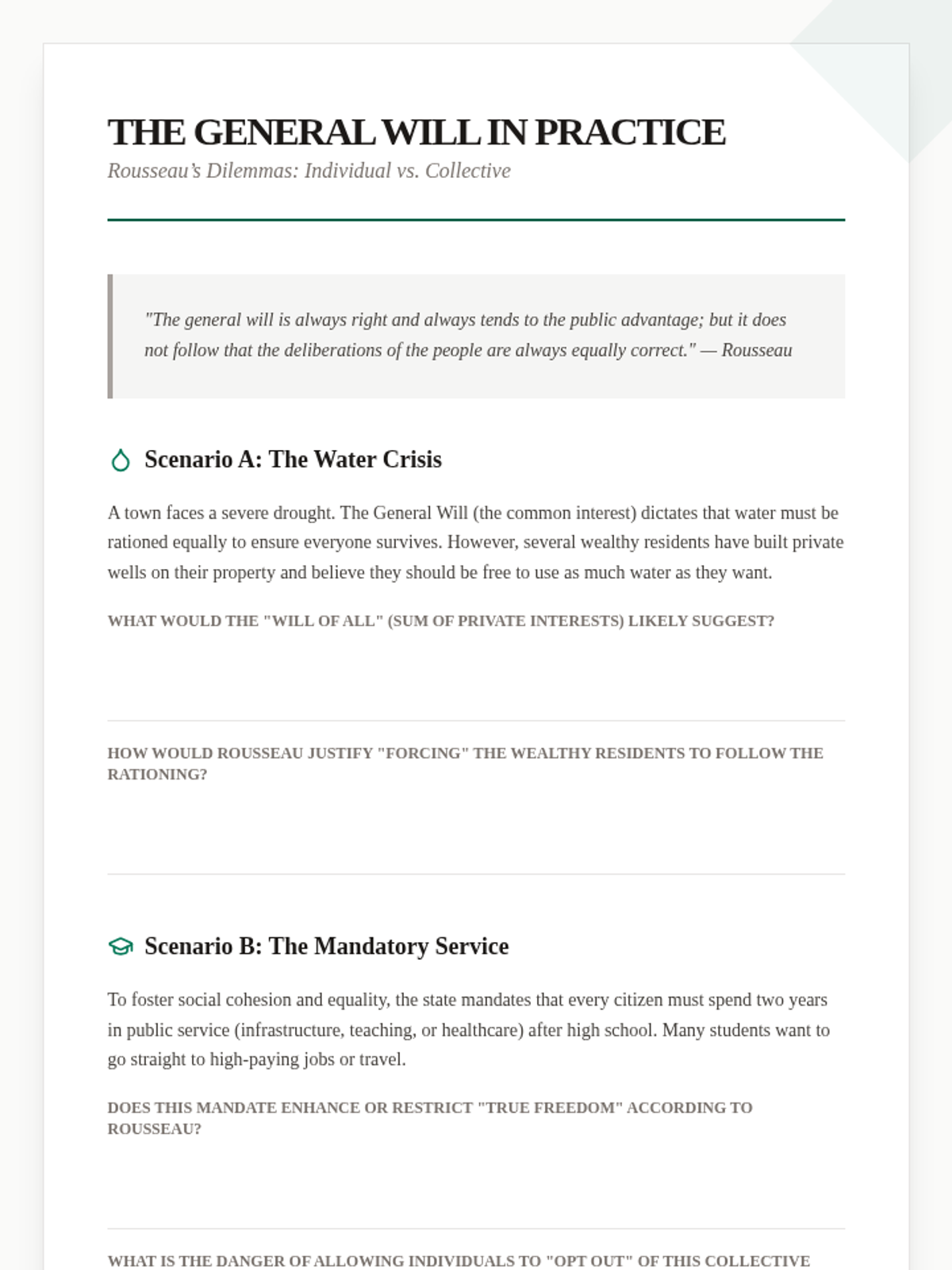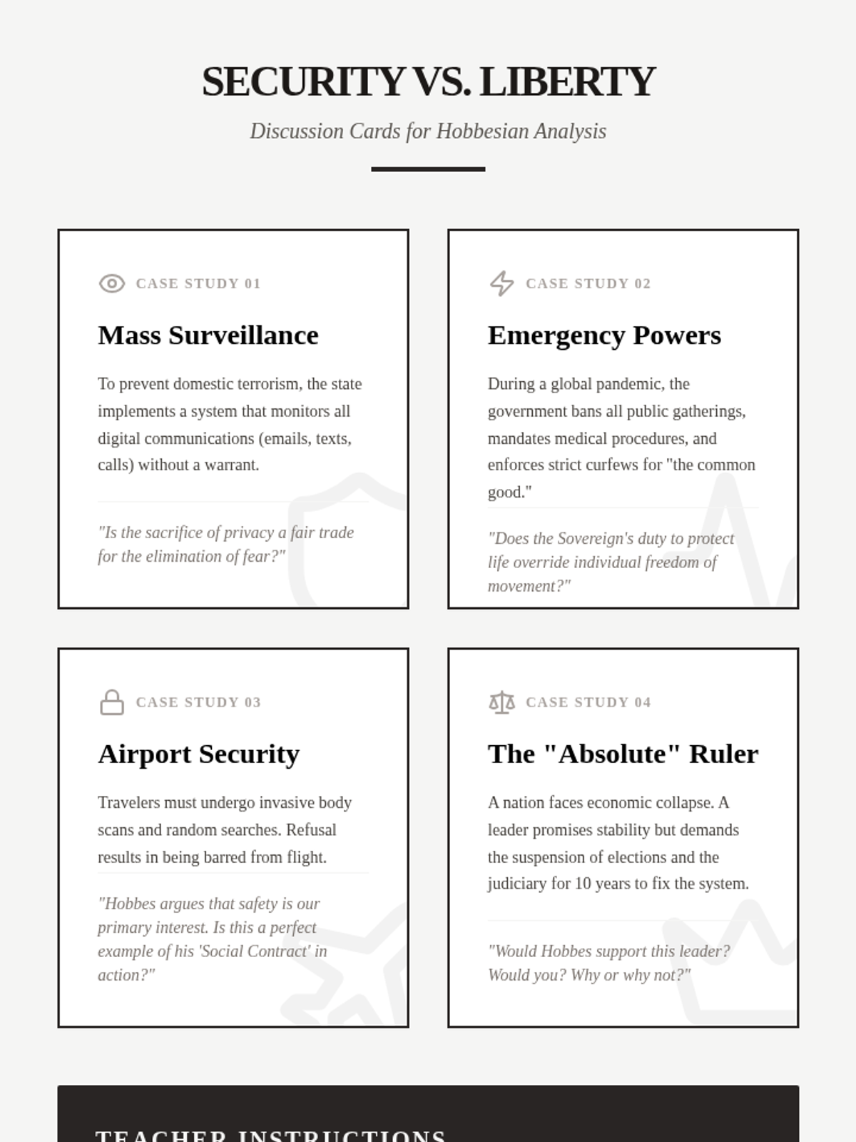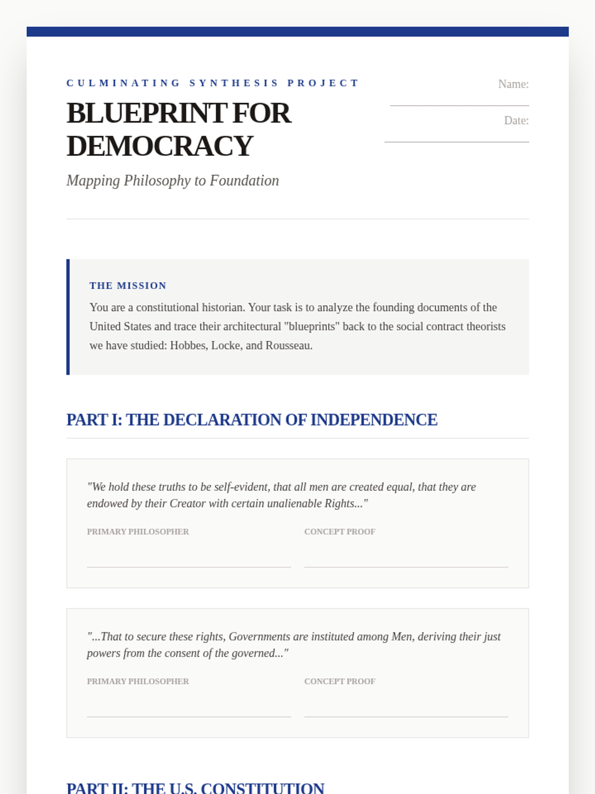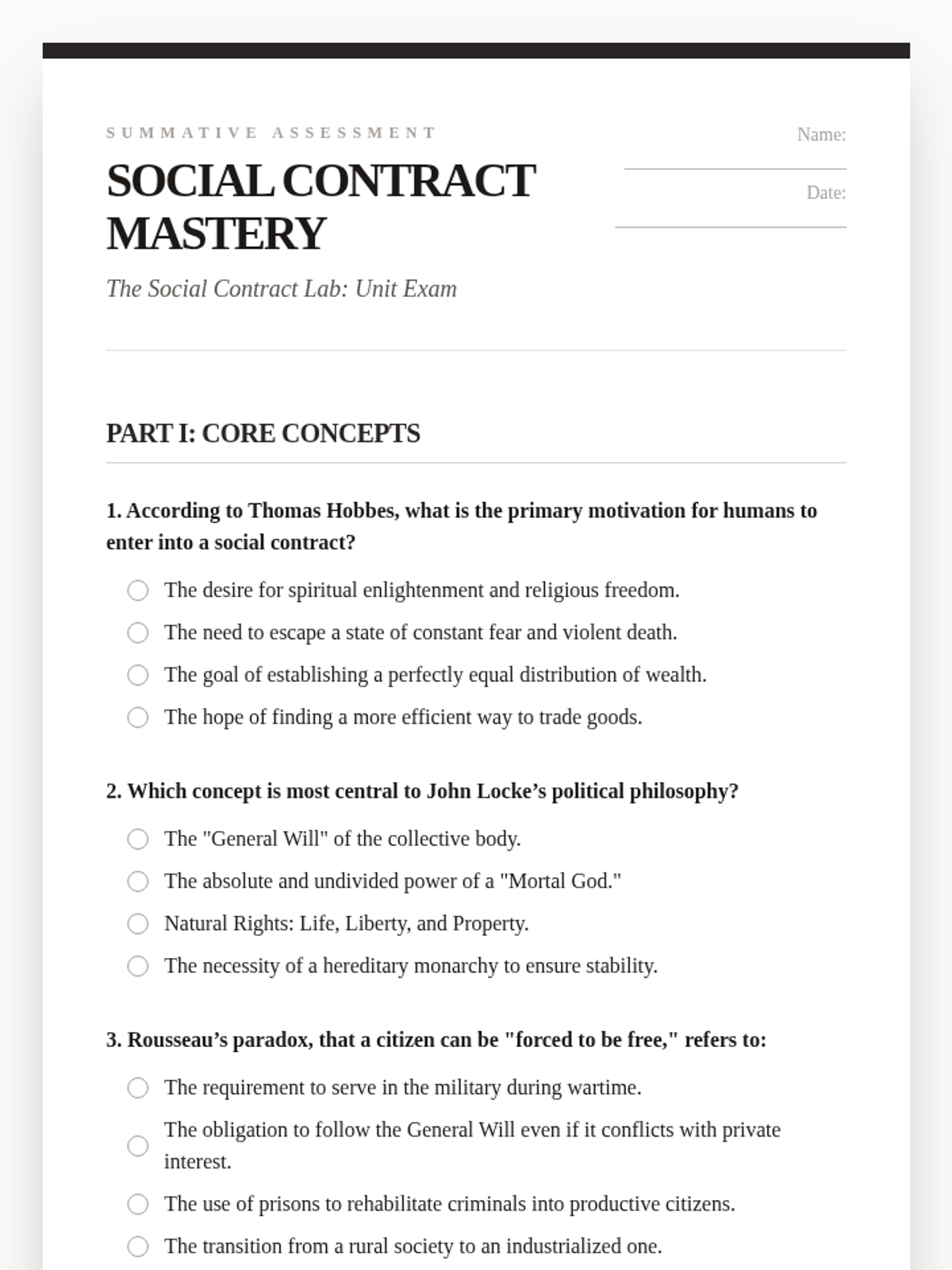 A comprehensive exploration of Social Contract Theory, examining the works of Hobbes, Locke, and Rousseau to understand the origins of political authority and the relationship between individual liberty and state security. Students engage in simulations, primary source analysis, and a final synthesis project mapping philosophical ideas to modern constitutional foundations.