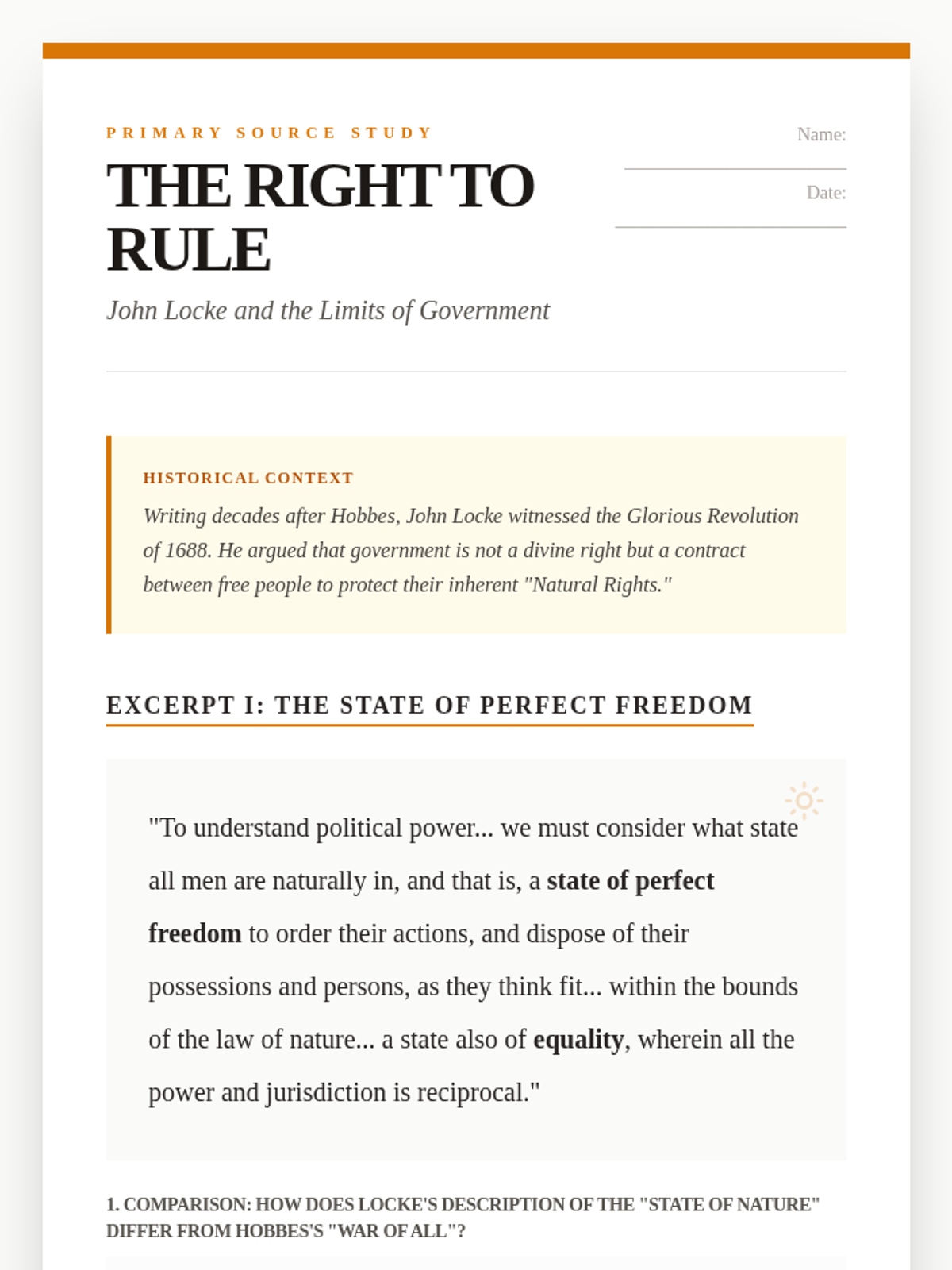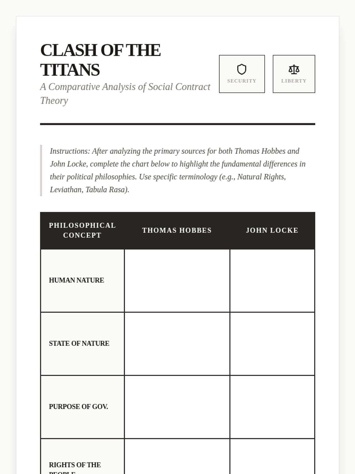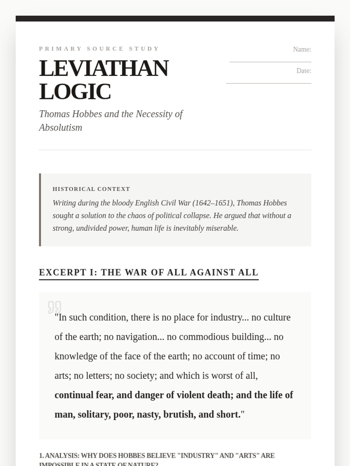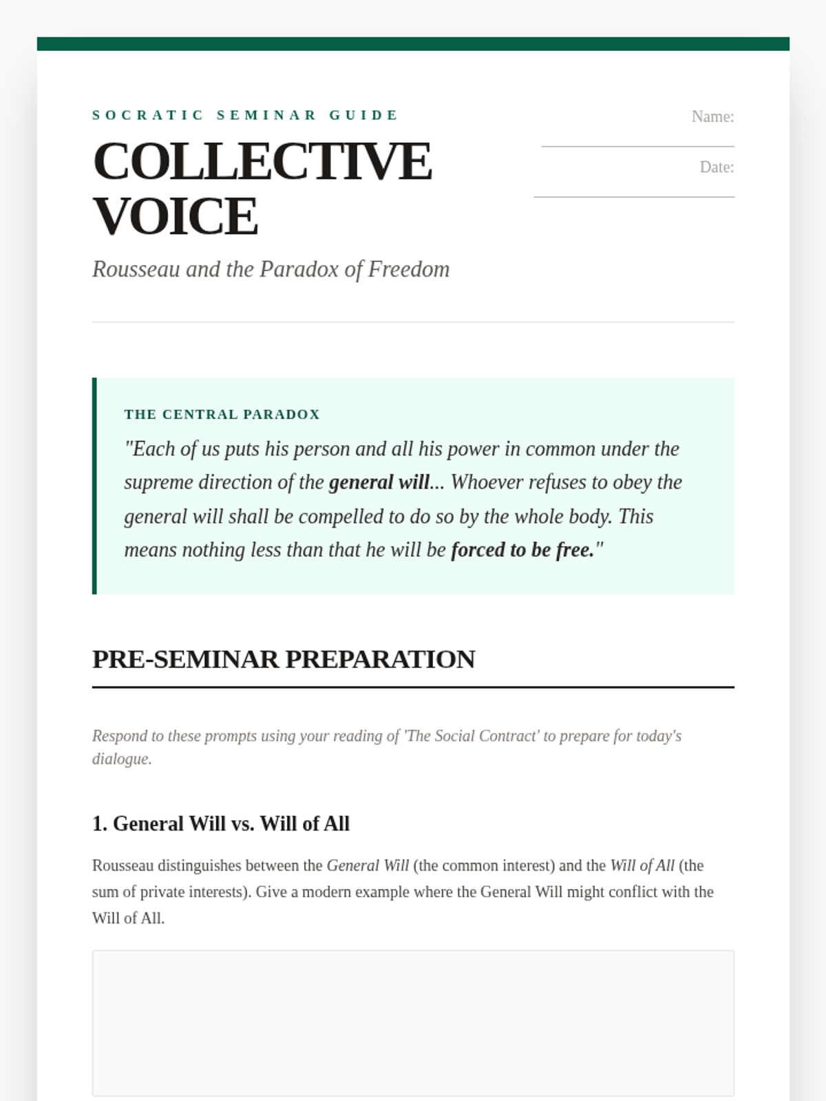 A comprehensive exploration of Social Contract Theory, examining the works of Hobbes, Locke, and Rousseau to understand the origins of political authority and the relationship between individual liberty and state security. Students engage in simulations, primary source analysis, and a final synthesis project mapping philosophical ideas to modern constitutional foundations.