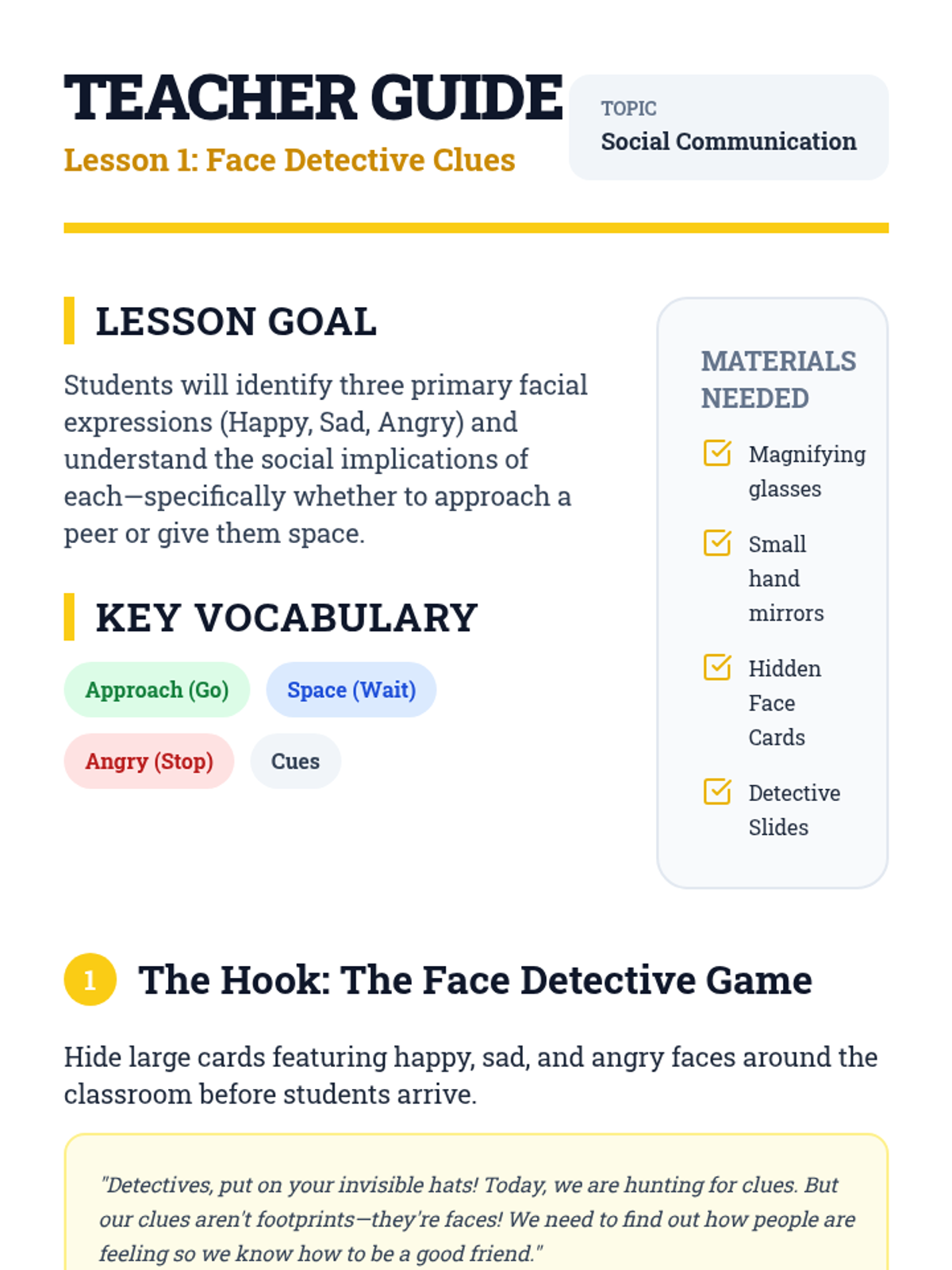 A comprehensive sequence for Pre-K students in Special Education, focusing on social communication and decision-making by interpreting non-verbal cues. Students learn to recognize facial expressions, body language, and tone of voice to decide how and when to approach peers.