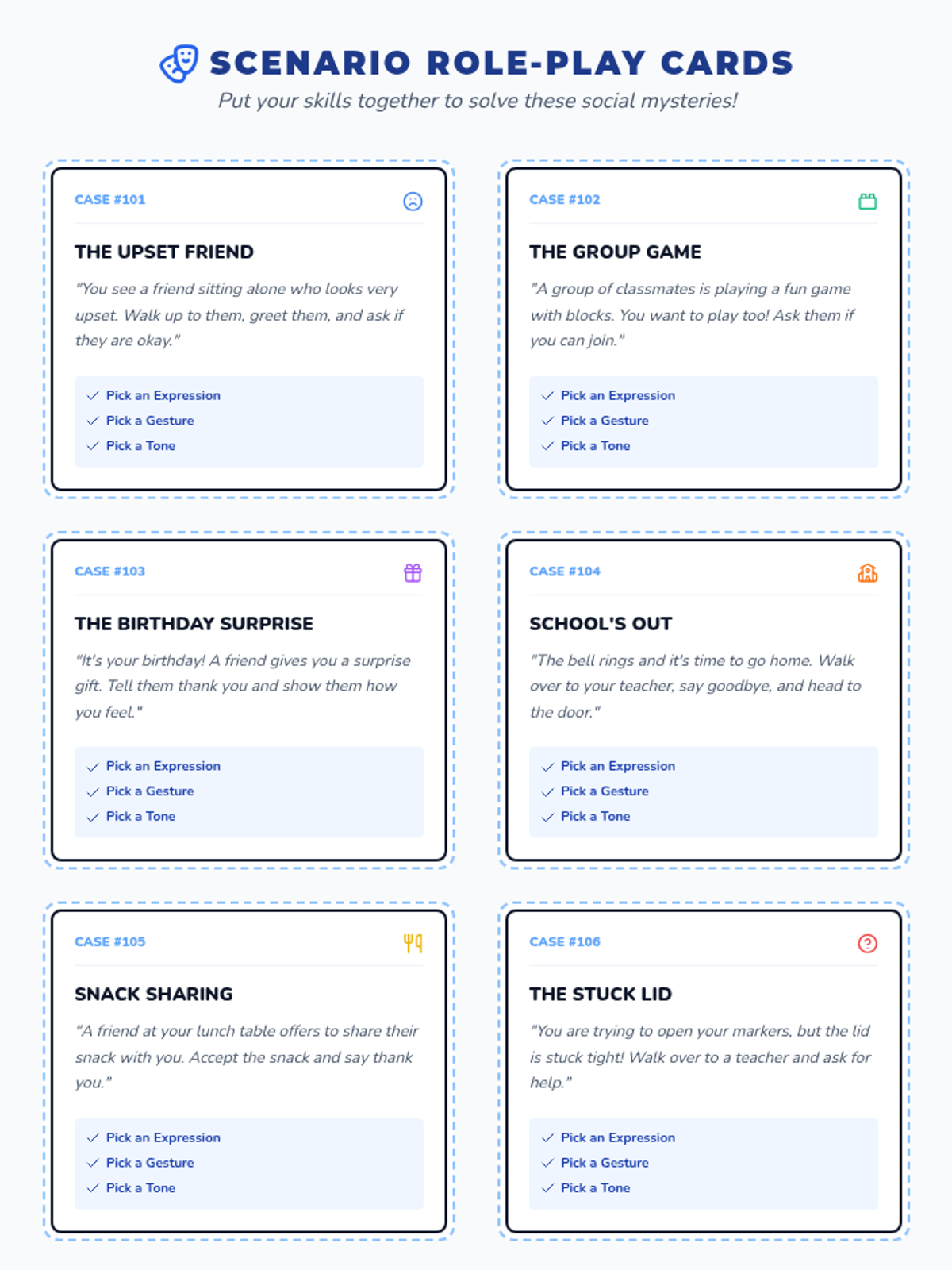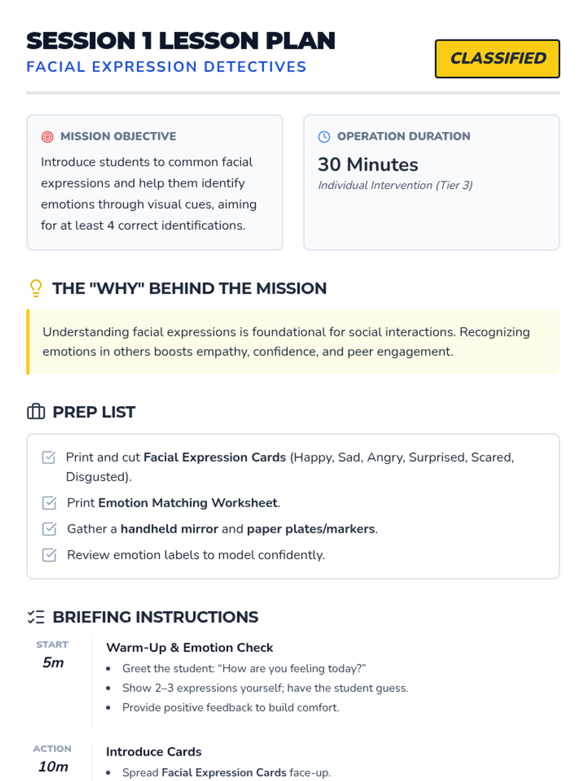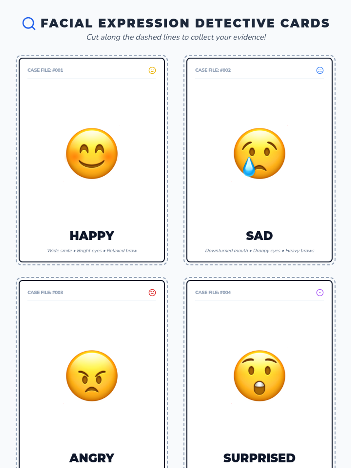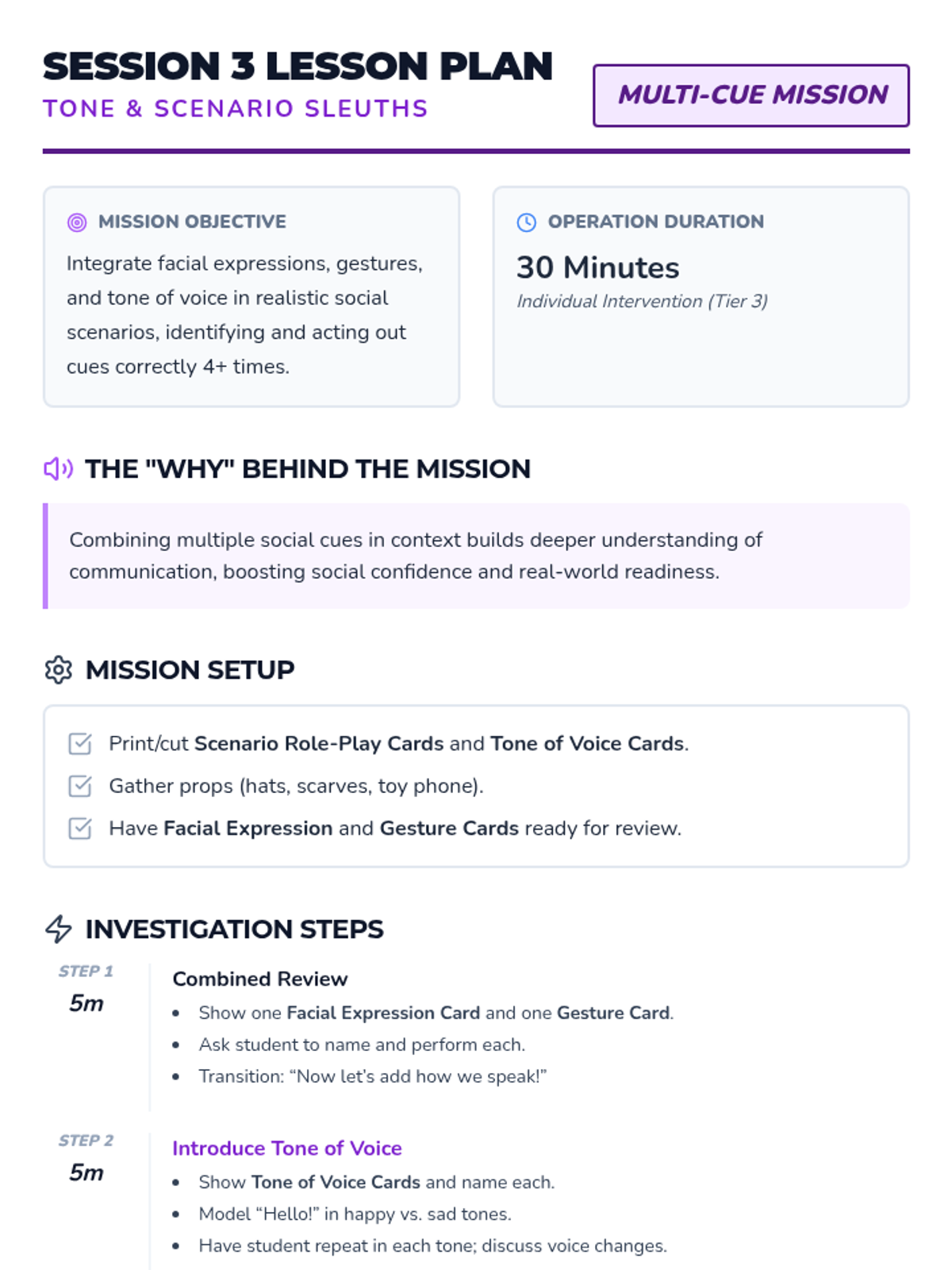 A 5-session intervention series for K-2 students to master social cues through detective-themed activities, focusing on facial expressions, gestures, and tone of voice.