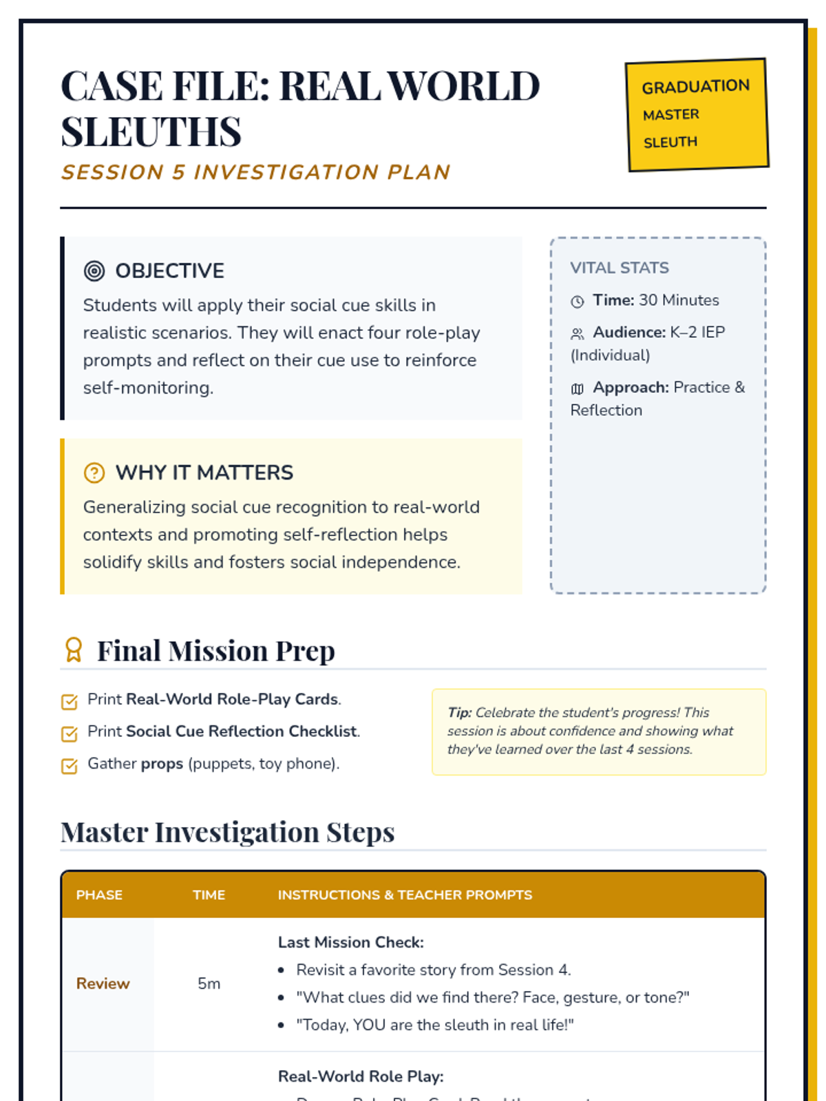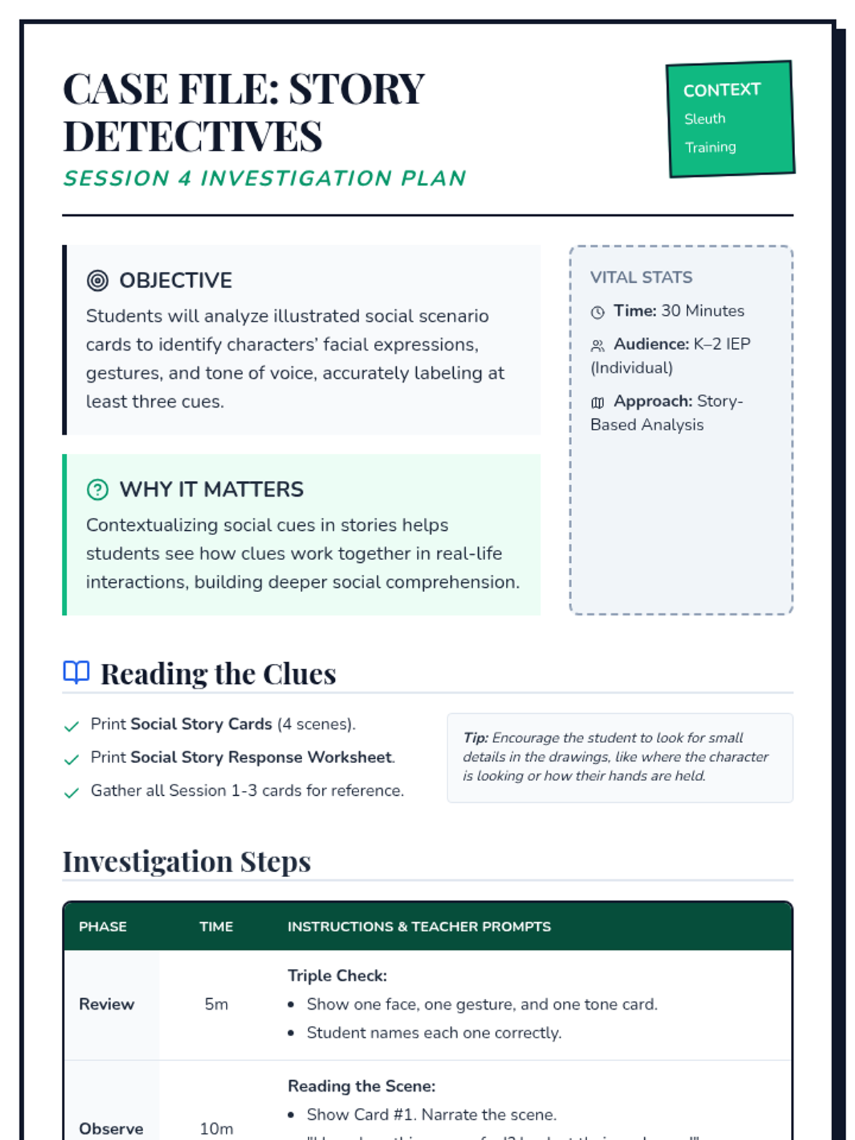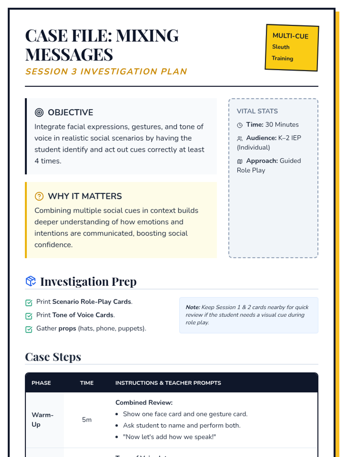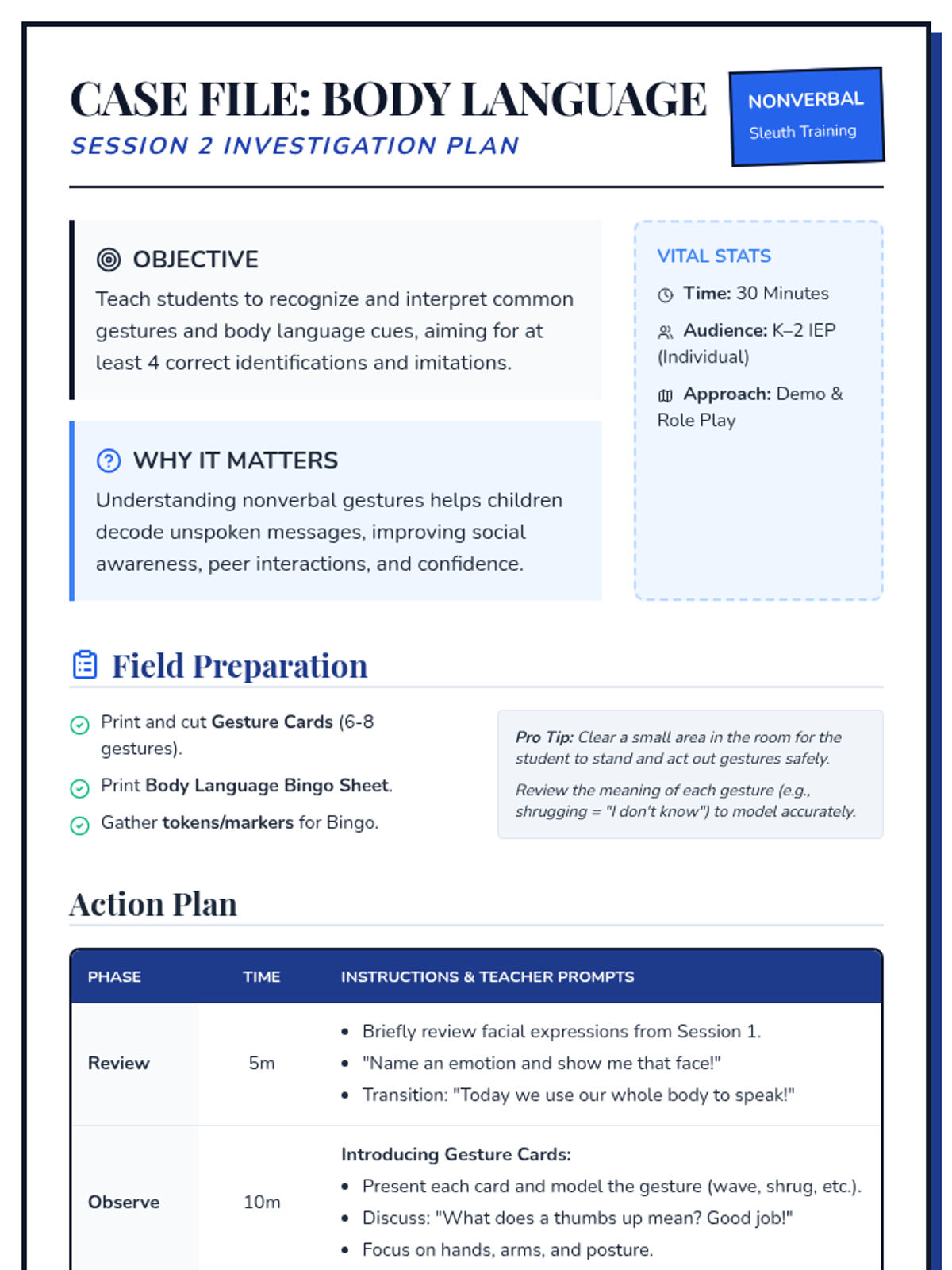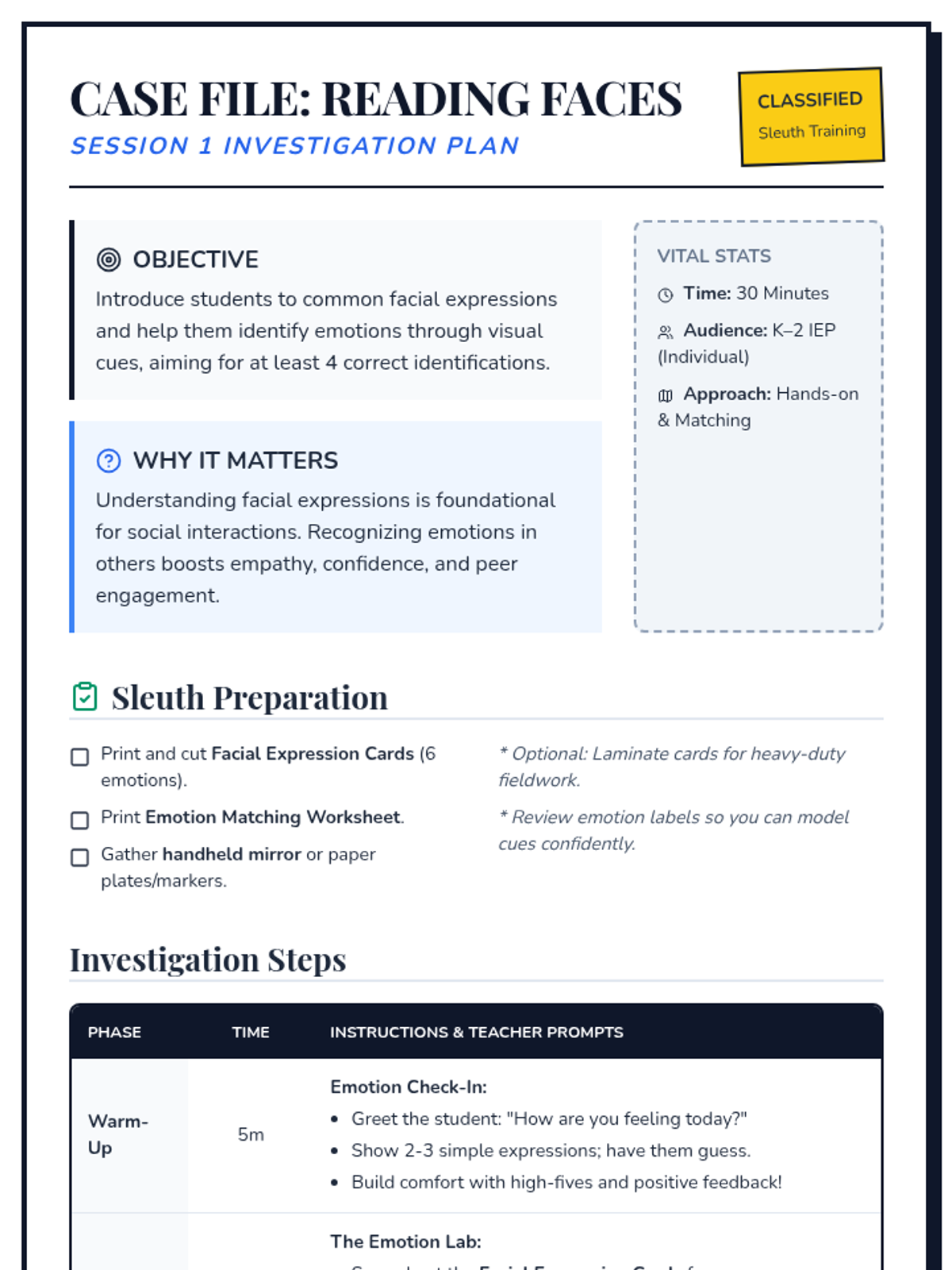 A 5-session sequence for K–2 students on IEPs to learn how to recognize and interpret facial expressions, gestures, and tone of voice through hands-on detective-themed activities.