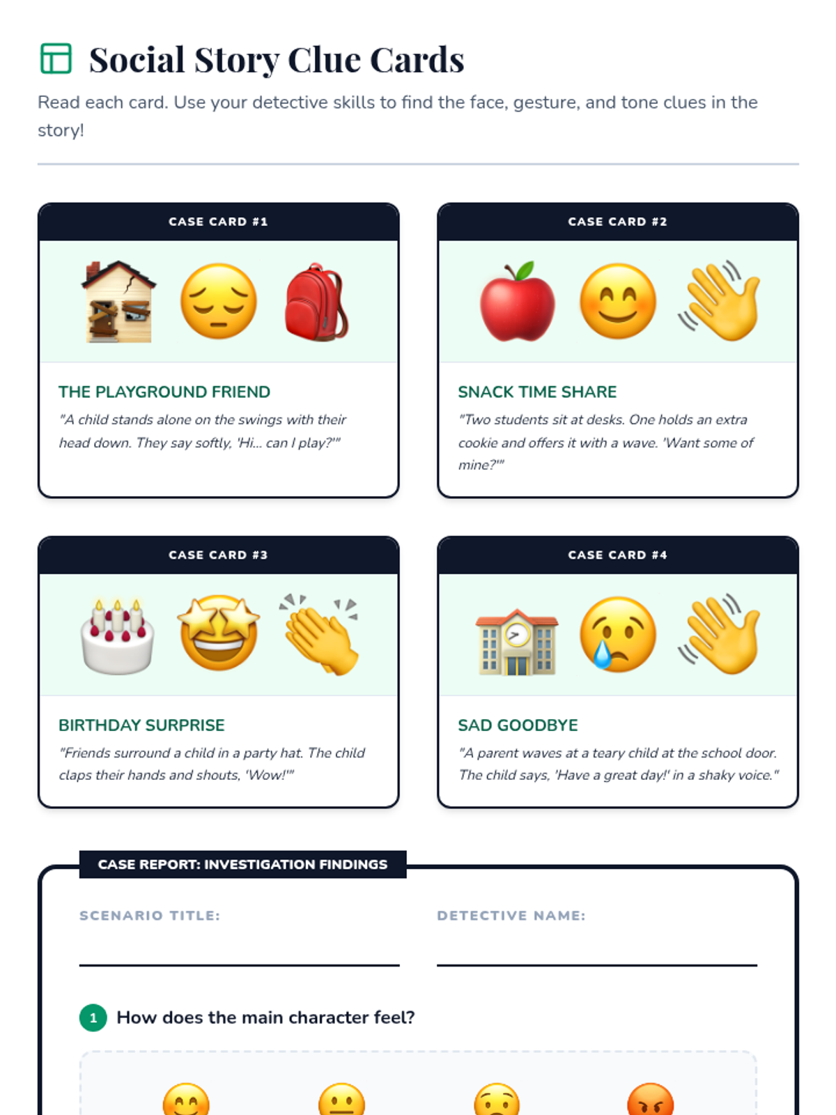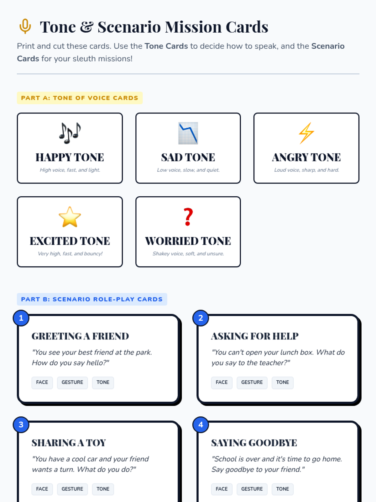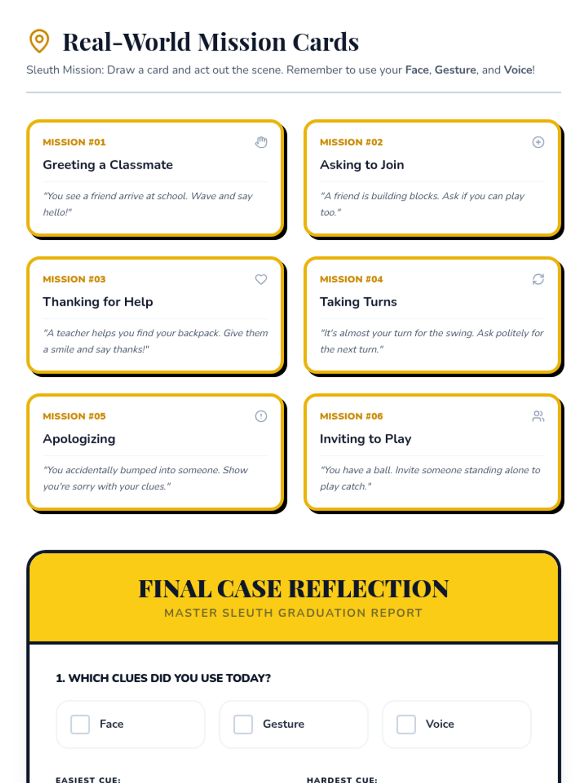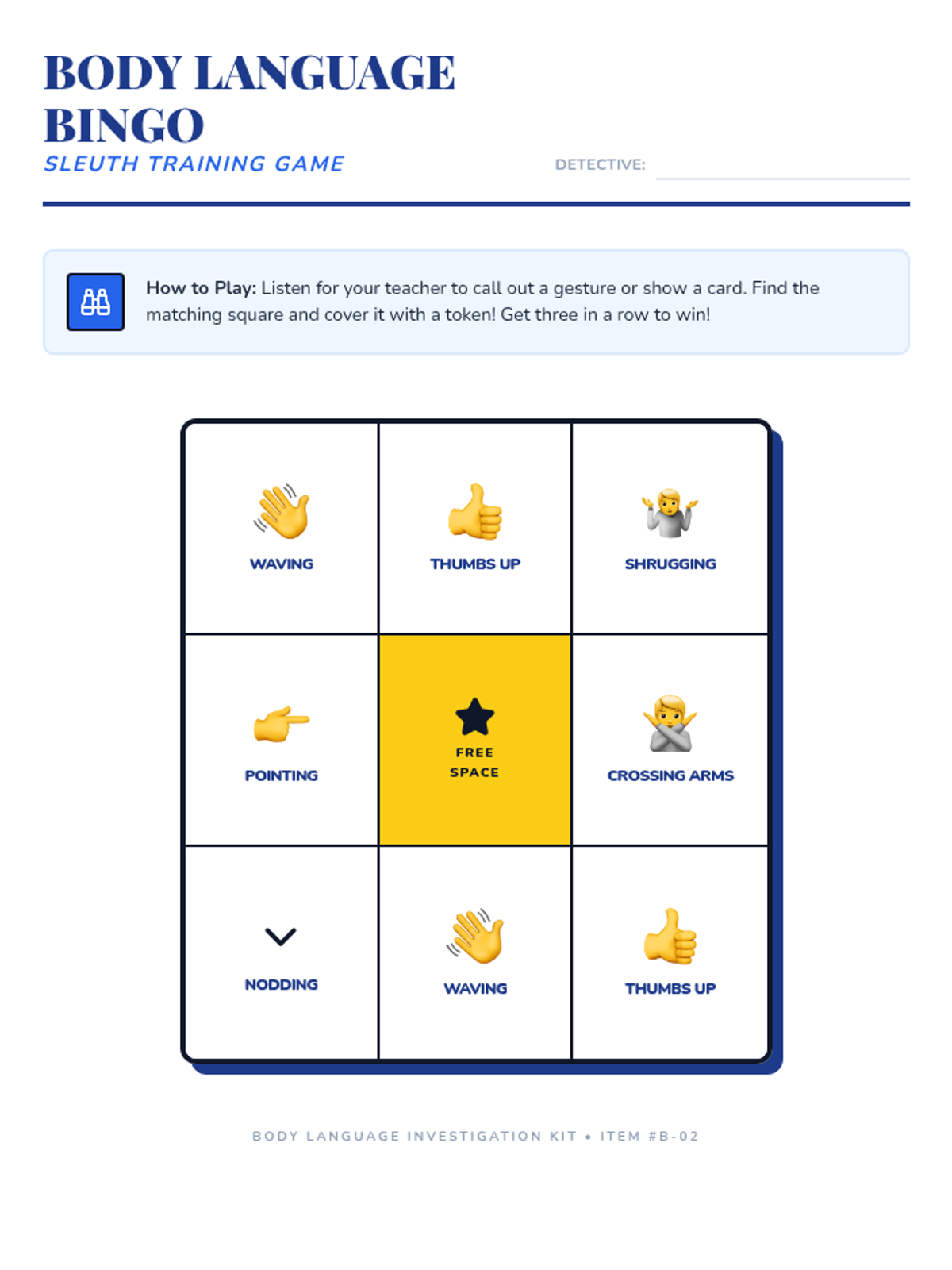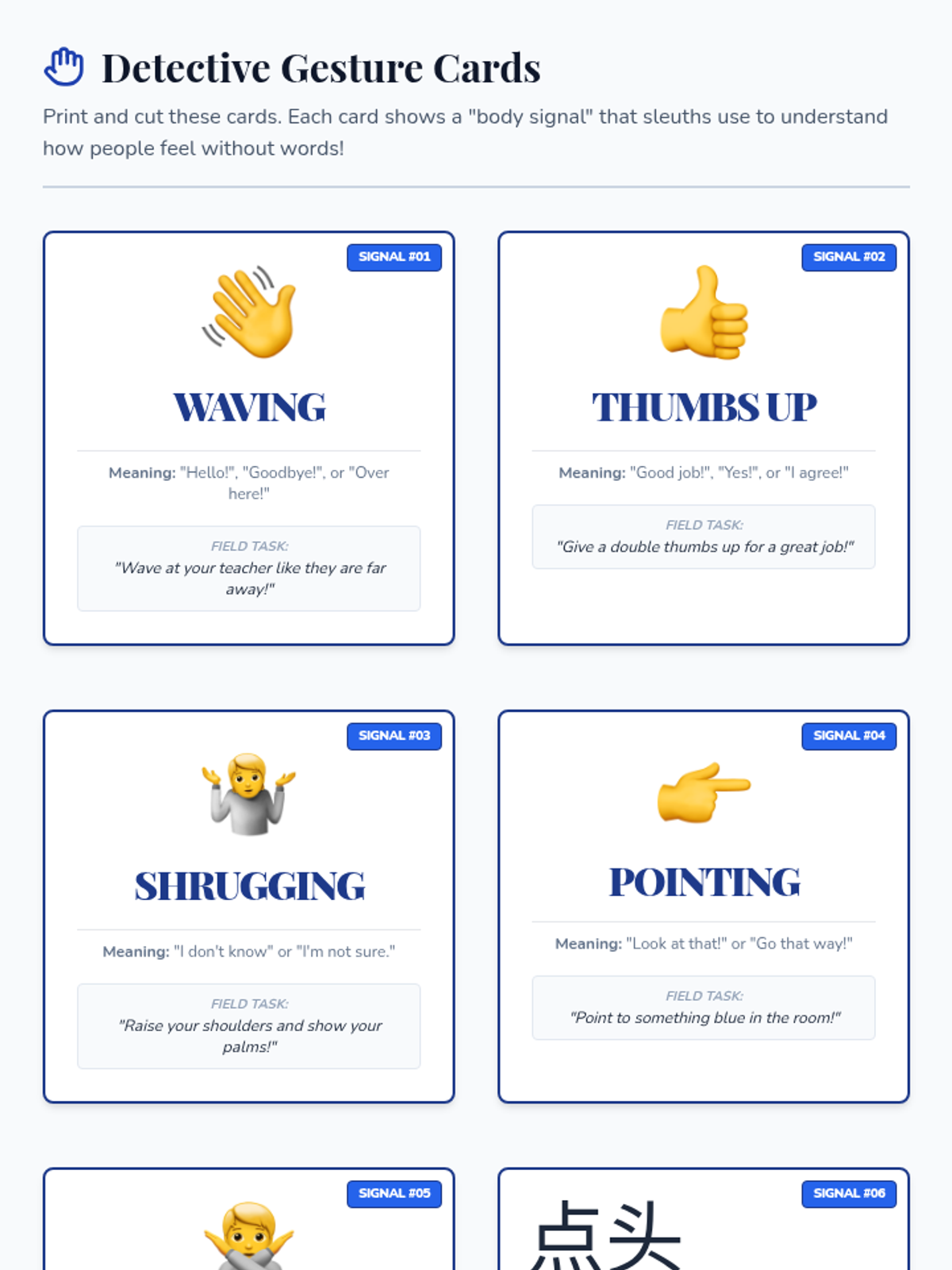 A 5-session sequence for K–2 students on IEPs to learn how to recognize and interpret facial expressions, gestures, and tone of voice through hands-on detective-themed activities.
