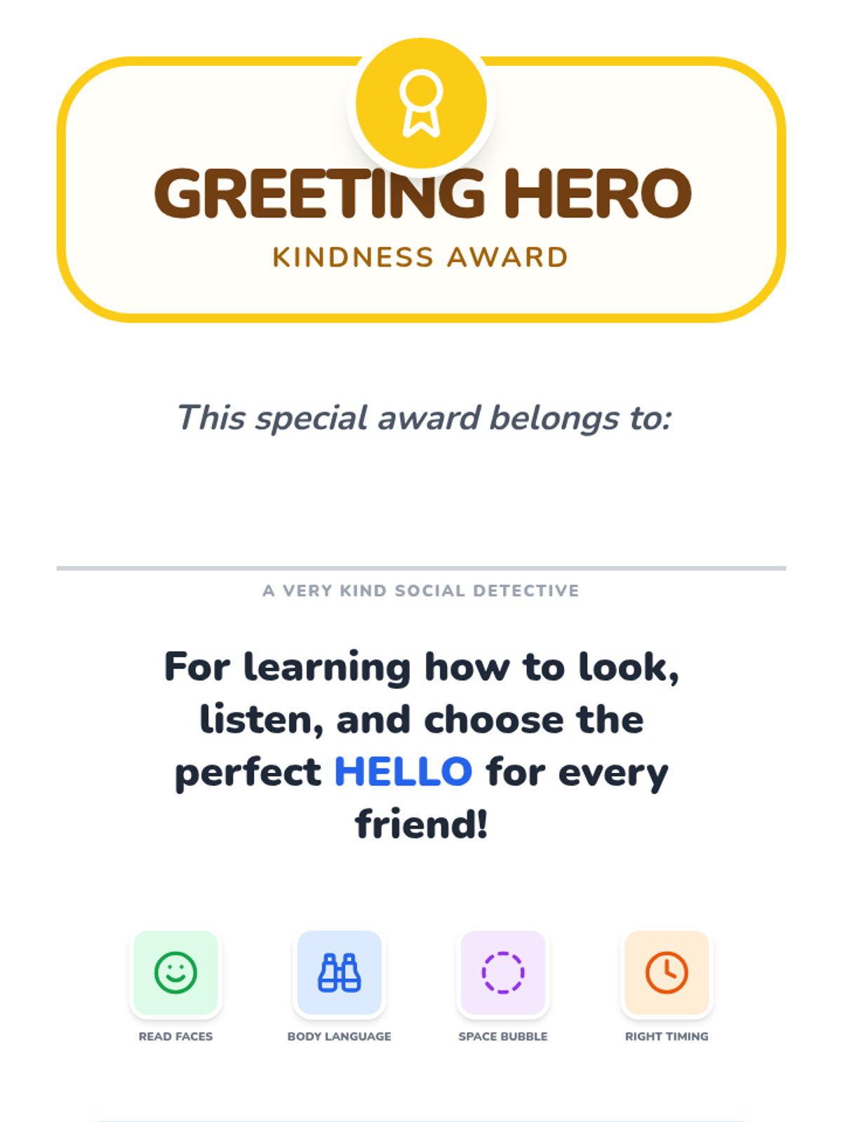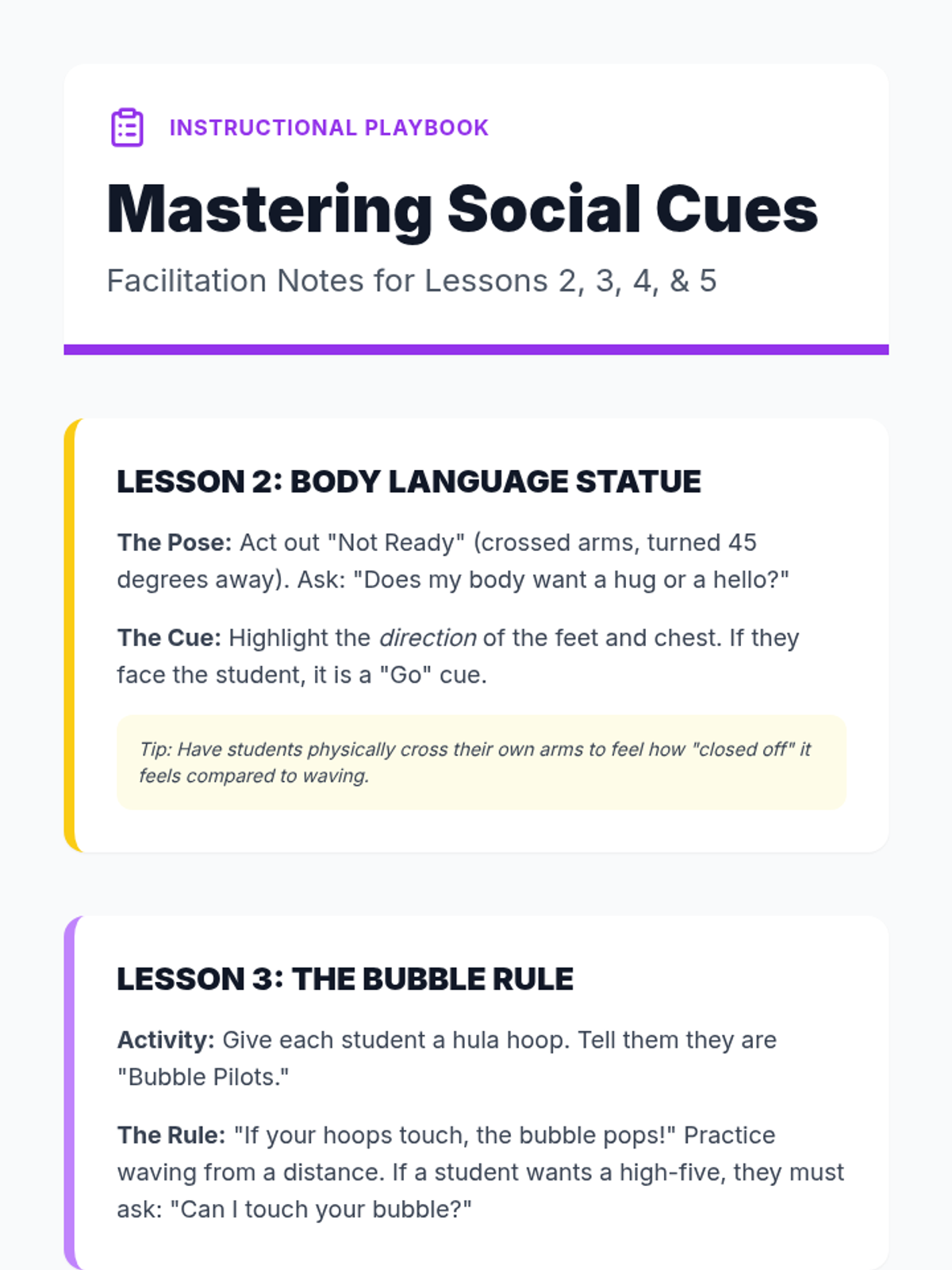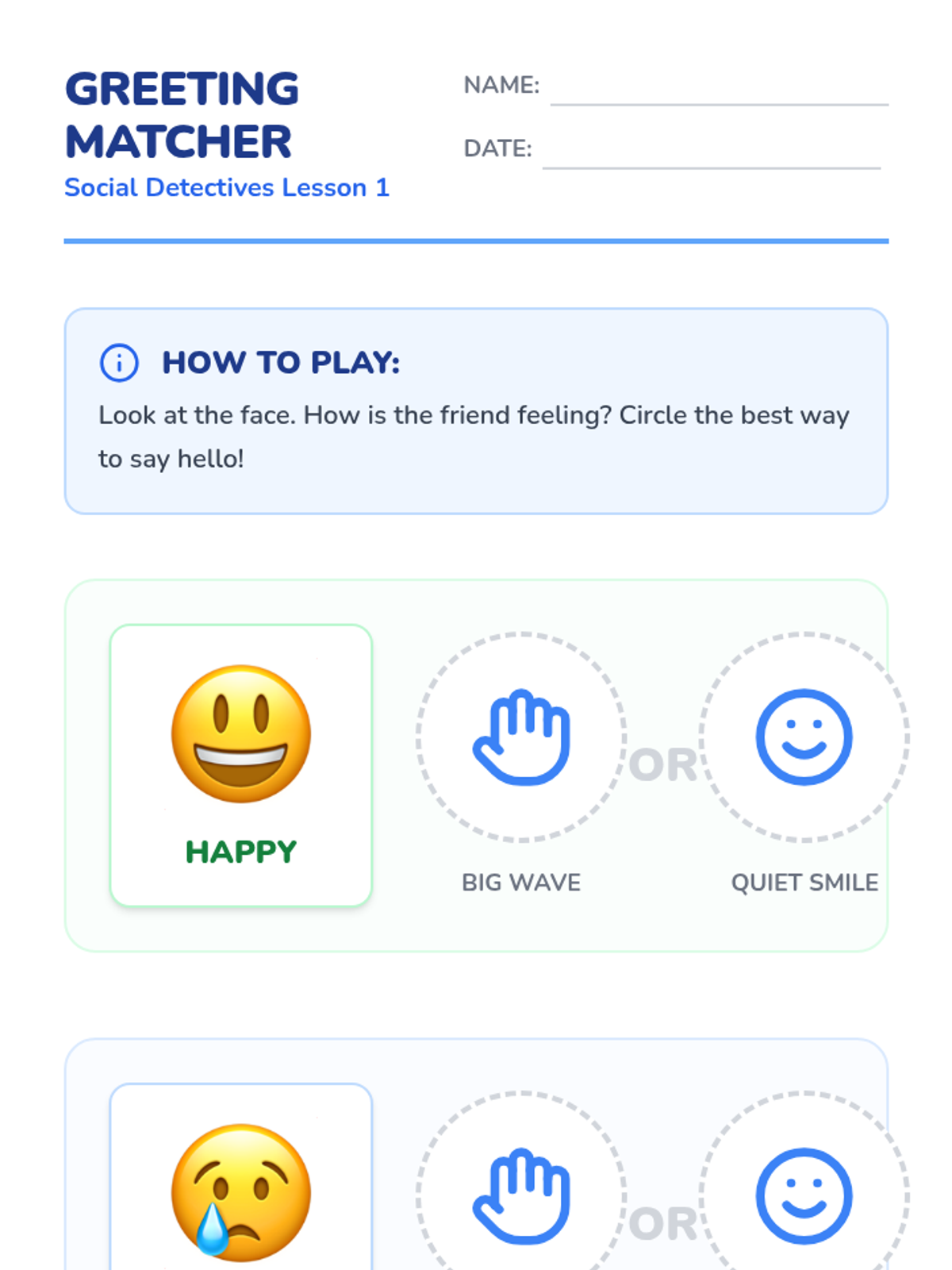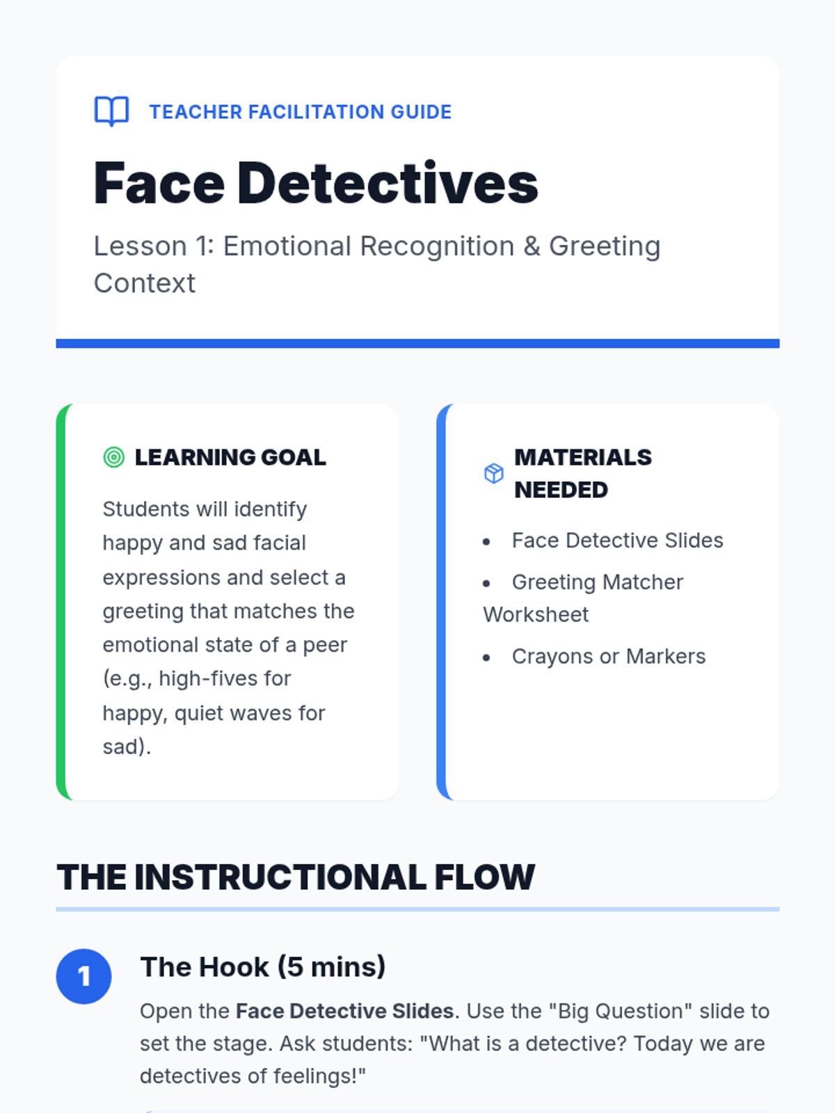 A Pre-K Social Communication sequence focused on interpreting social cues, emotions, and body language to choose context-appropriate greetings. Students learn to recognize happy and sad faces, interpret body posture, understand personal space, and time their greetings appropriately.