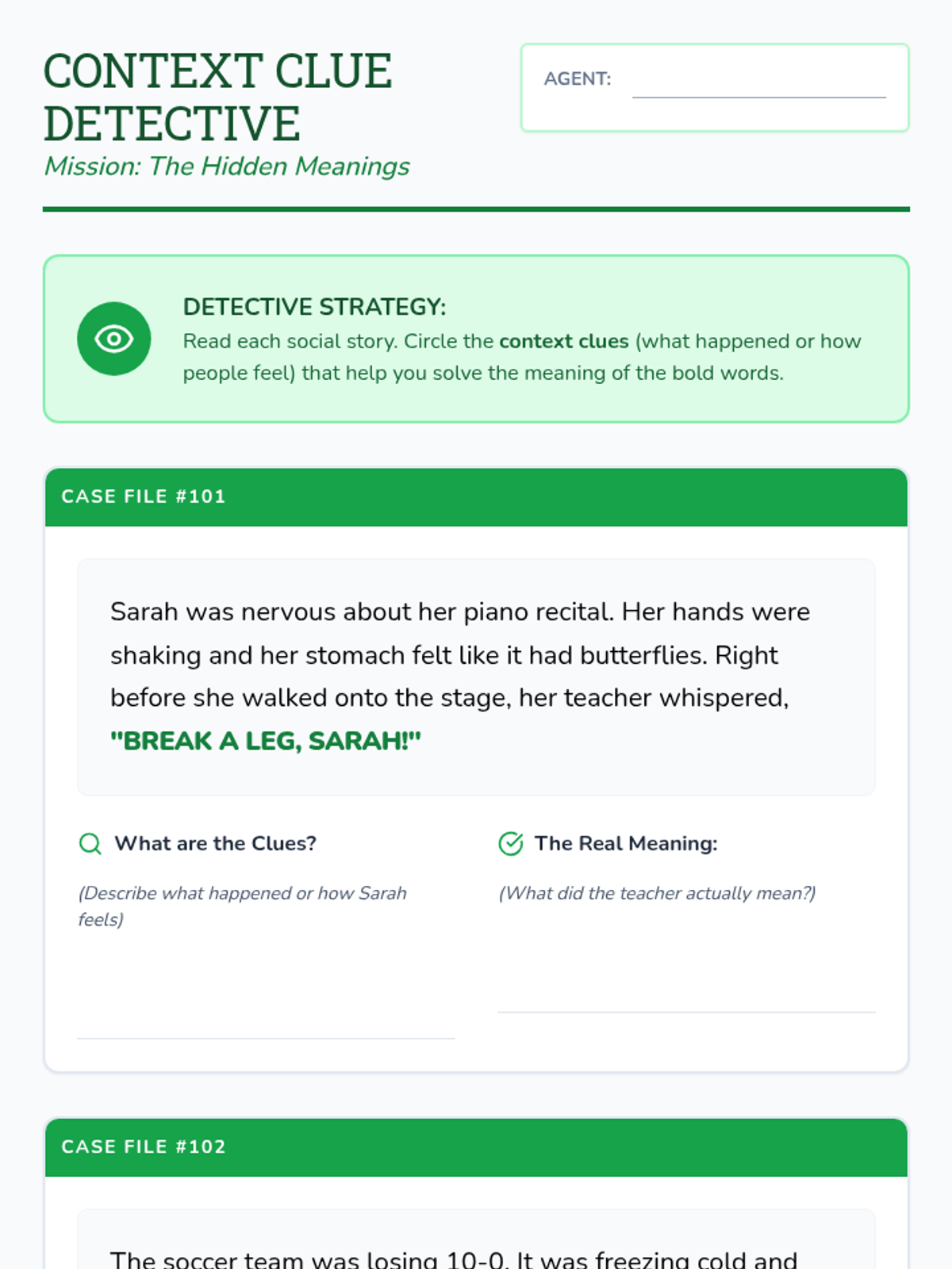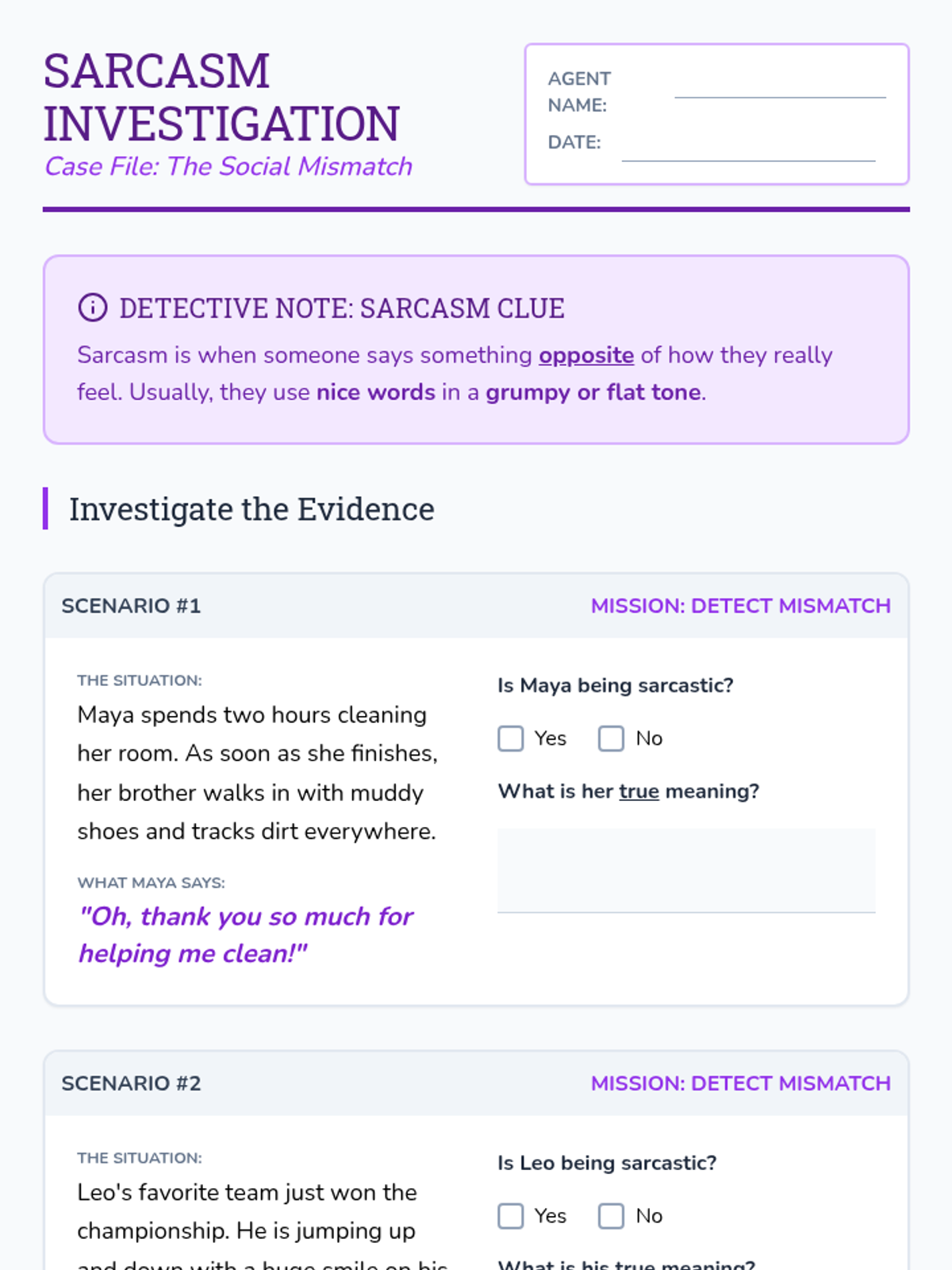 A 5-lesson sequence for 3rd-grade students focusing on social communication, specifically how tone of voice and context clues help infer meaning behind idioms, sarcasm, and hyperbole. Students act as 'Social Detectives' to uncover hidden meanings in everyday speech.