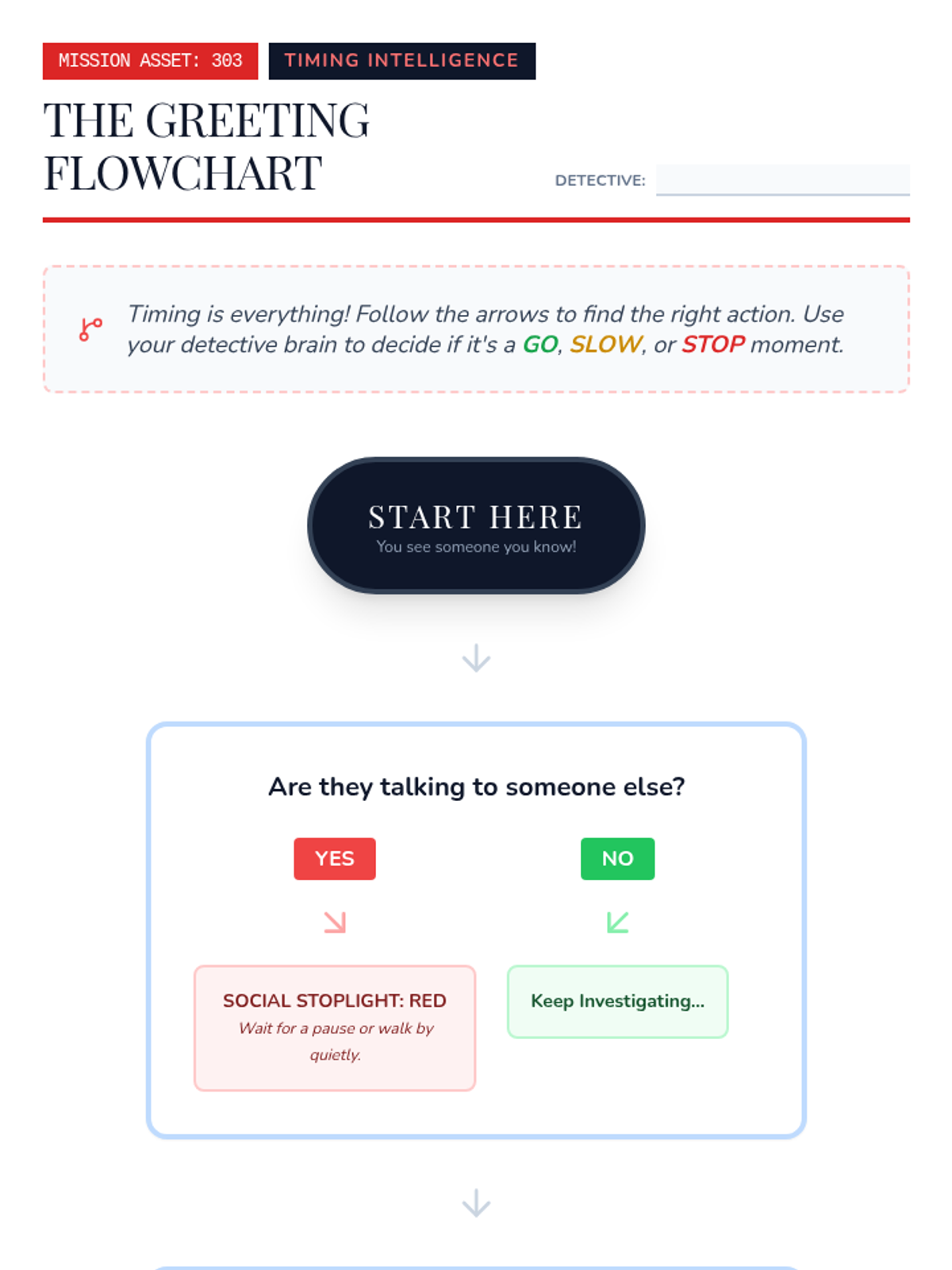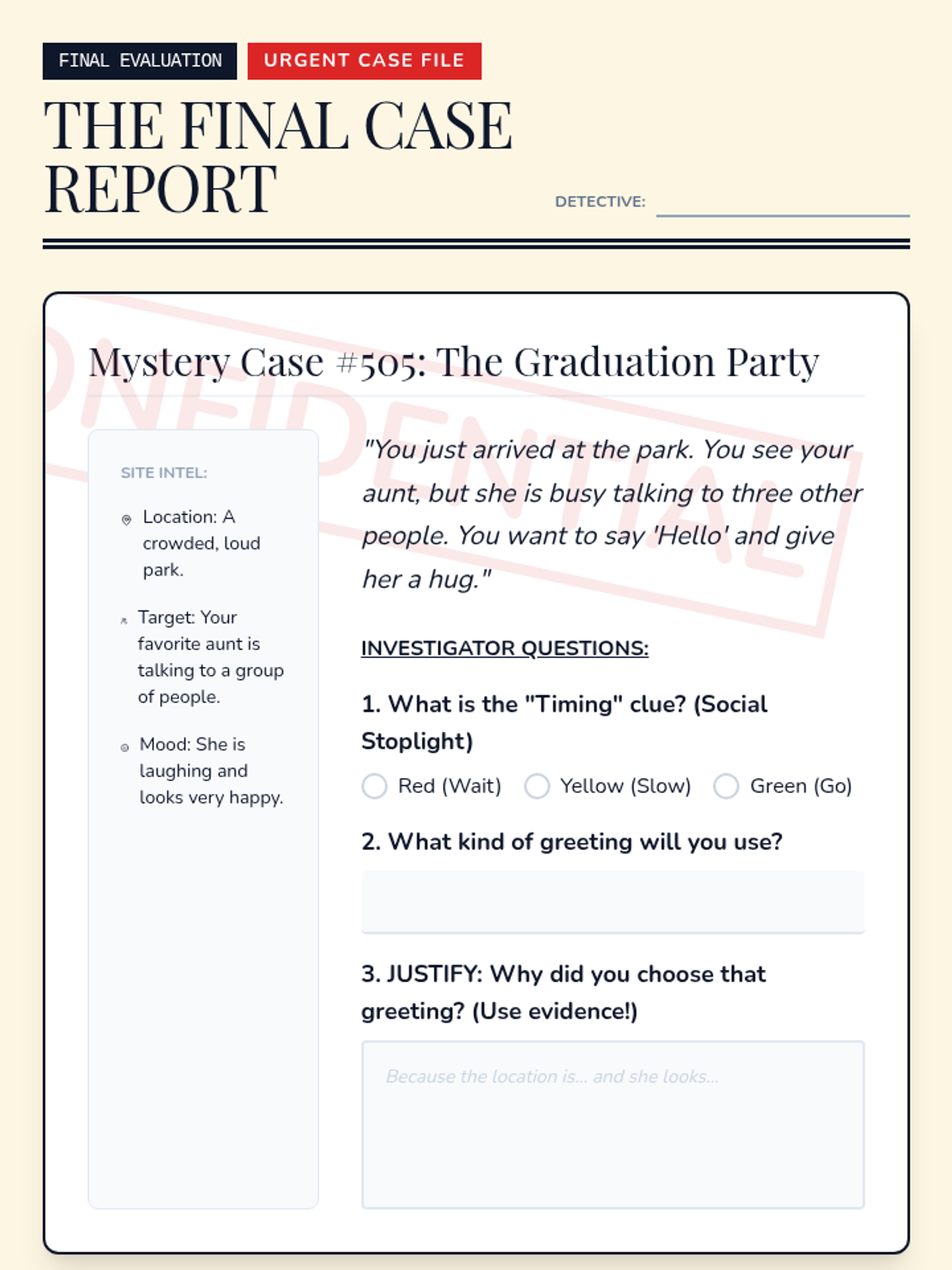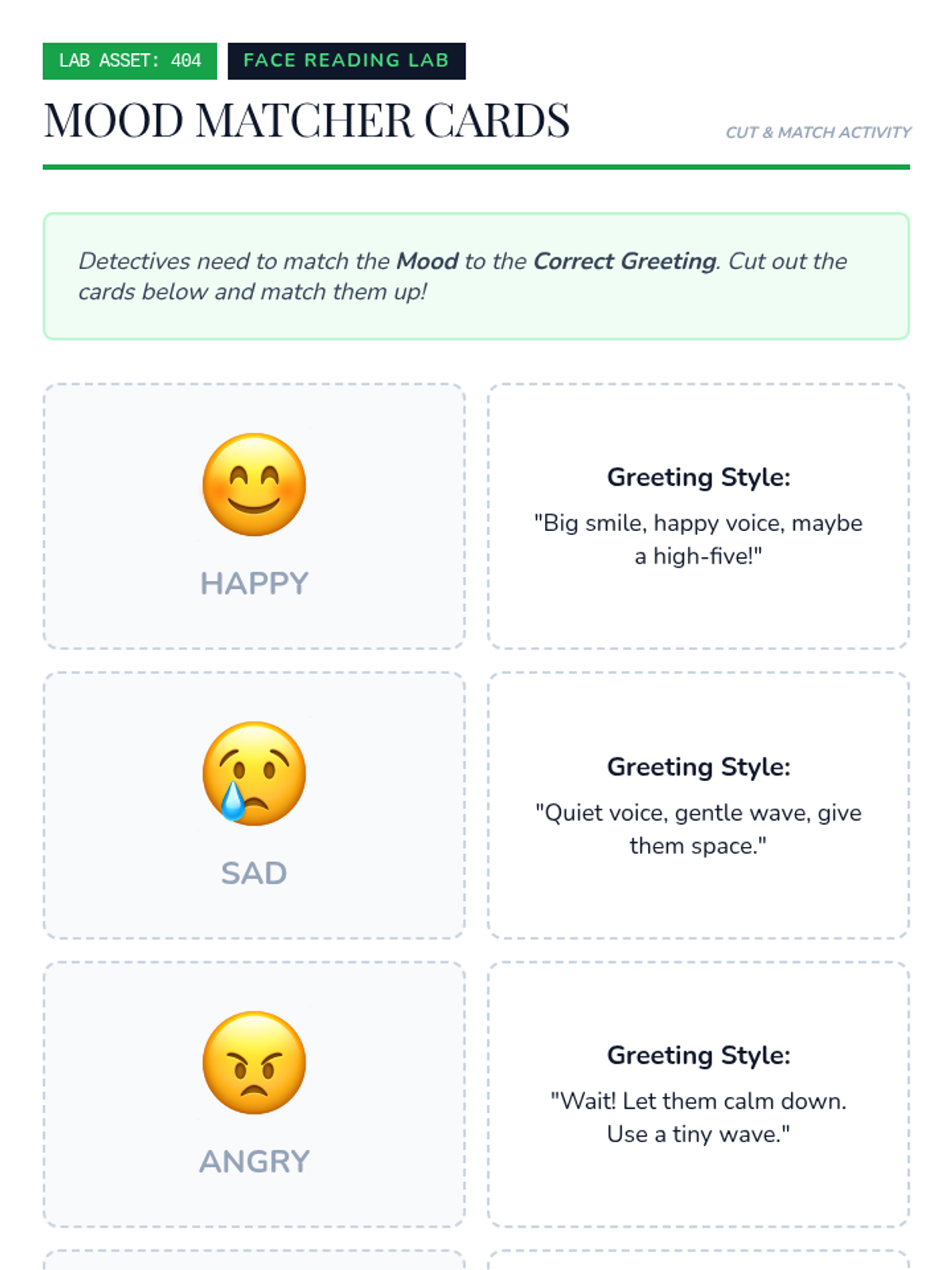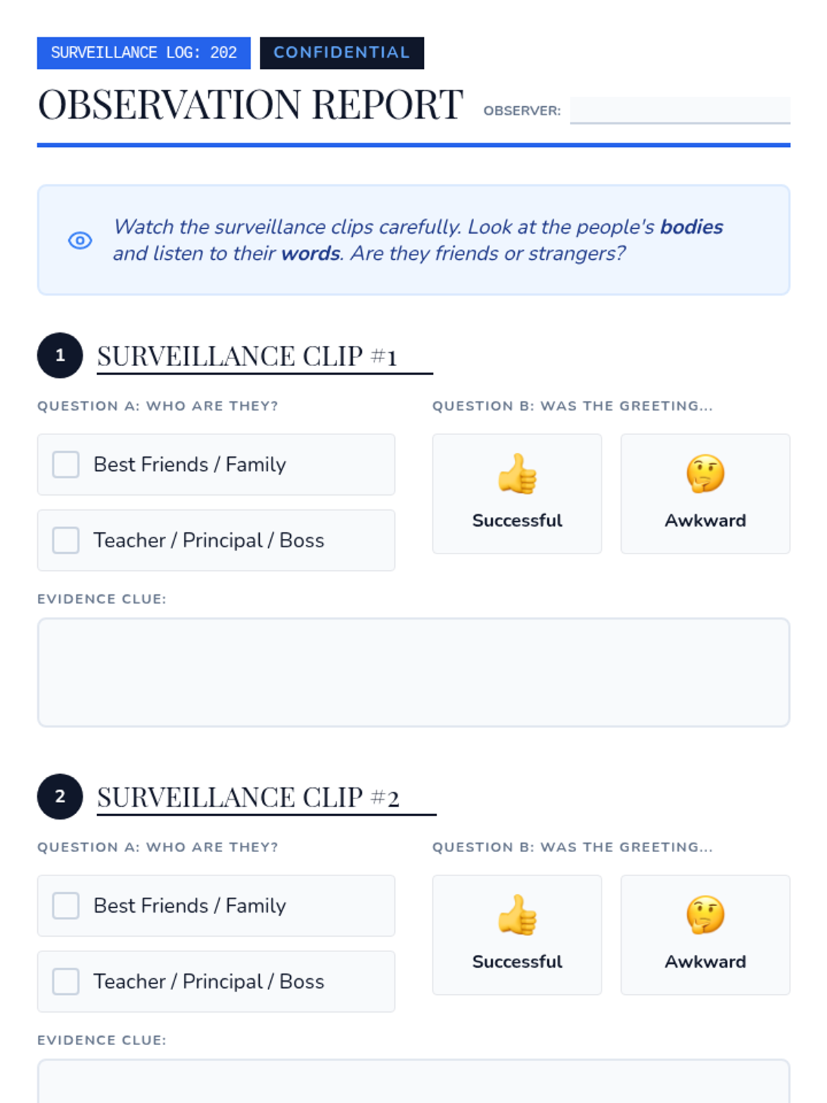 A 5-lesson sequence for 4th Grade students to develop social communication skills by analyzing context clues for greetings. Students act as 'Social Detectives' to investigate environmental markers, timing, and facial expressions to choose appropriate greetings.