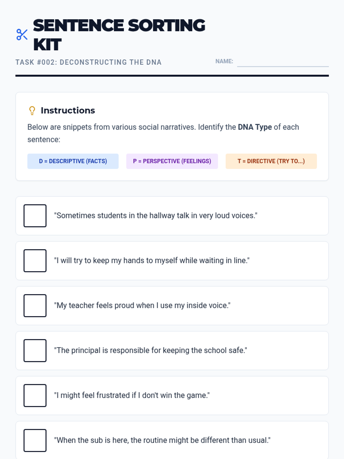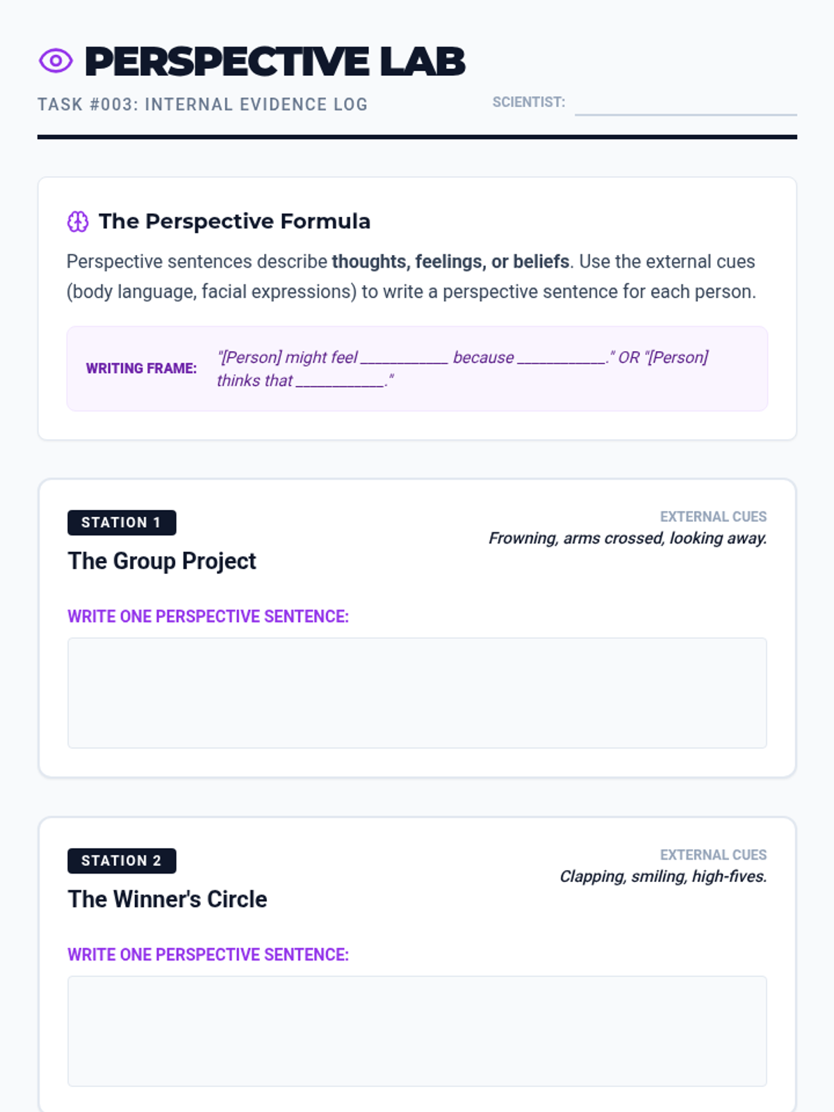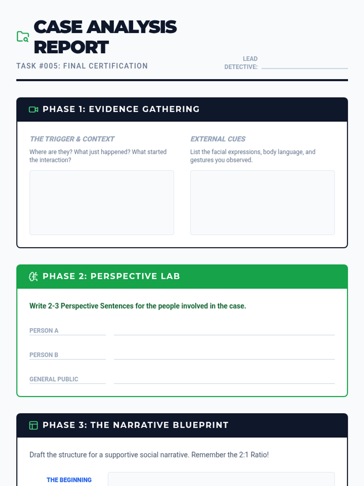 A comprehensive unit for middle school students to decode the 'hidden curriculum' of social interactions. Students learn to analyze, deconstruct, and critique social narratives using a 'Social Detective' framework, focusing on descriptive, perspective, and directive elements.