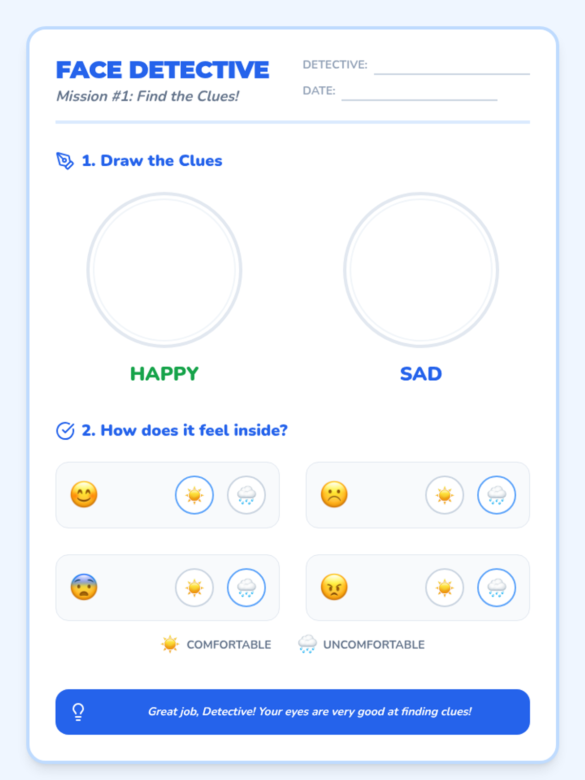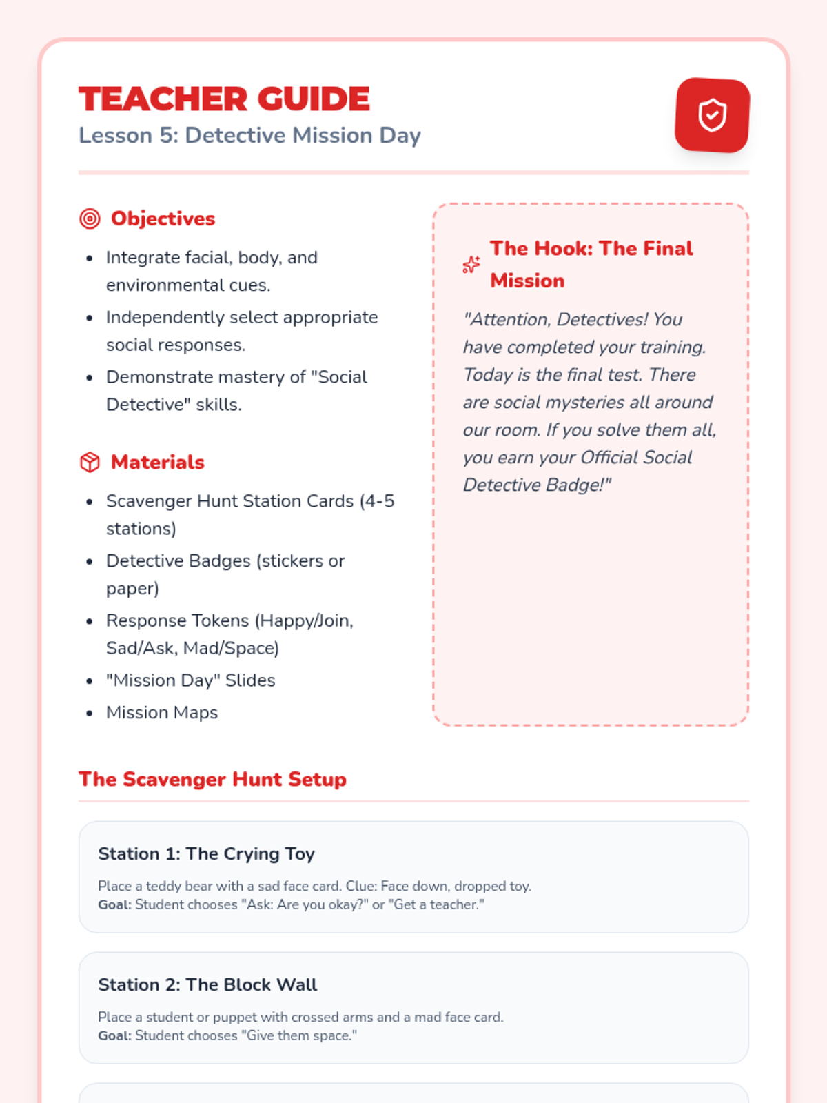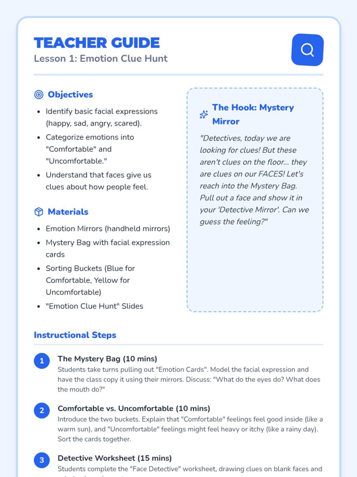 A Kindergarten sequence focused on Social Communication and Social Decision Evaluation. Students learn to recognize emotional cues (facial expressions and body language) and select appropriate social responses through a 'Social Detective' theme.