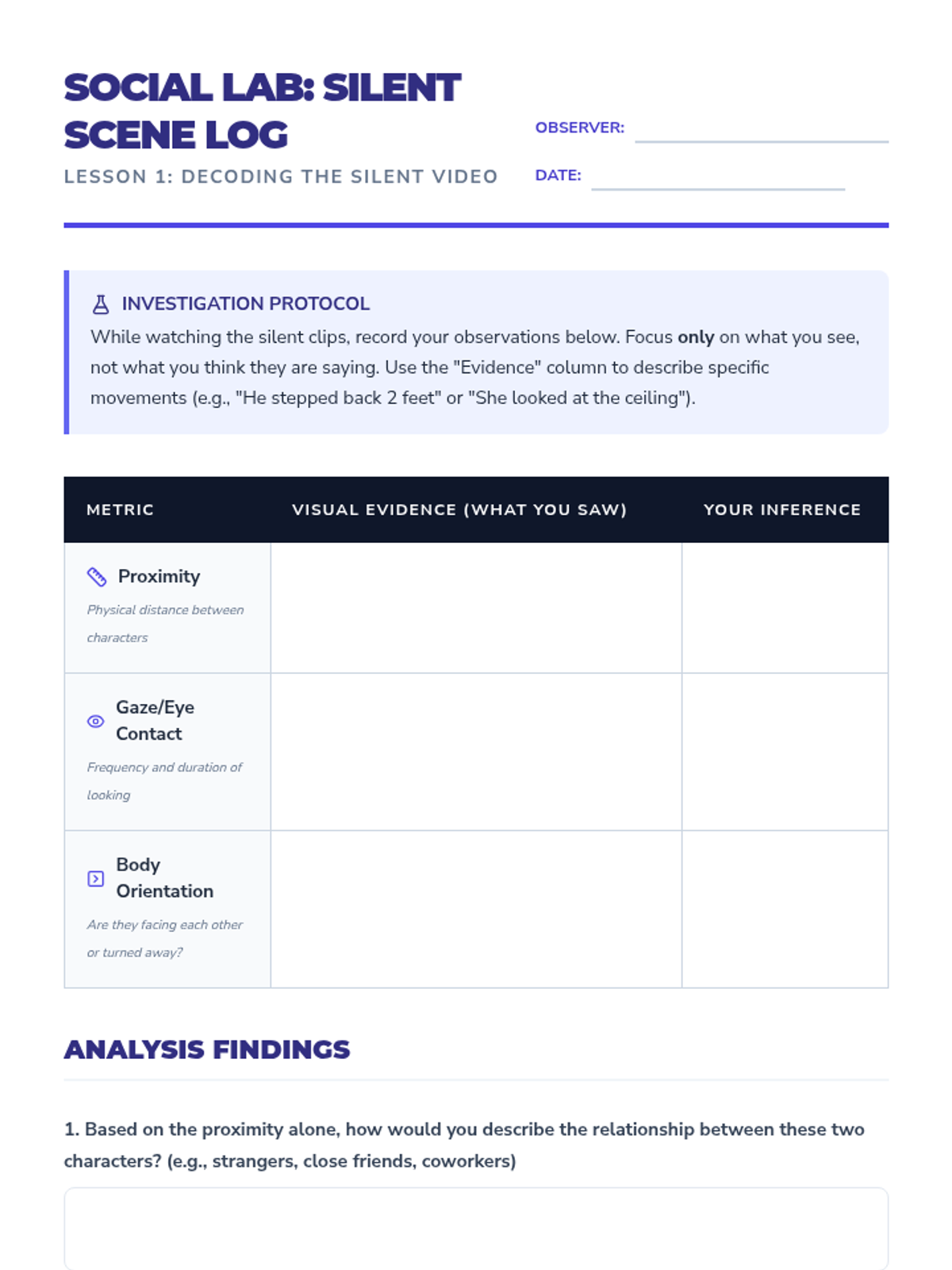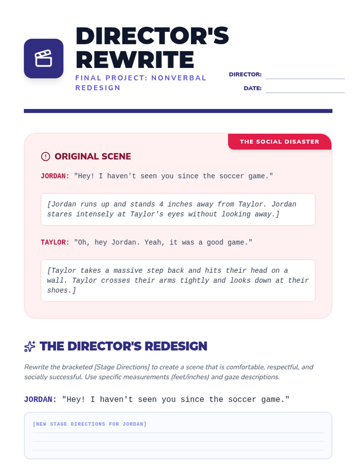A media-literacy focused sequence for 10th grade social communication, helping students decode eye contact and personal space through observation, analysis of social discomfort, and creative correction of social errors.