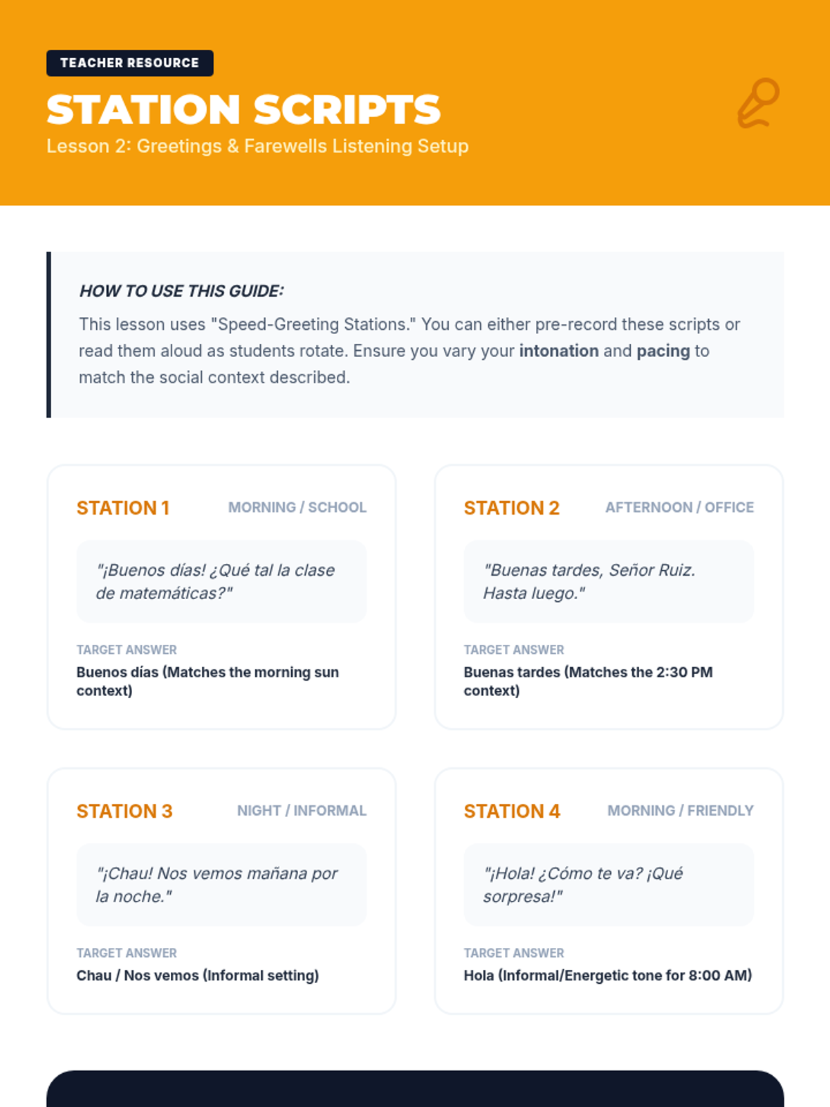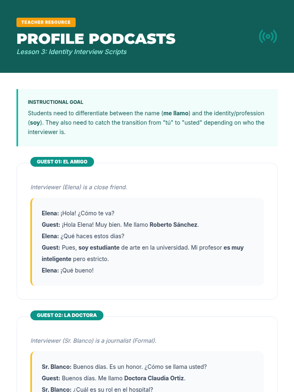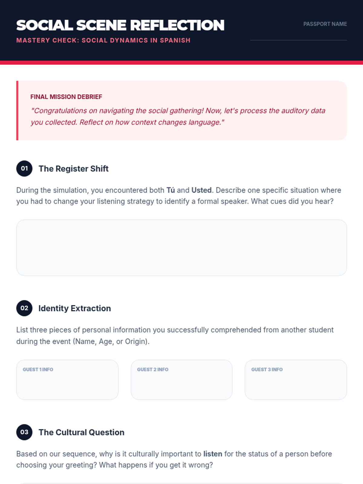A comprehensive immersion into Spanish greetings and introductions, focusing on the cultural nuances of formal and informal address through listening analysis and simulation.