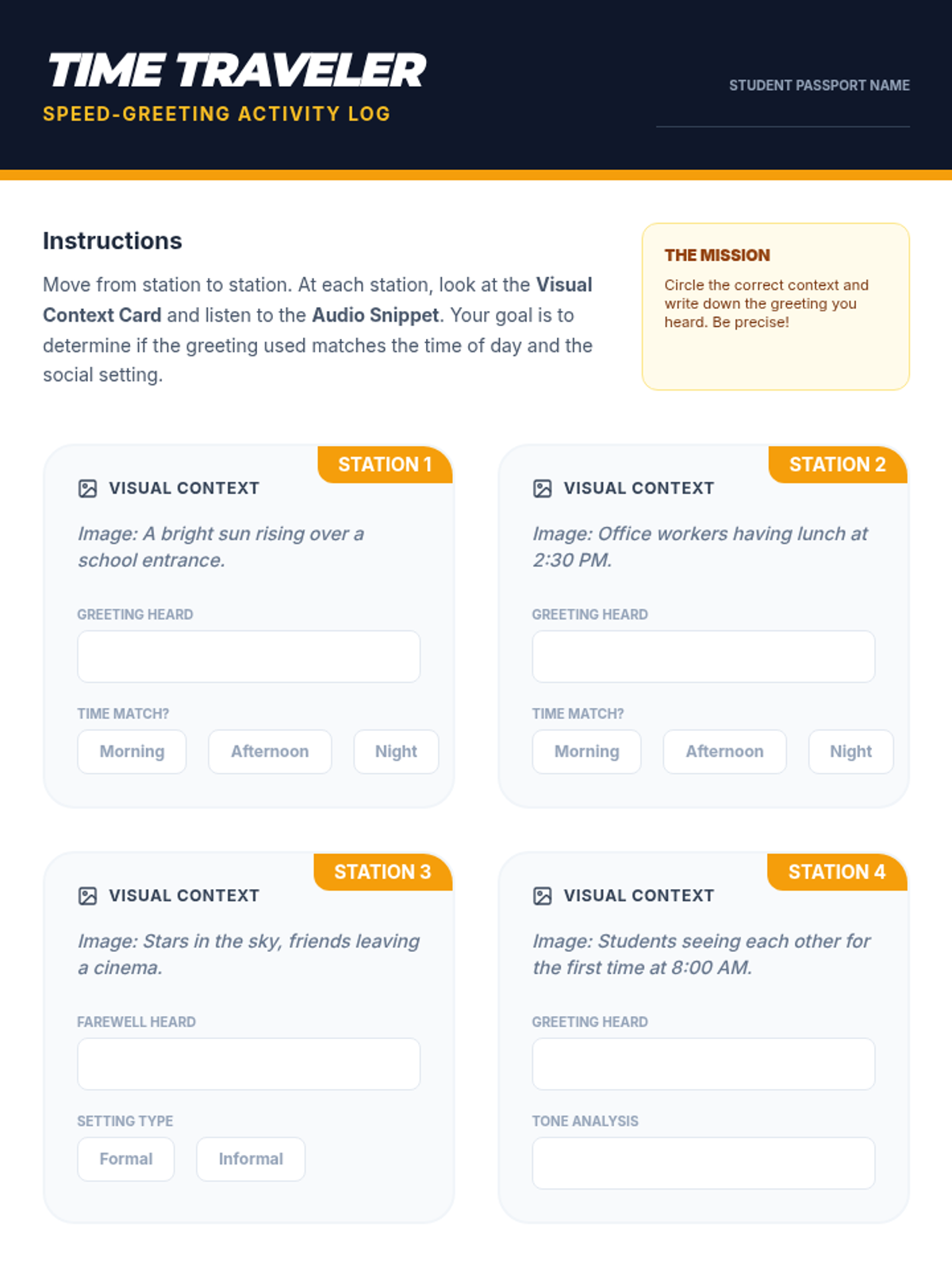 An immersive listening sequence designed for elementary-age beginner ESL students. This unit helps young learners navigate the routines, spaces, and social expectations of a primary school classroom, moving from basic imperative commands to understanding daily schedules and peer introductions.