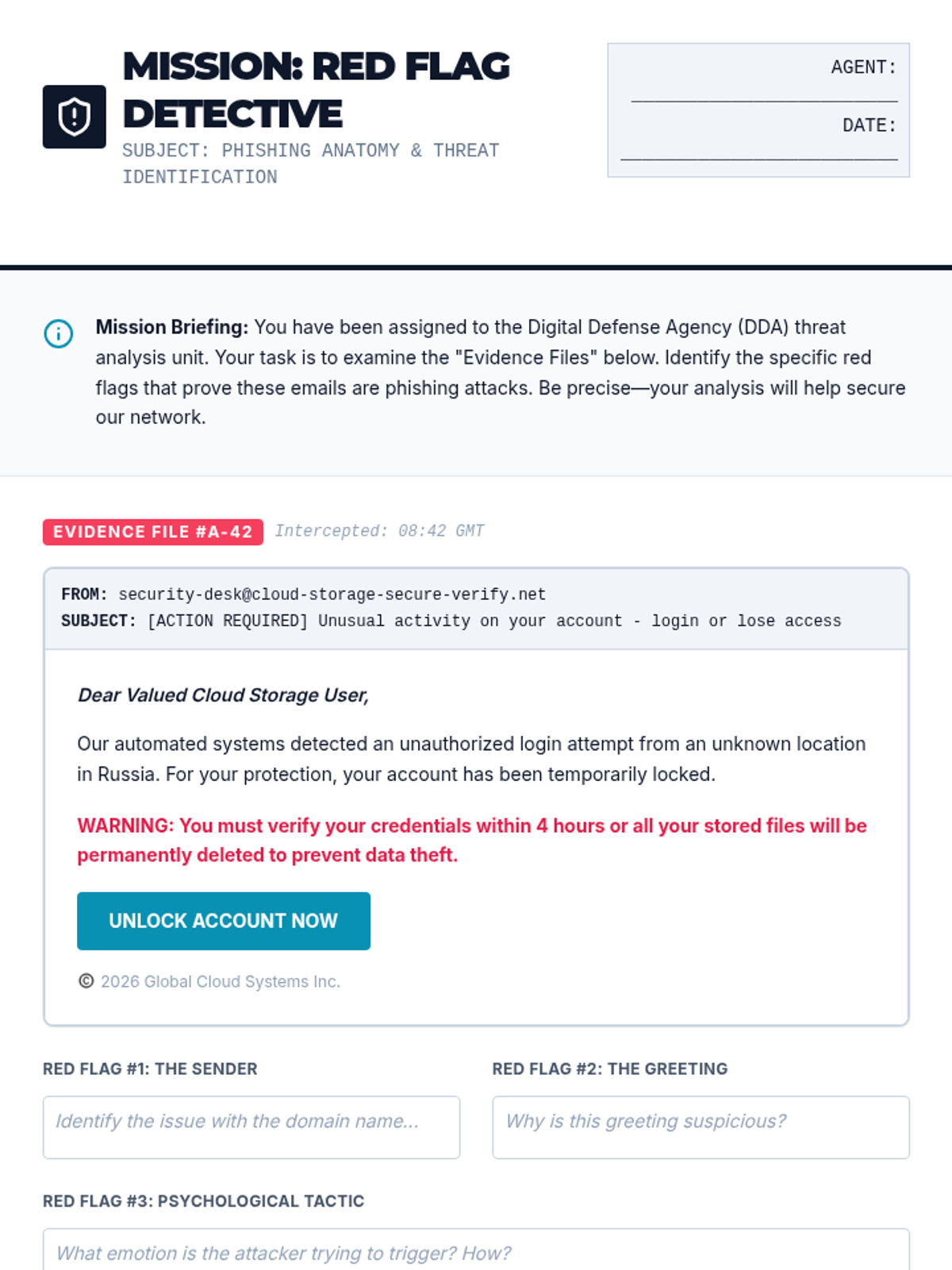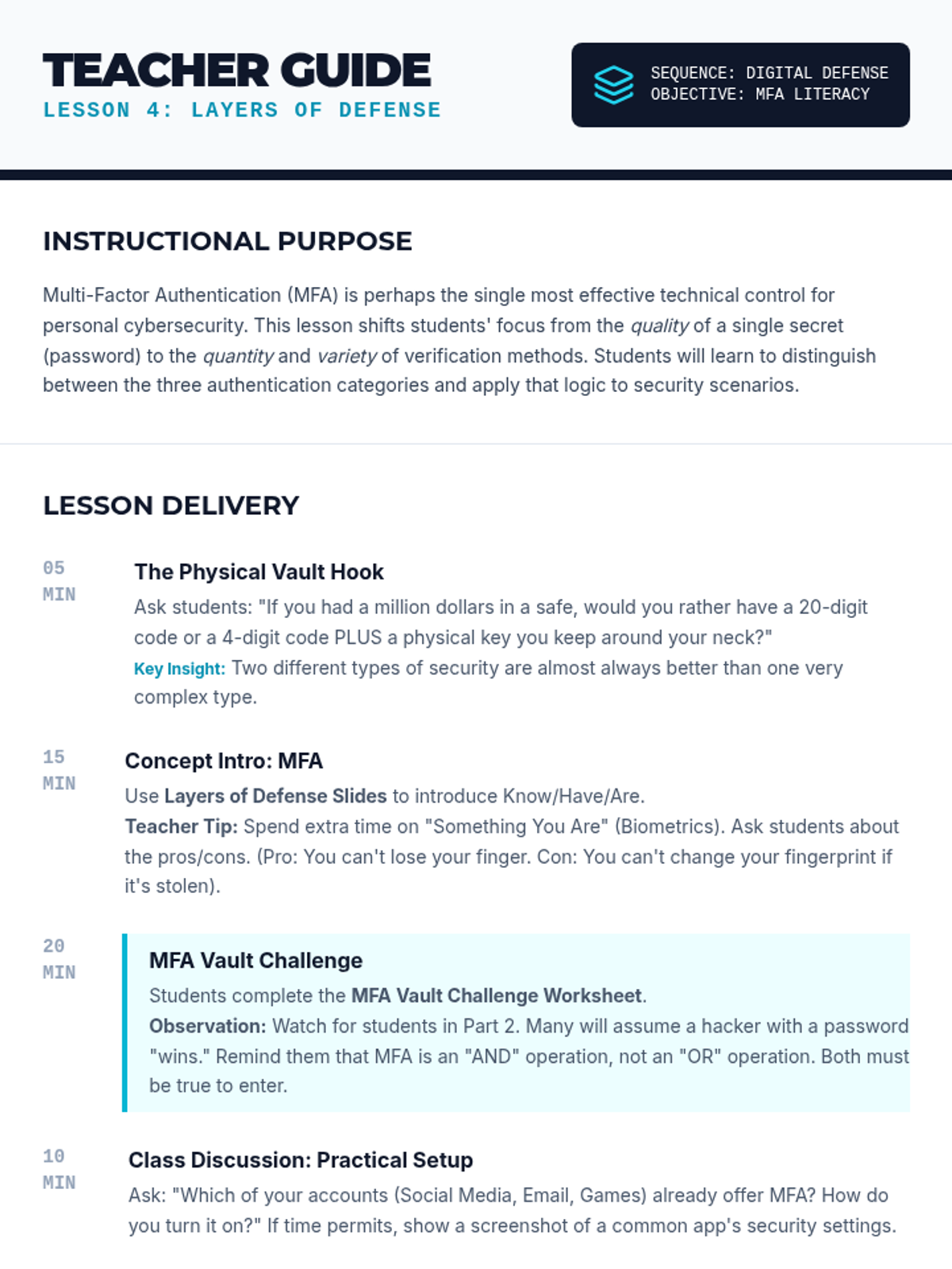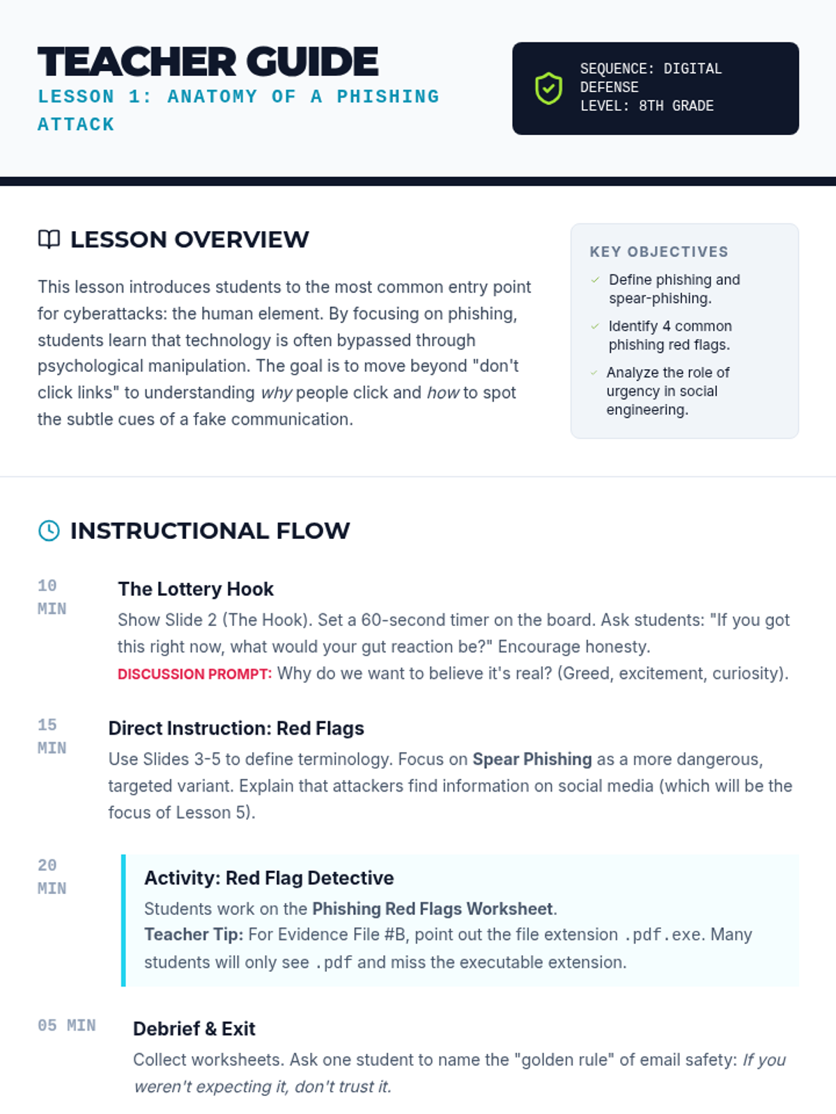 An 8th-grade cybersecurity unit focused on the human side of digital defense. Students investigate social engineering tactics like phishing and pretexting while building technical habits like password entropy and Multi-Factor Authentication to secure their digital lives.