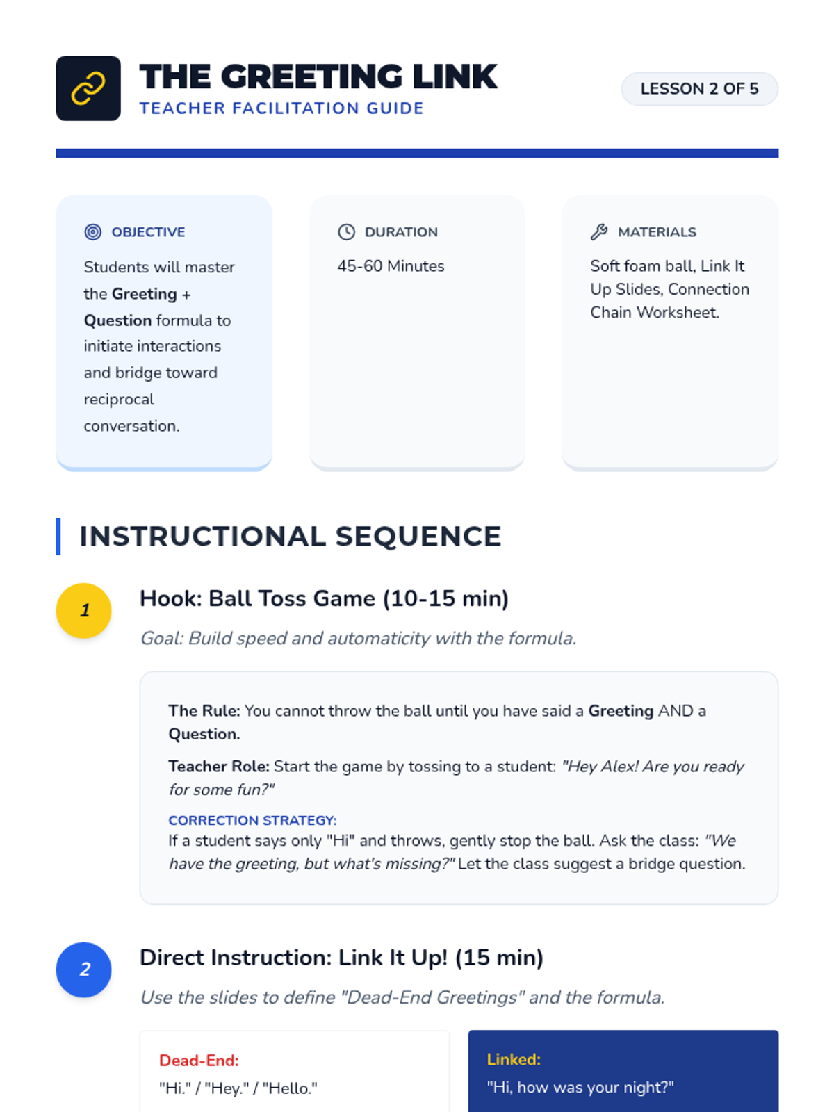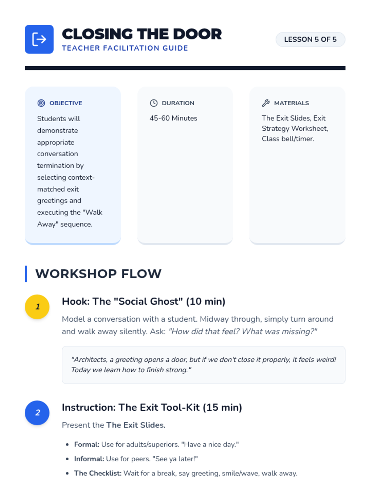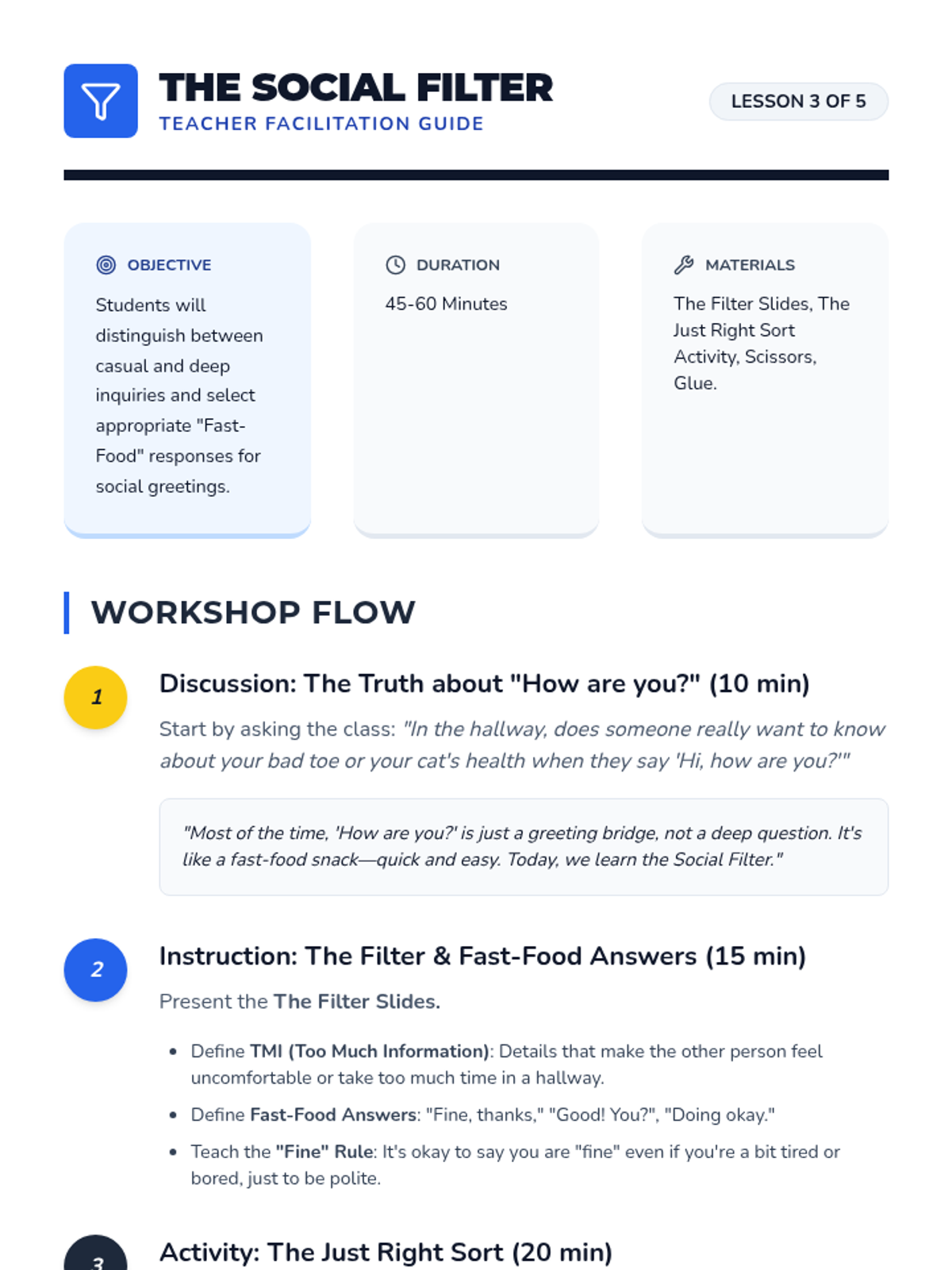 A 5th-grade social communication sequence focused on the nuances of starting and ending social interactions. Students learn to read social cues for timing, use greeting formulas, manage social filters, introduce themselves, and exit conversations politely.