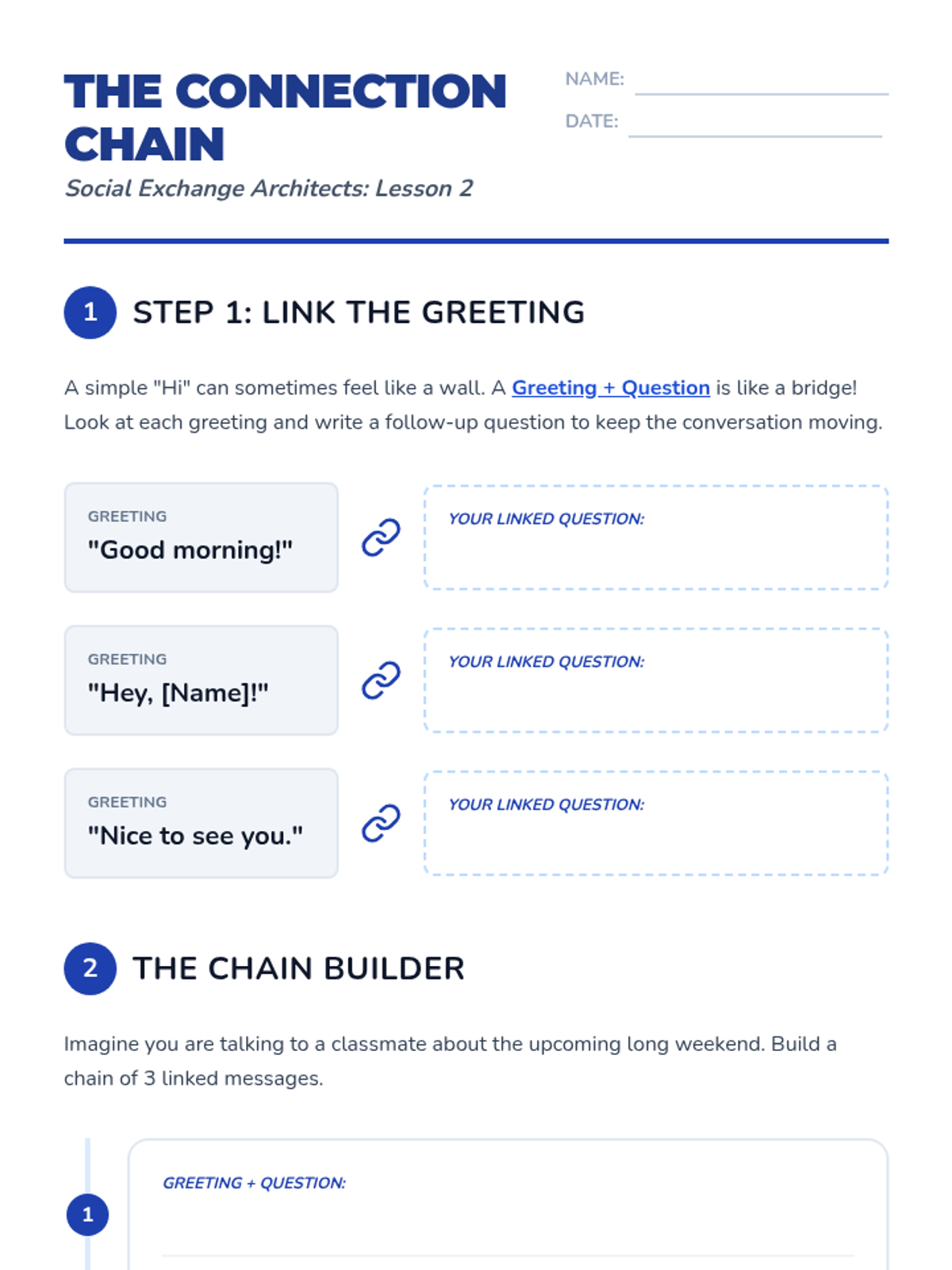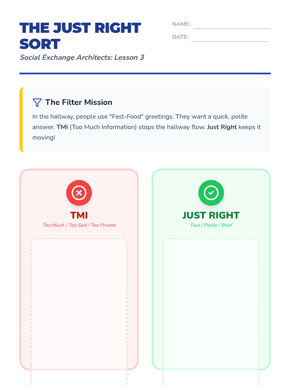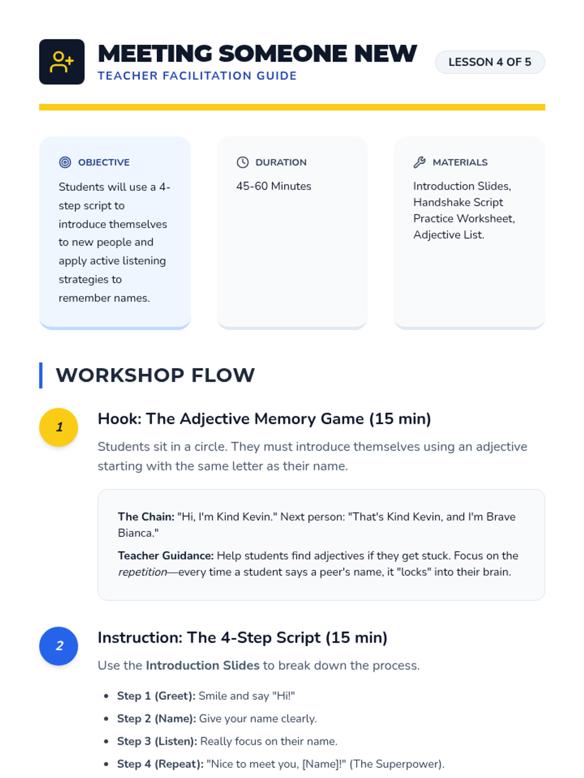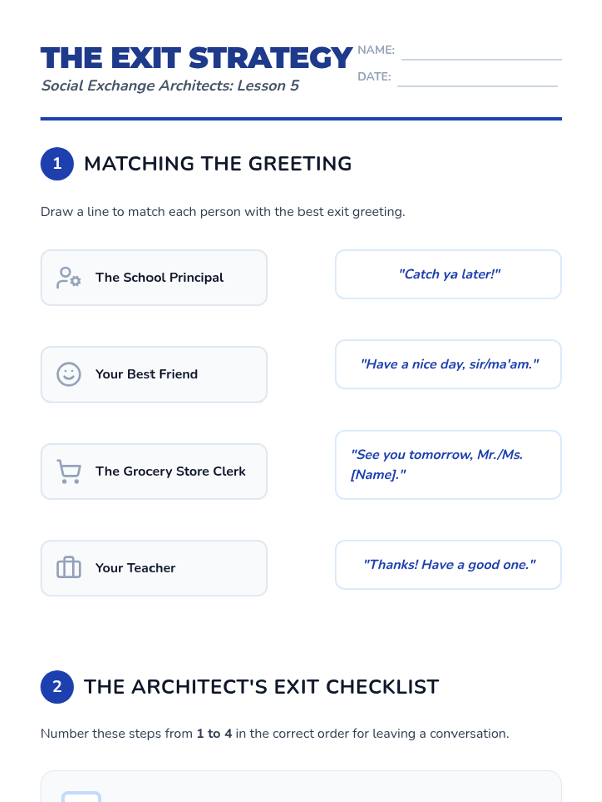 A 5th-grade social communication sequence focused on the nuances of starting and ending social interactions. Students learn to read social cues for timing, use greeting formulas, manage social filters, introduce themselves, and exit conversations politely.