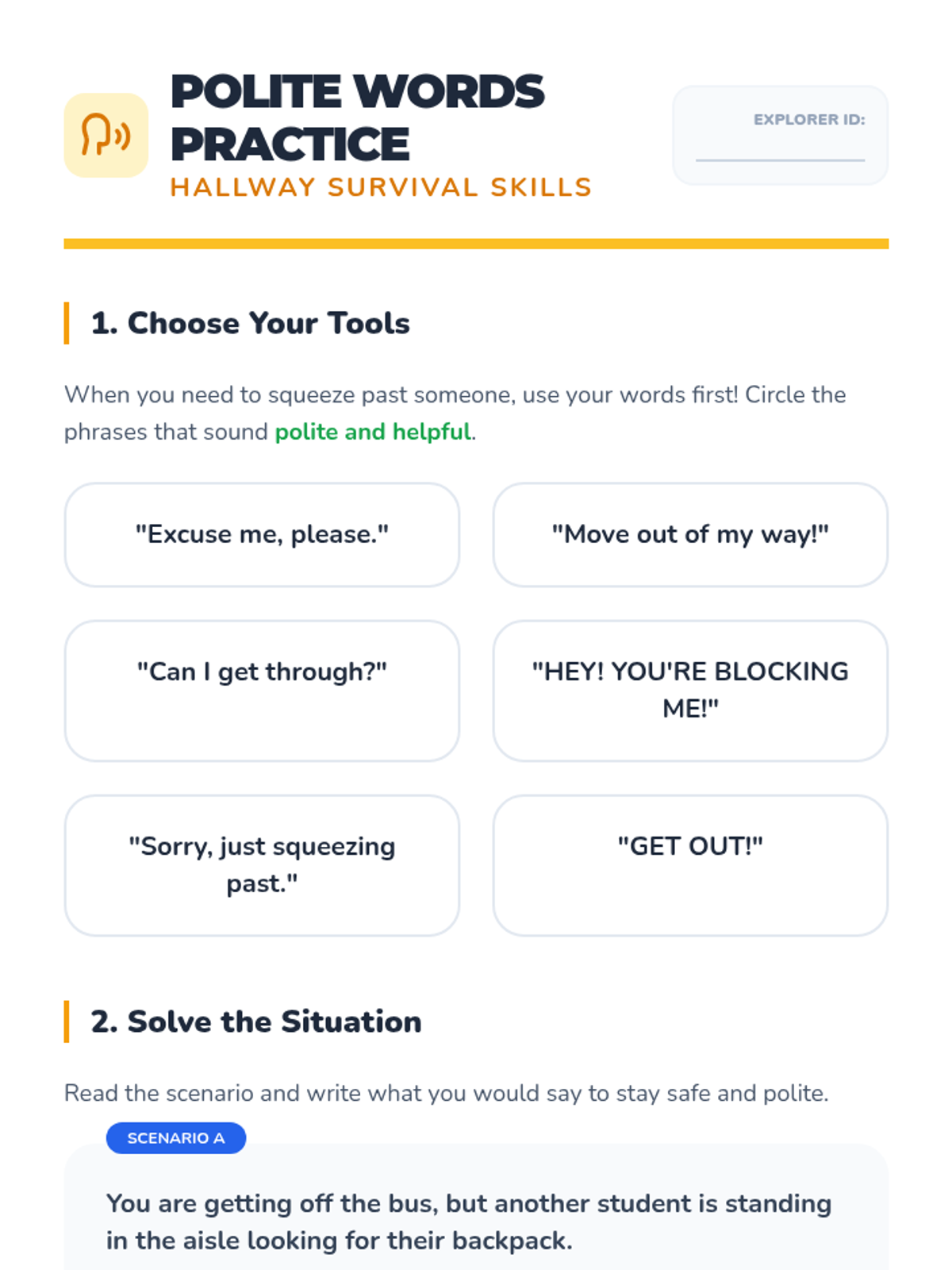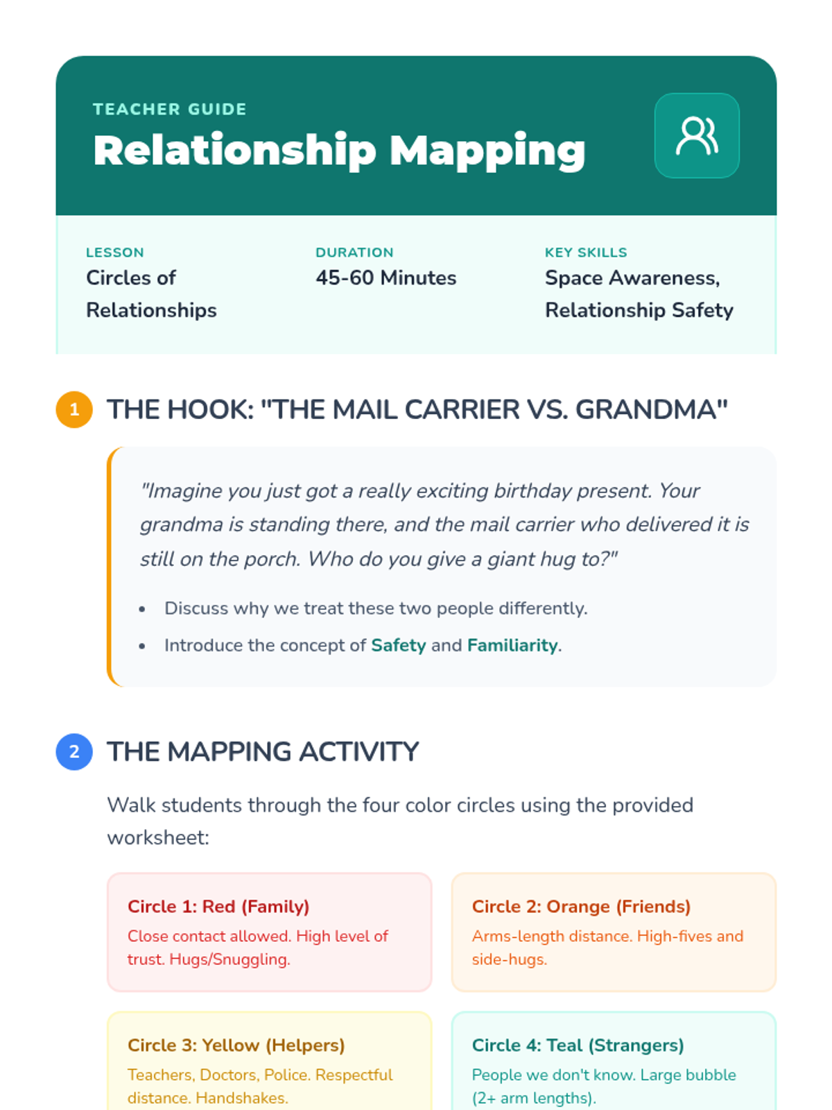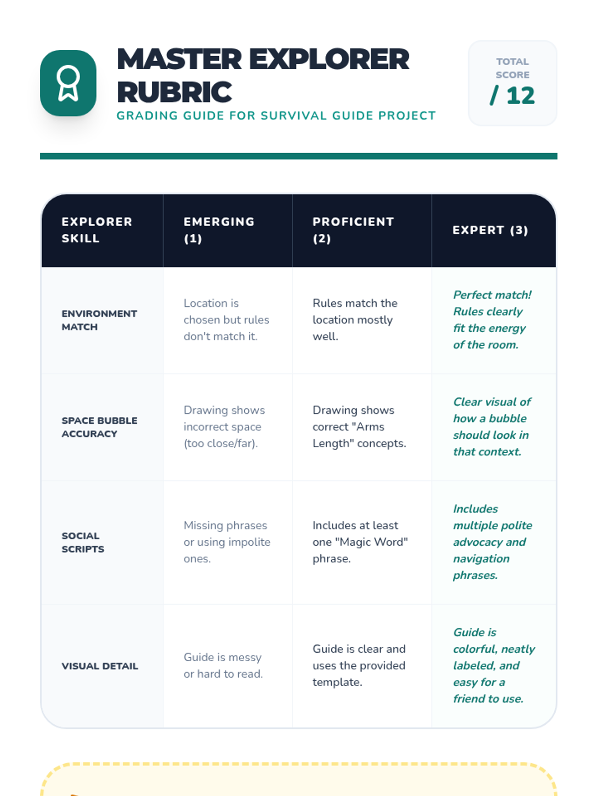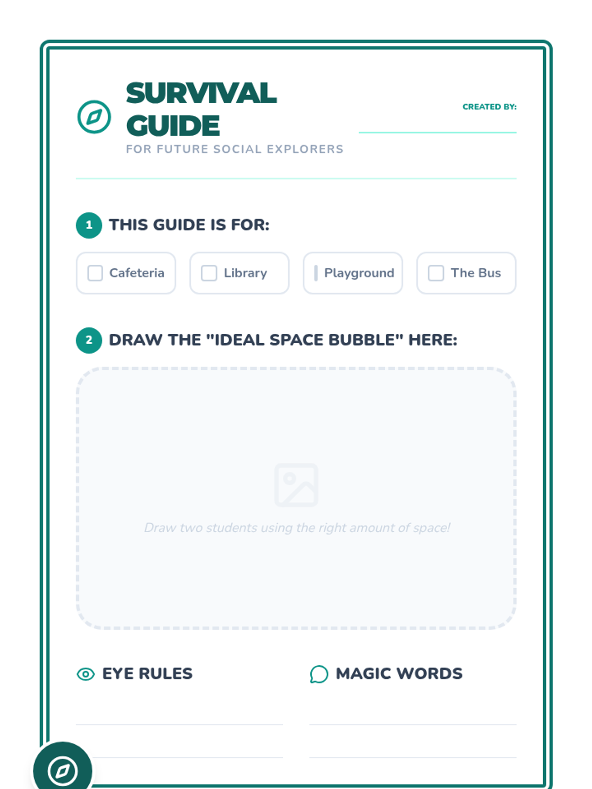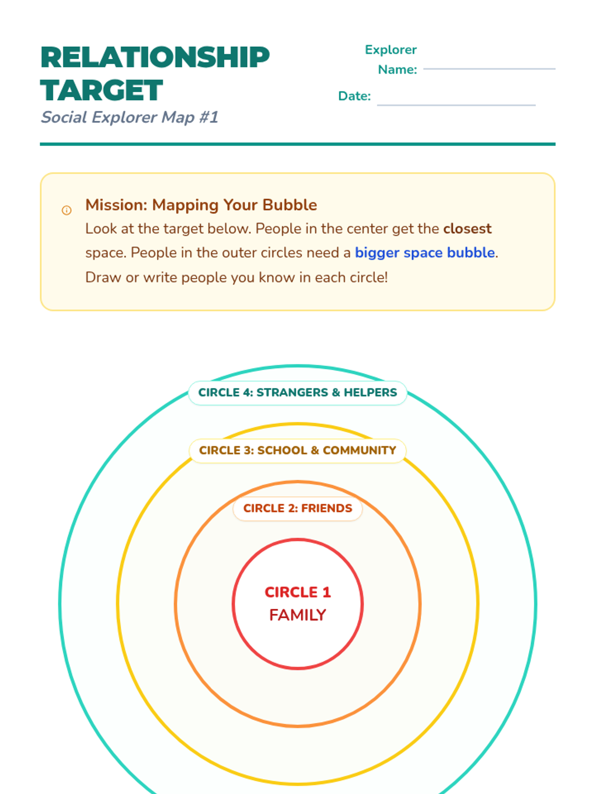 A 3rd-grade special education sequence focusing on social communication, eye contact, and personal space. Students learn to adapt their behaviors based on the relationship and environment, using the 'Circles of Communication' concept and creating a 'Social Explorer Field Guide'.