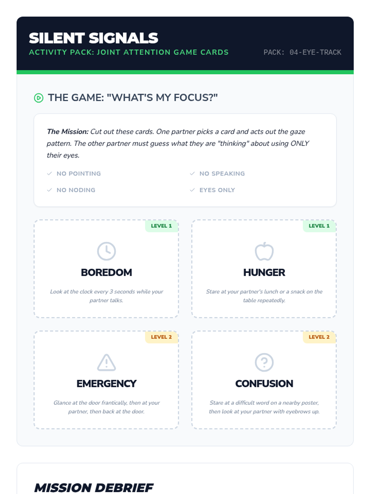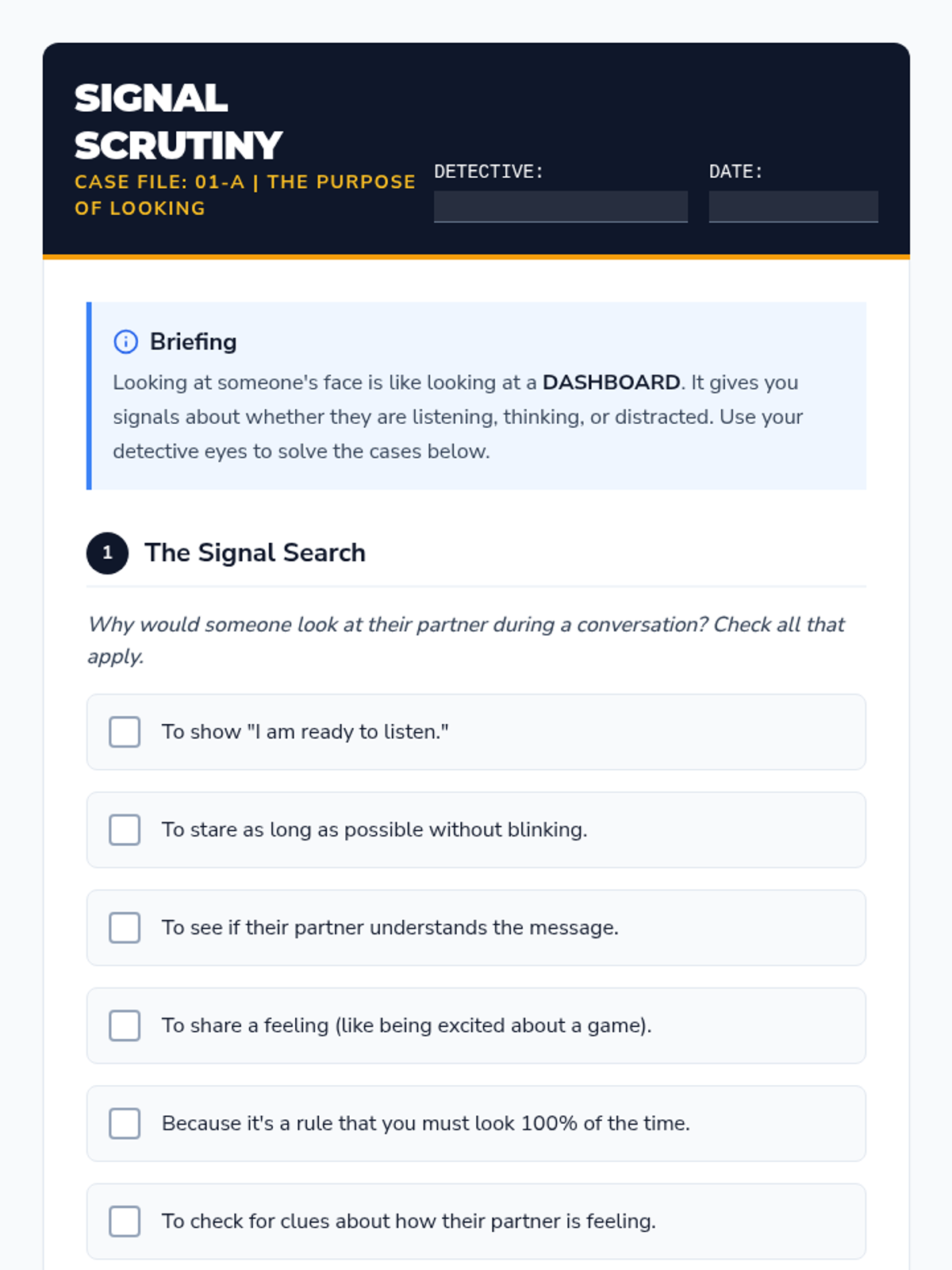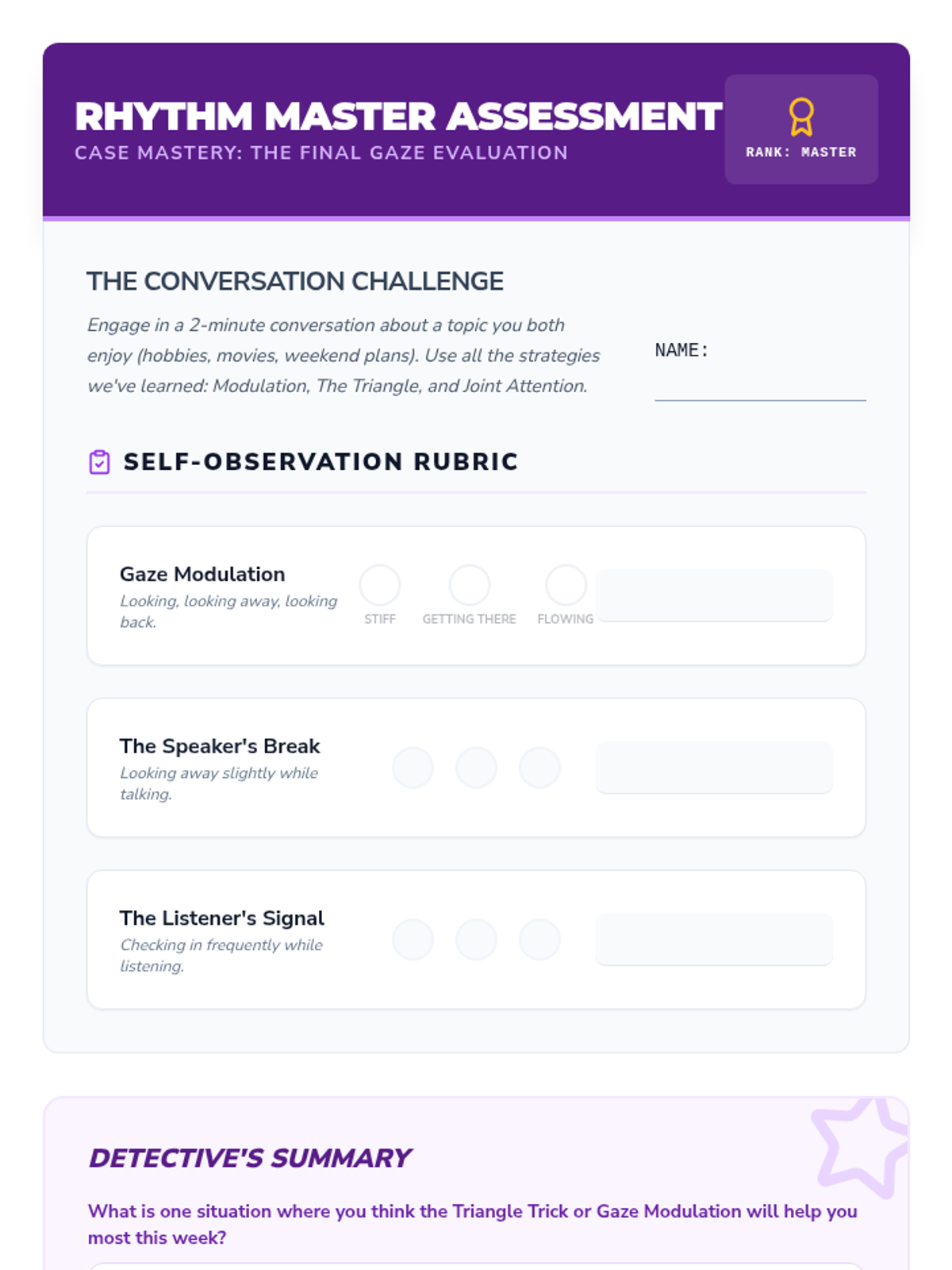This sequence helps middle school students navigate the complexities of social gaze, moving from basic eye contact to nuanced concepts like gaze modulation, the triangle technique, and joint attention. Students develop practical strategies to show attention and engagement without feeling overwhelmed or making others uncomfortable.