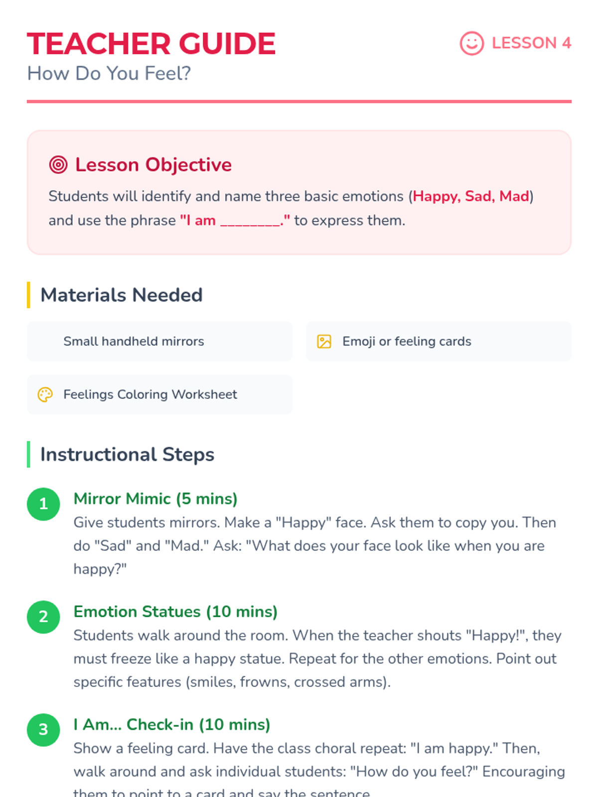 A foundational ELL sequence for Kindergarten students focusing on basic social greetings, introductions, polite requests, and expressing feelings to foster classroom integration and social-emotional learning.