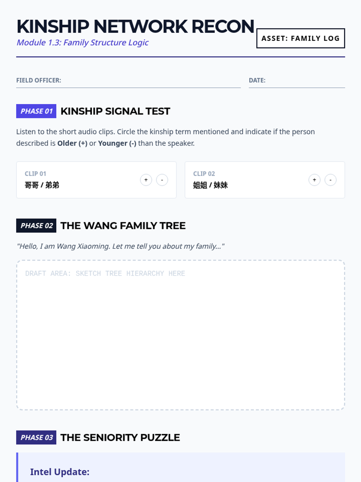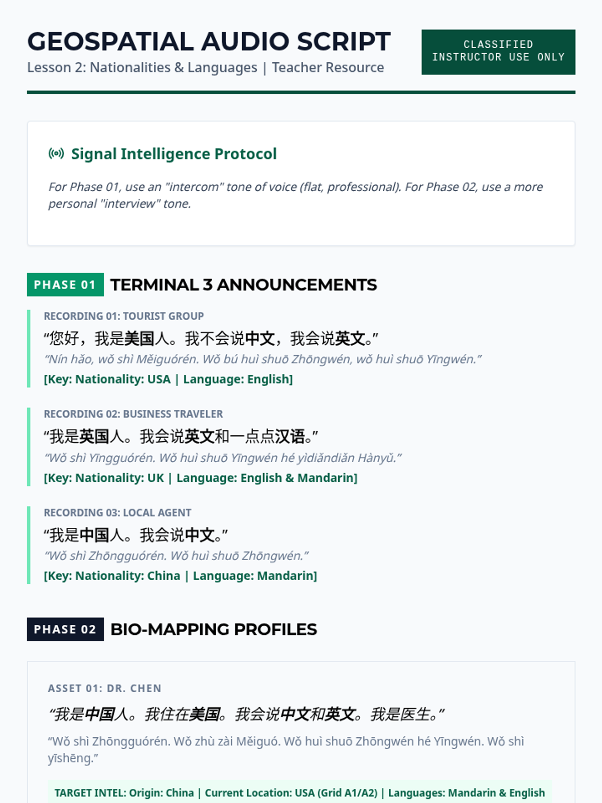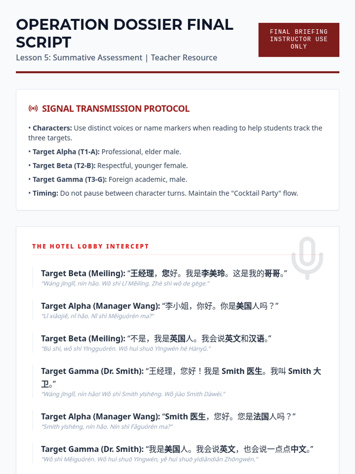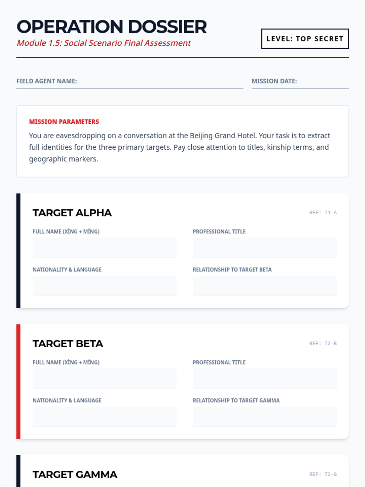 This sequence guides undergraduate students through the nuances of Mandarin Chinese listening, focusing on social identity, introductions, and kinship. Students move from basic name and title recognition to complex multi-person scenario comprehension using an intelligence-gathering aesthetic.