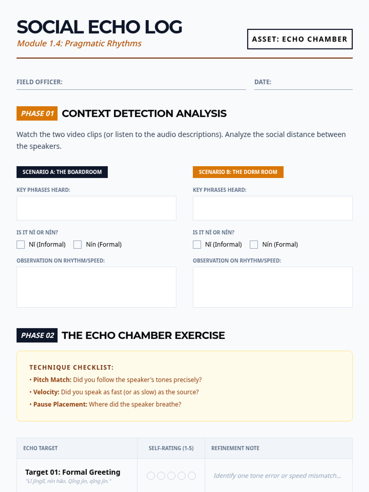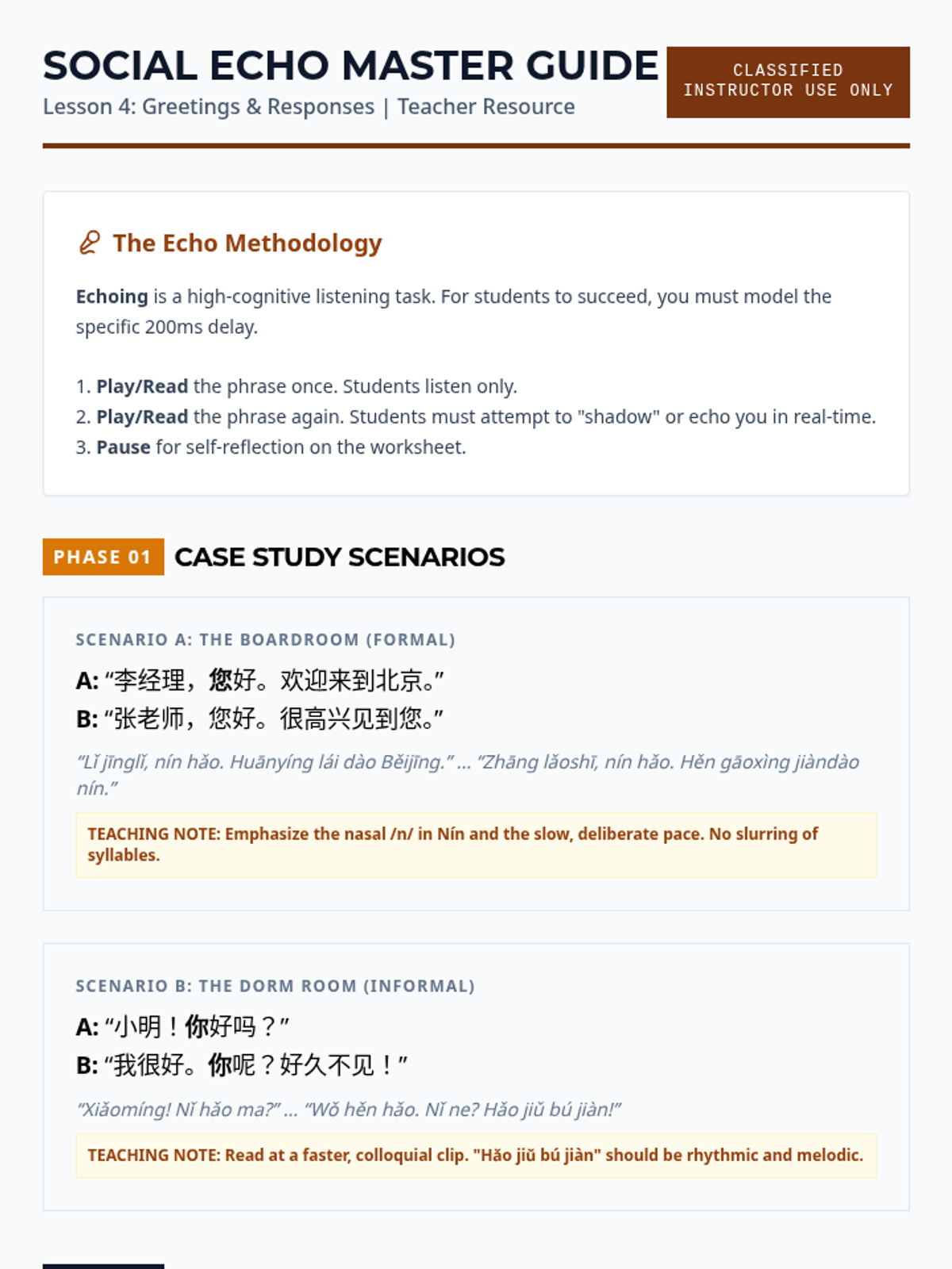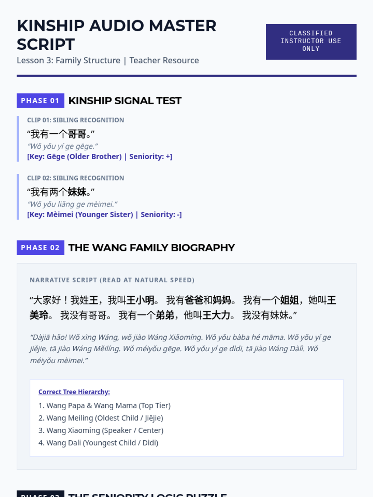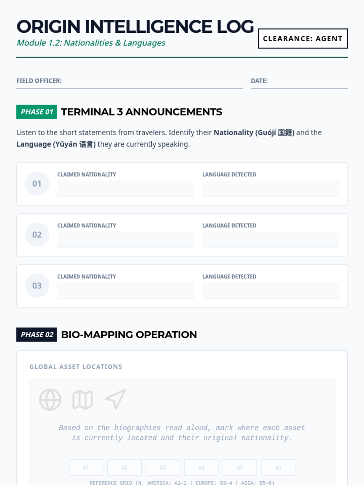This sequence guides undergraduate students through the nuances of Mandarin Chinese listening, focusing on social identity, introductions, and kinship. Students move from basic name and title recognition to complex multi-person scenario comprehension using an intelligence-gathering aesthetic.