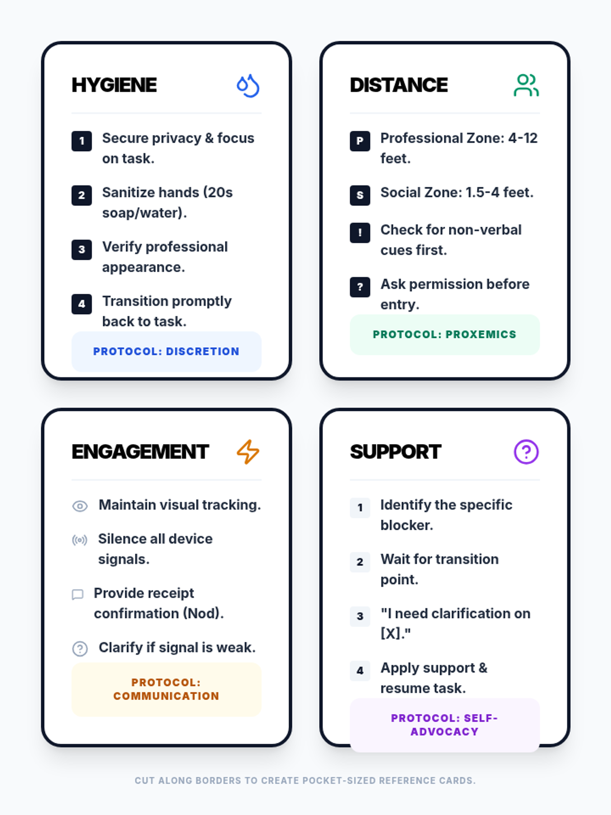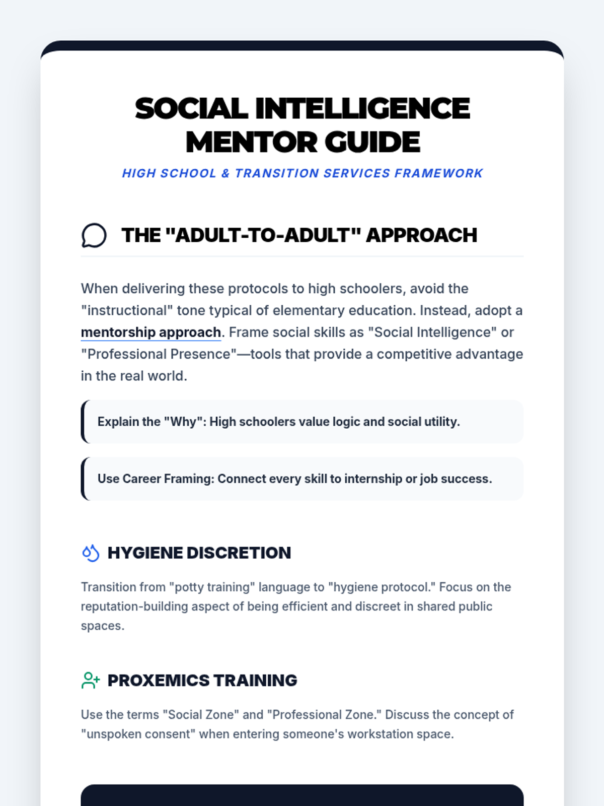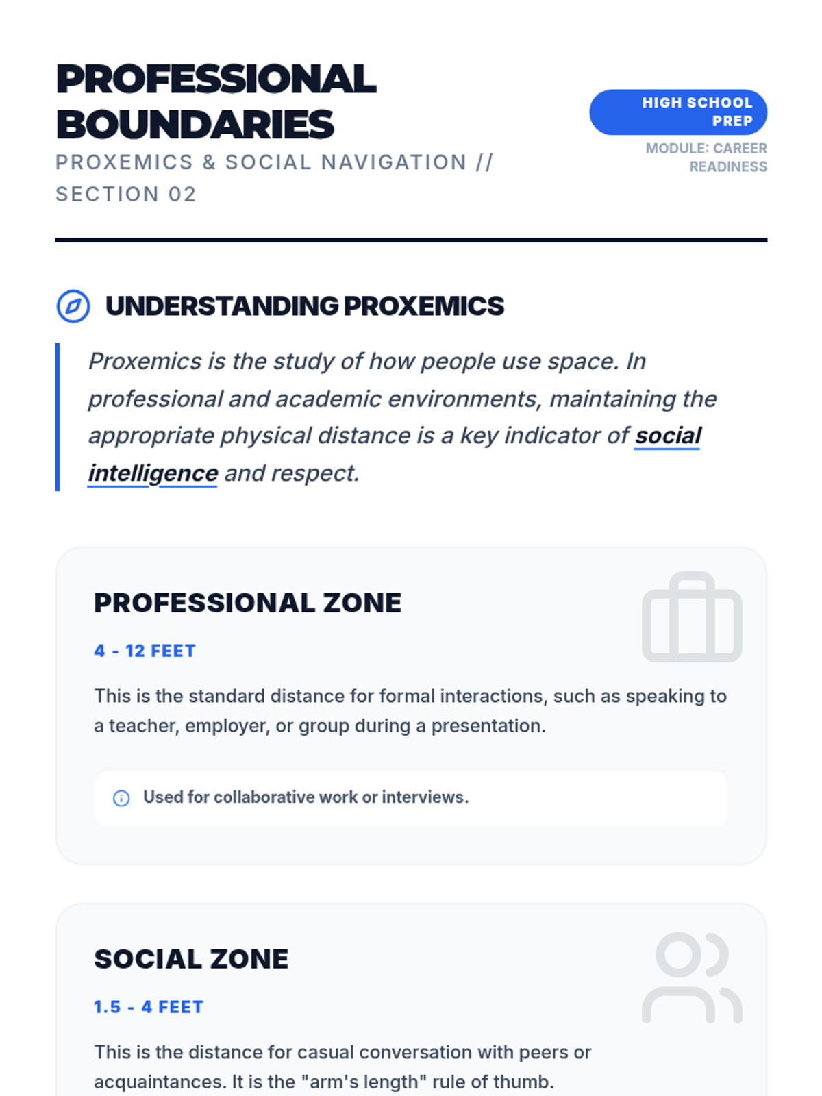 A specialized collection of social navigation guides and visual protocols designed for high school students to master professional routines, interpersonal boundaries, and active engagement in academic and vocational settings.