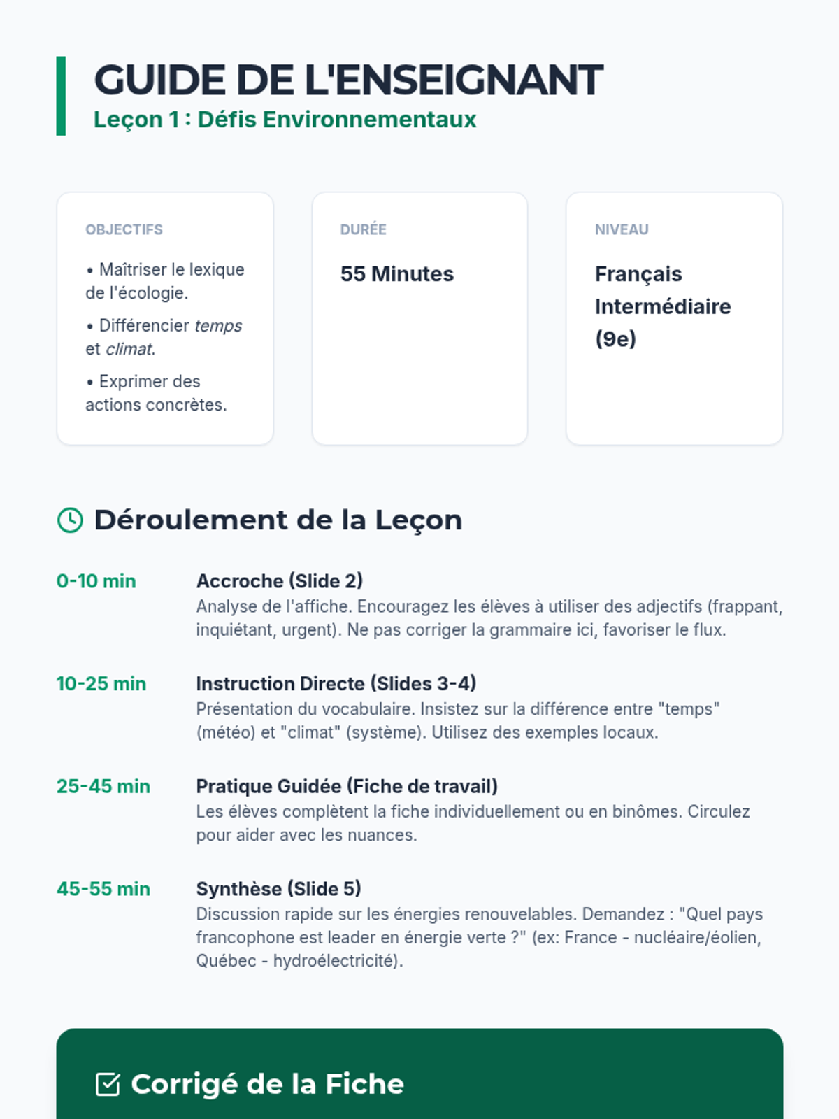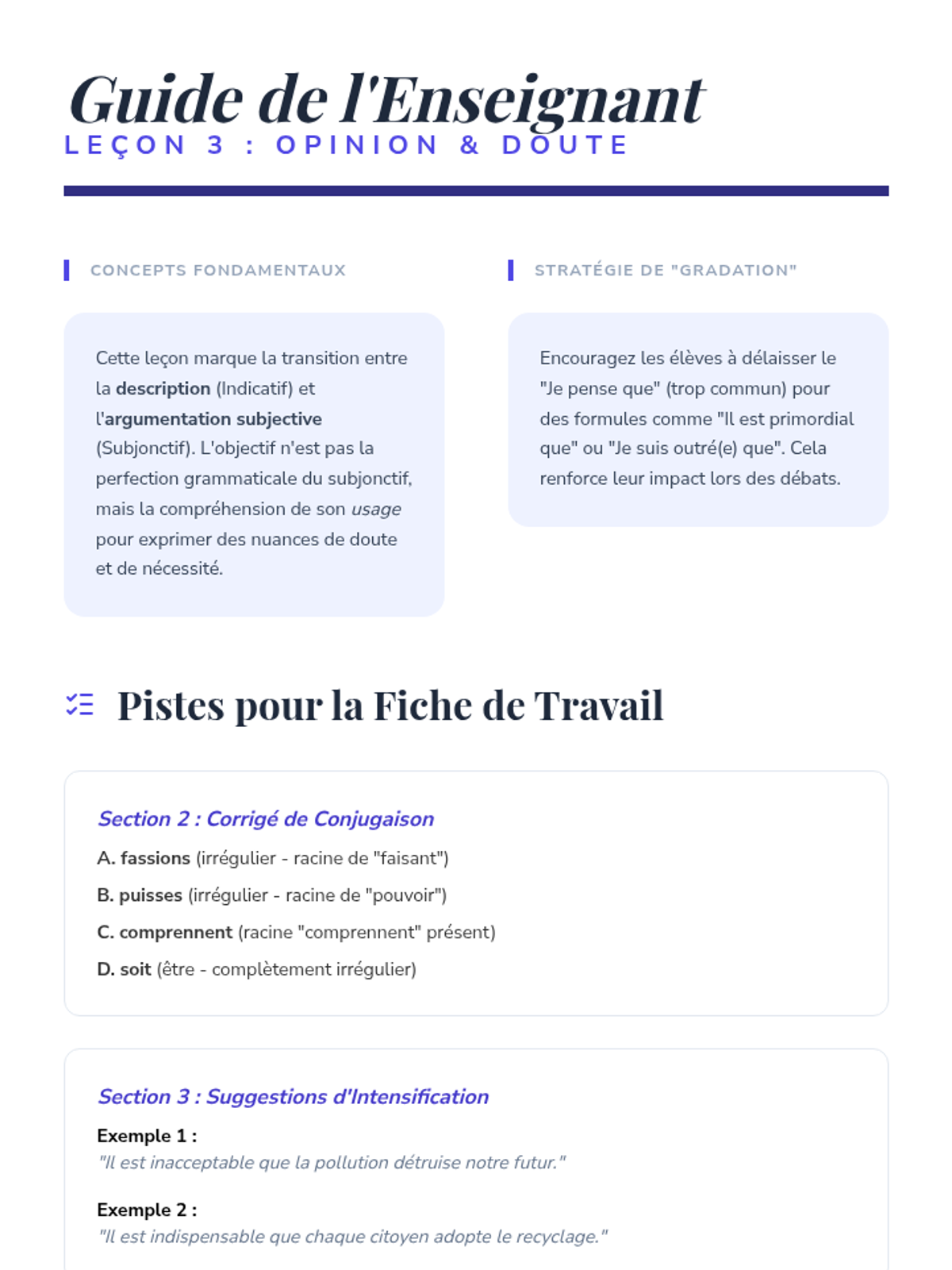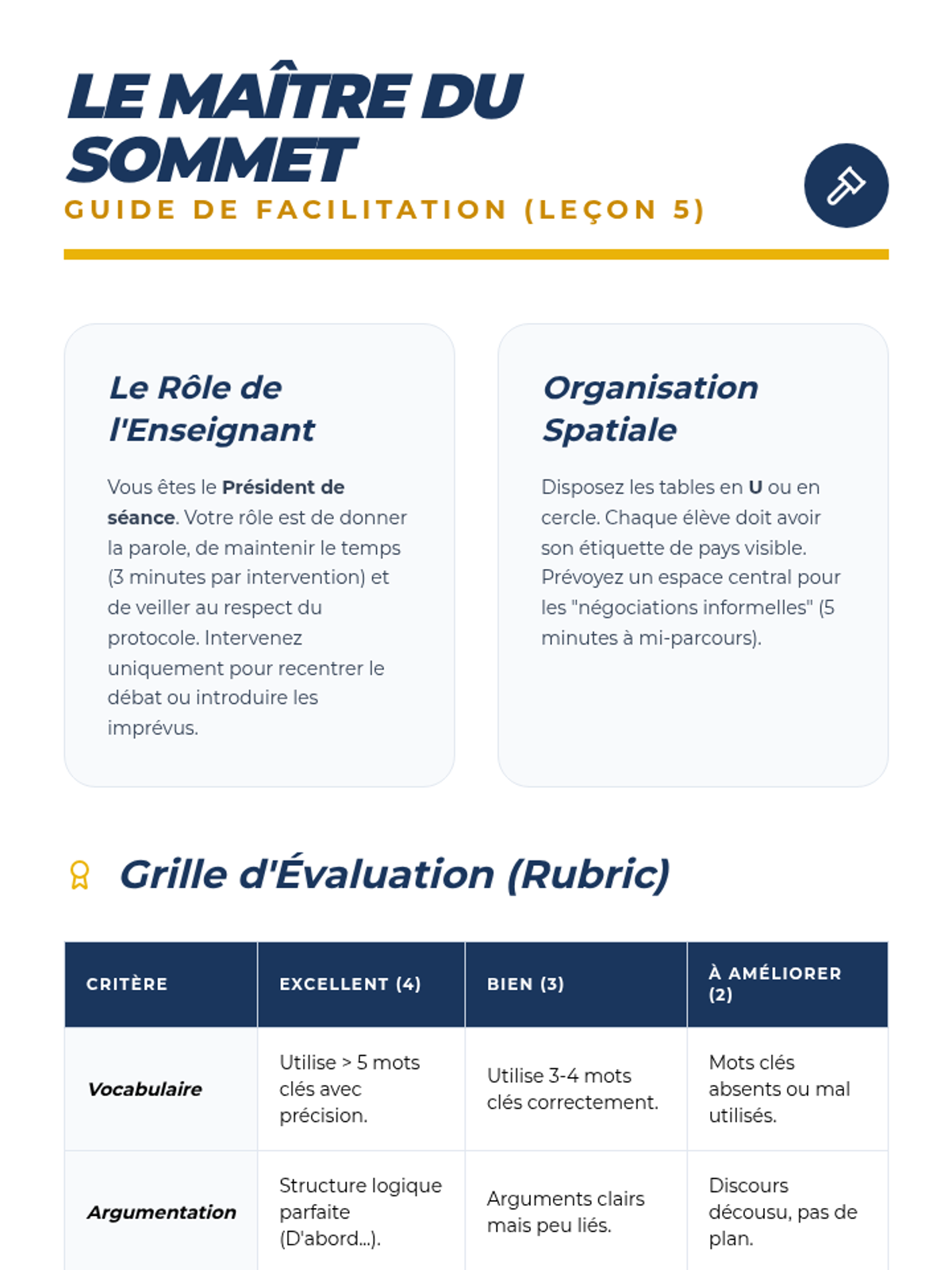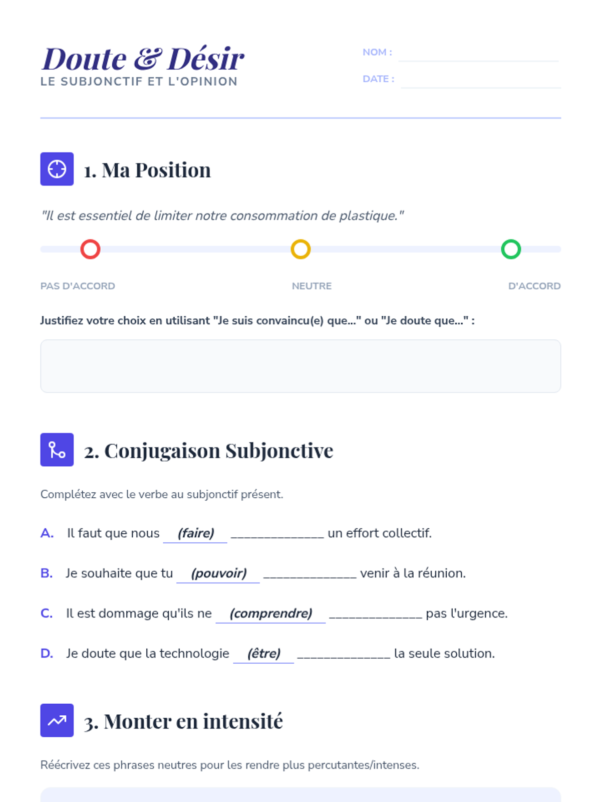 This intermediate French sequence empowers 9th-grade students to discuss complex social issues like environmentalism and technology. Students will master high-level vocabulary, transition words, and the subjunctive mood to construct persuasive arguments and participate in a formal debate simulation.