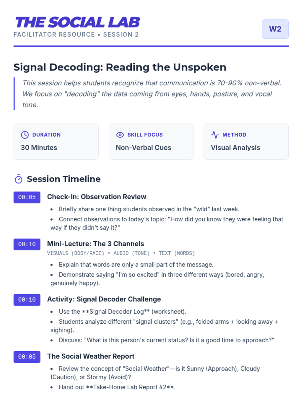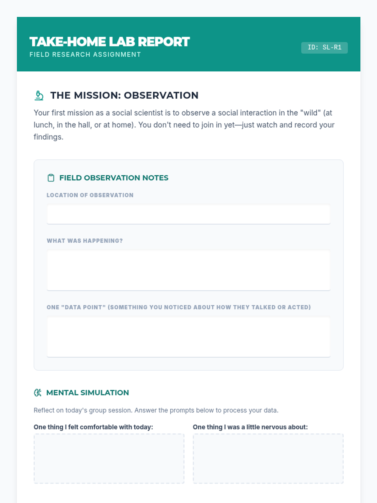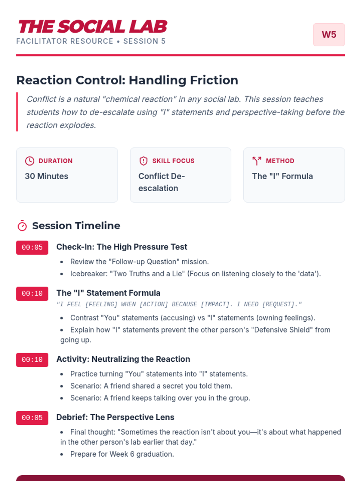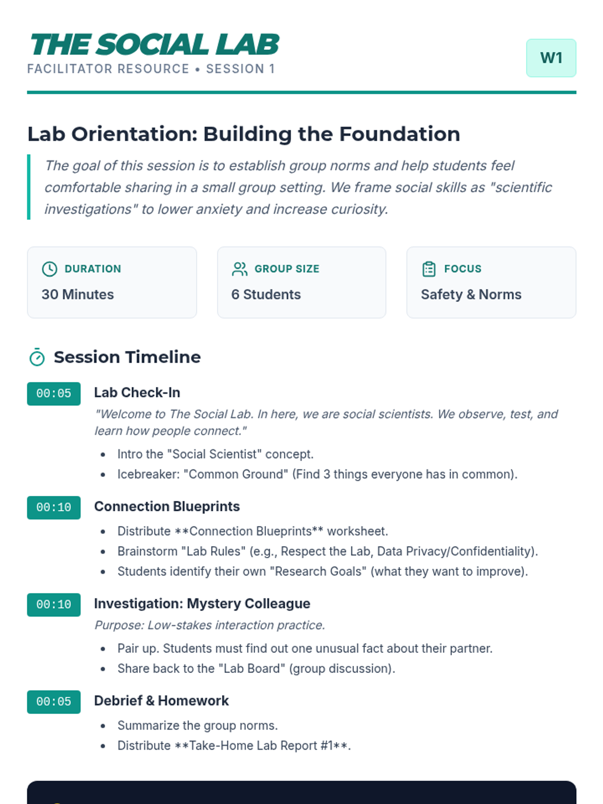 A 6-week small group curriculum for 7th graders focused on friendship skills, social cues, conversation entry, and conflict resolution. themed as 'The Social Lab', this program uses investigative and experimental motifs to engage middle schoolers in social-emotional learning.