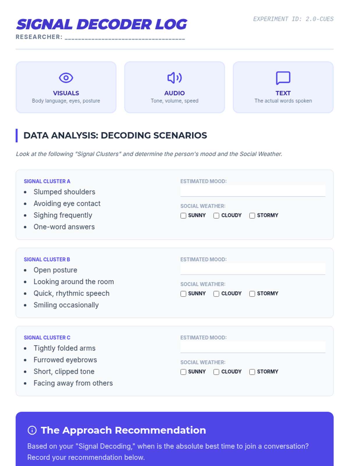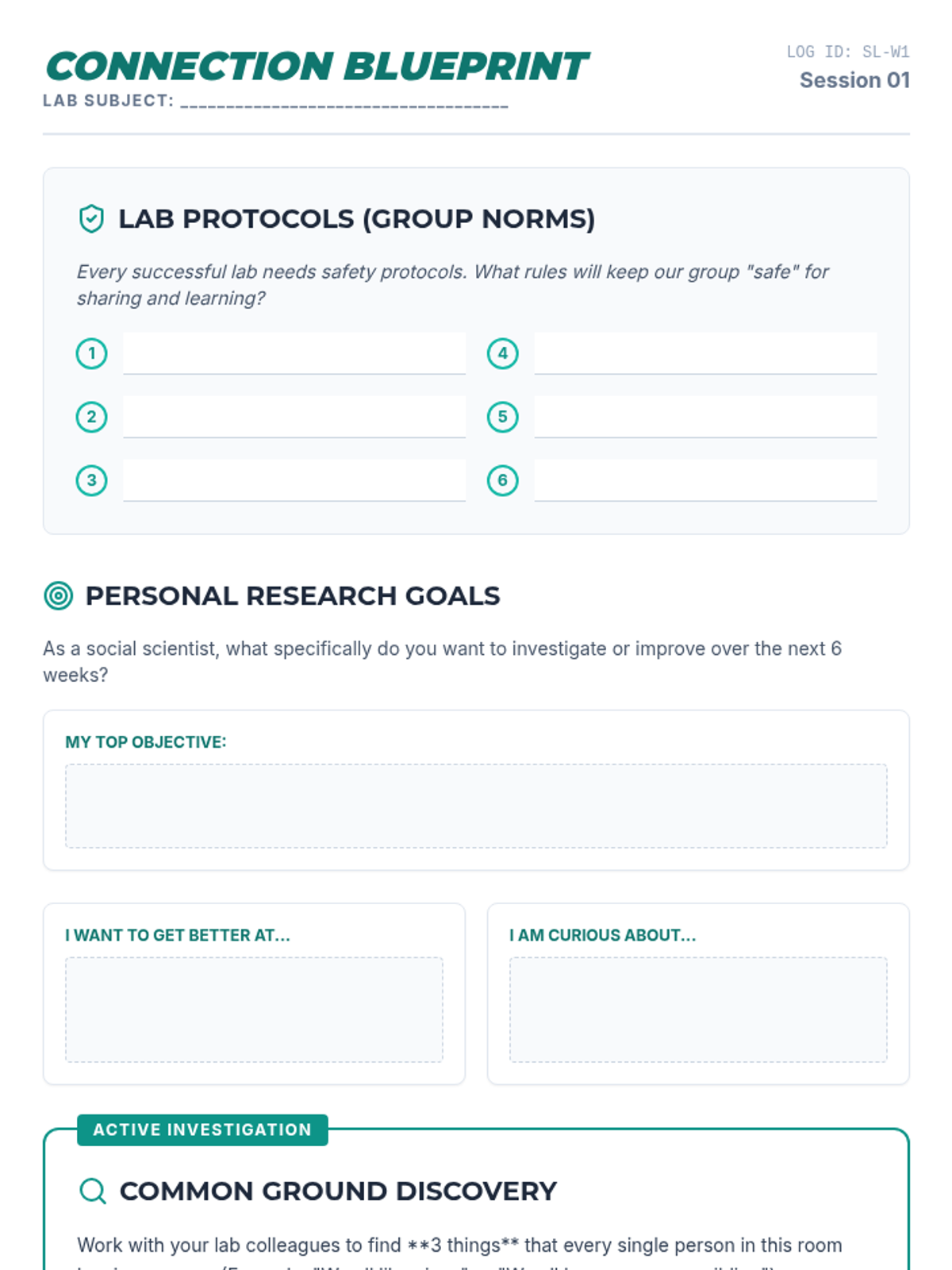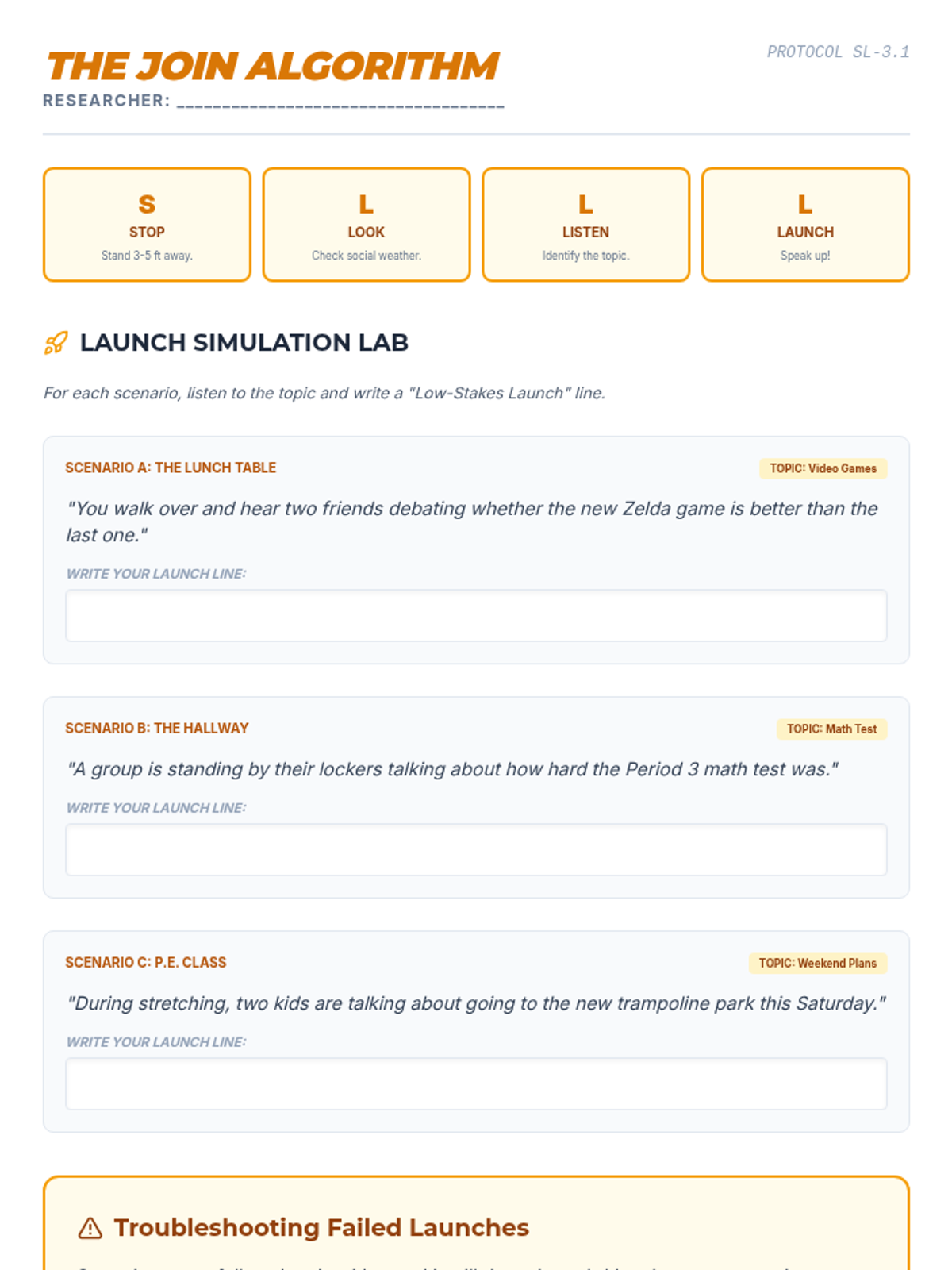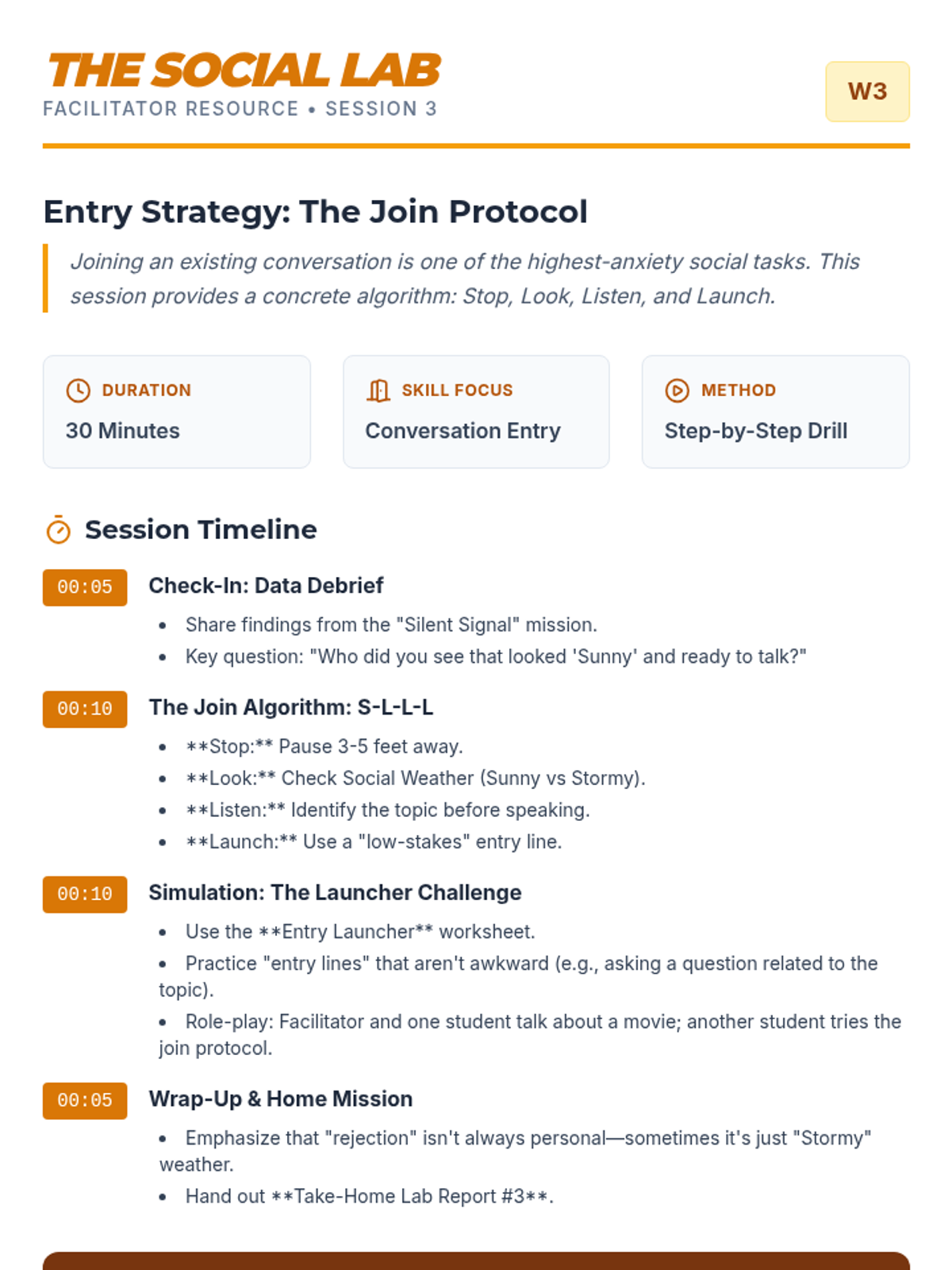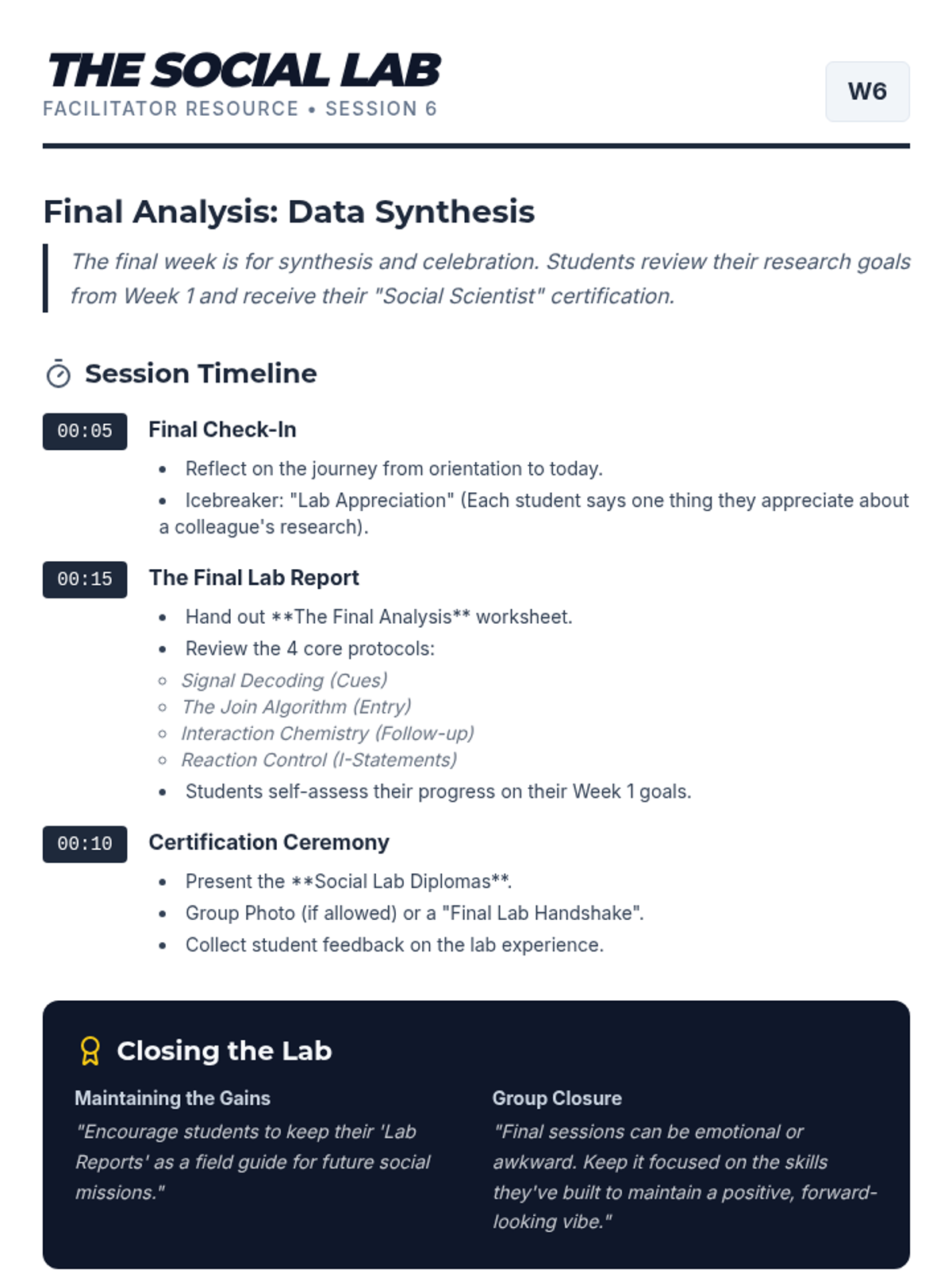 A 6-week small group curriculum for 7th graders focused on friendship skills, social cues, conversation entry, and conflict resolution. themed as 'The Social Lab', this program uses investigative and experimental motifs to engage middle schoolers in social-emotional learning.