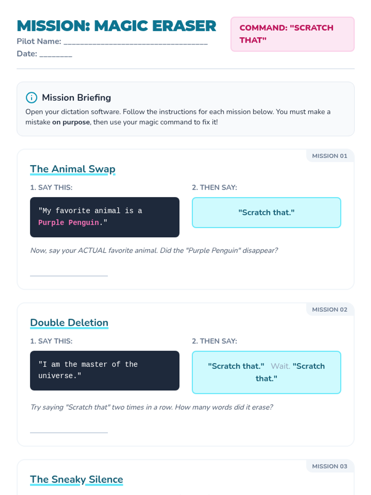 Students transition from basic dictation to real-time editing and formatting, learning how to correct mistakes as they happen. They will master essential deletion commands, vertical organization through 'new line', navigation via selection, and capitalization control to produce polished digital text using only their voice.