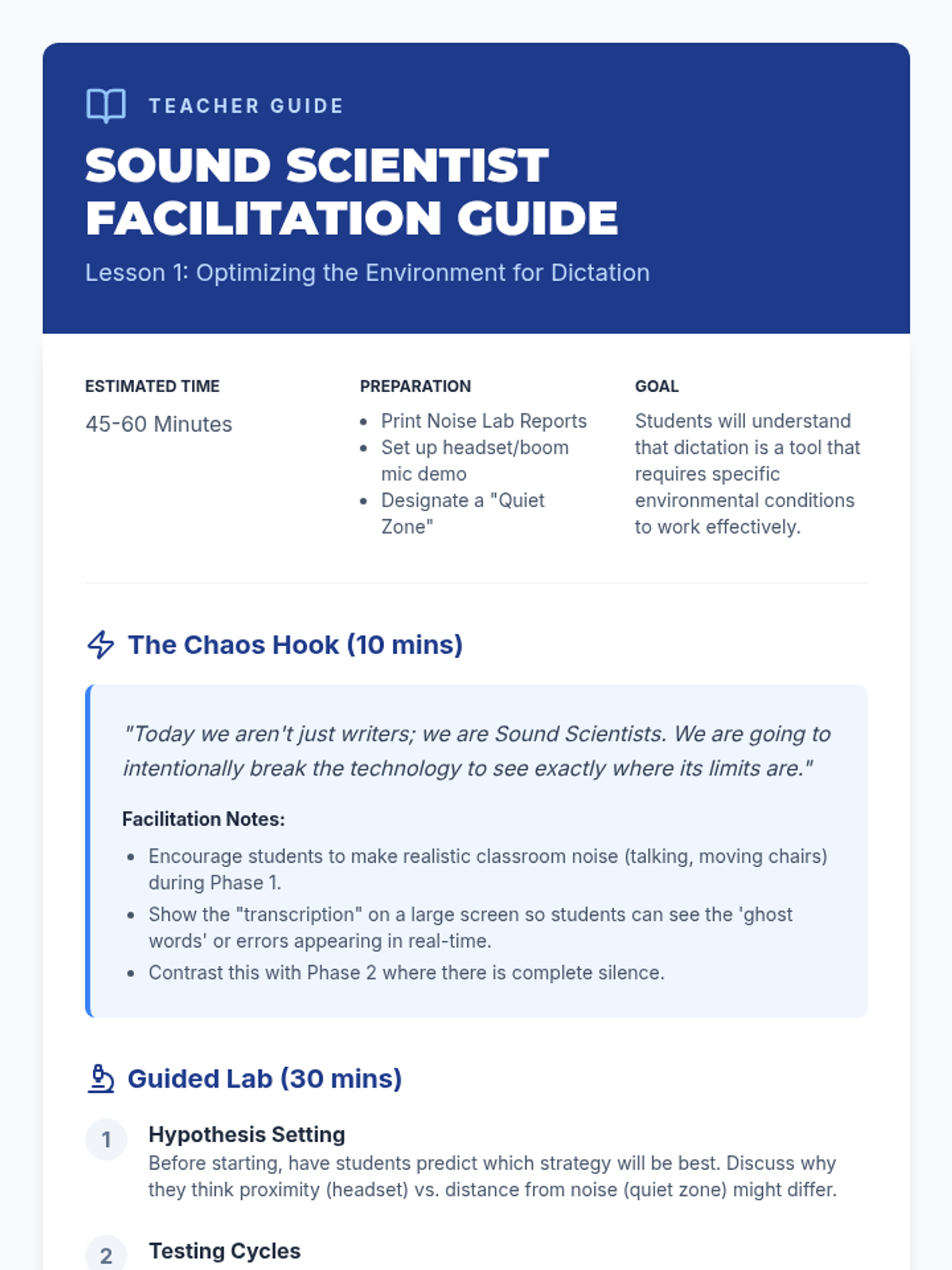 A 5-lesson sequence for 3rd-grade students to master independent use of speech-to-text dictation tools, focusing on self-awareness, environment management, troubleshooting, and self-advocacy.