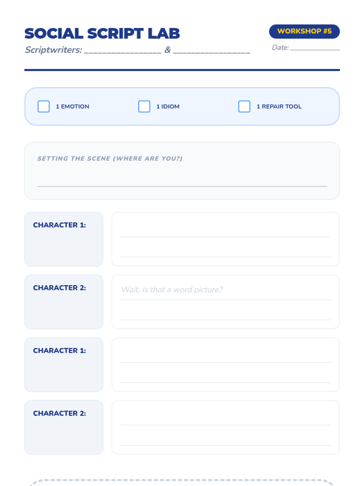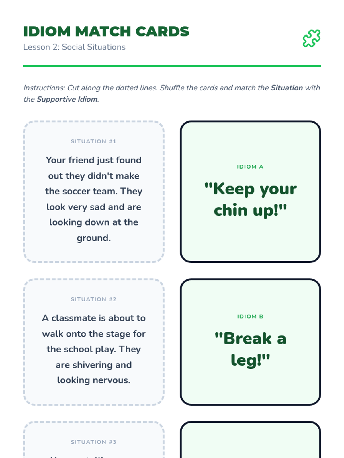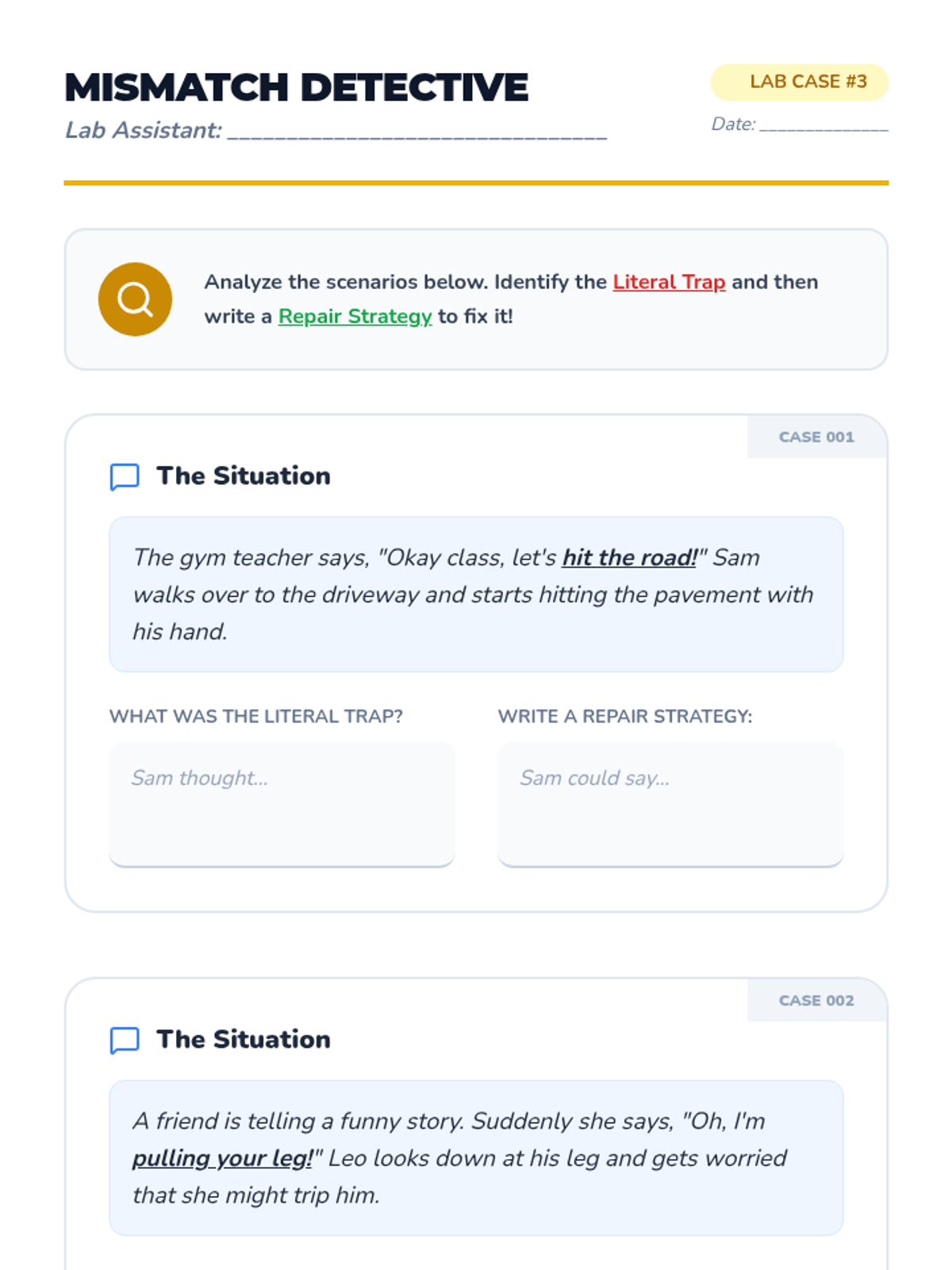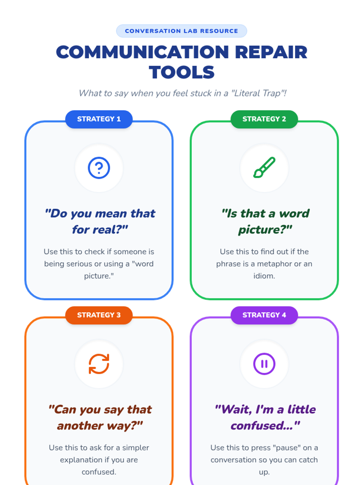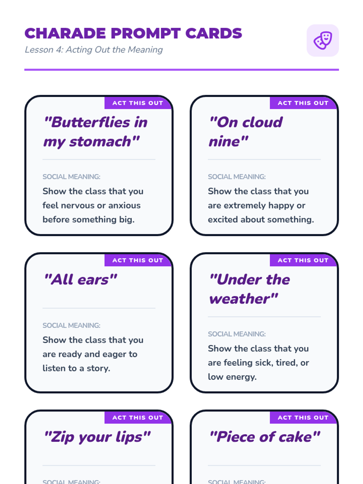 A comprehensive sequence for 3rd-grade students to master non-literal language in social contexts. Students learn to decode emotion metaphors, use idioms appropriately in conversation, and apply repair strategies when communication breakdowns occur.