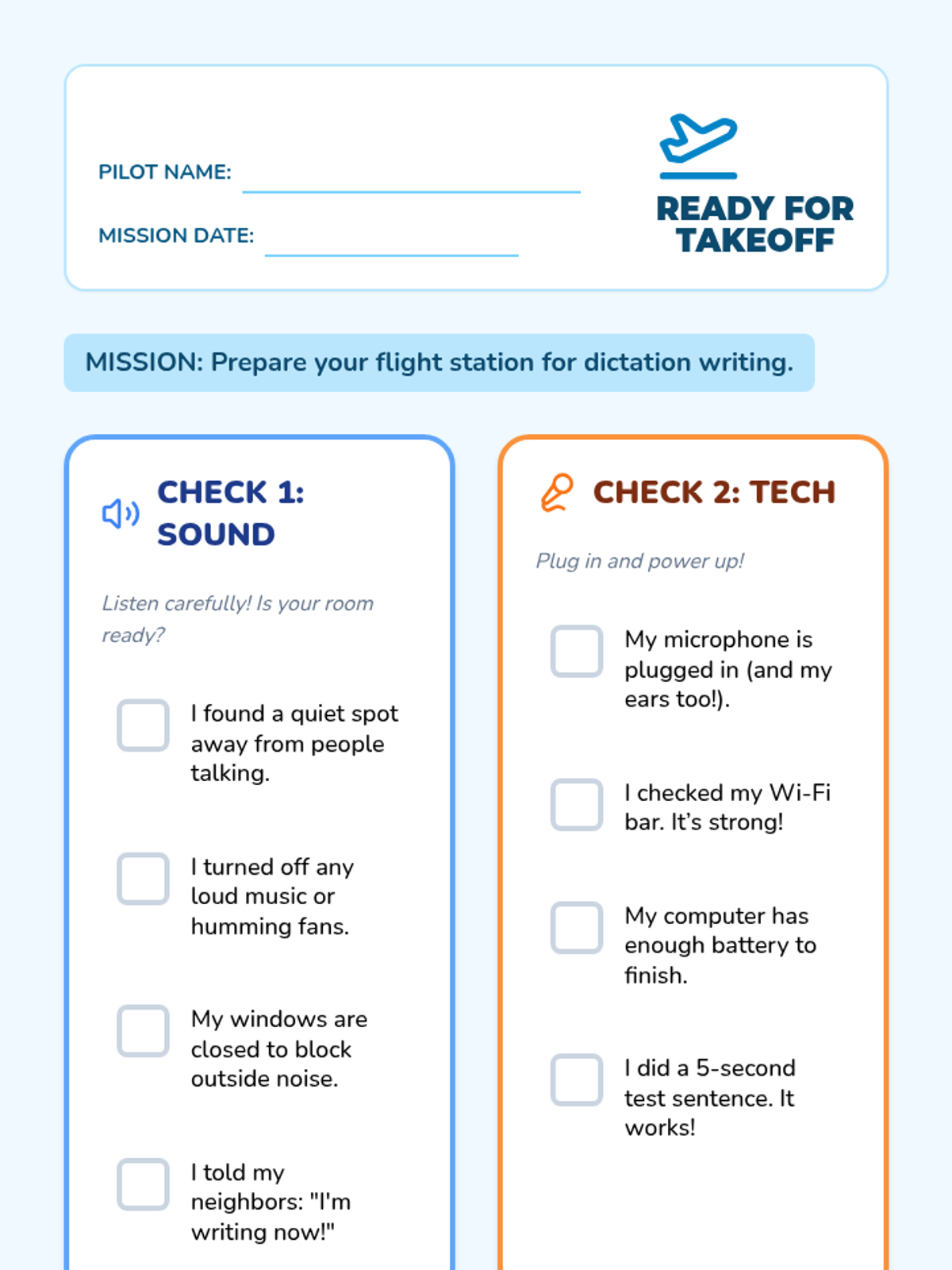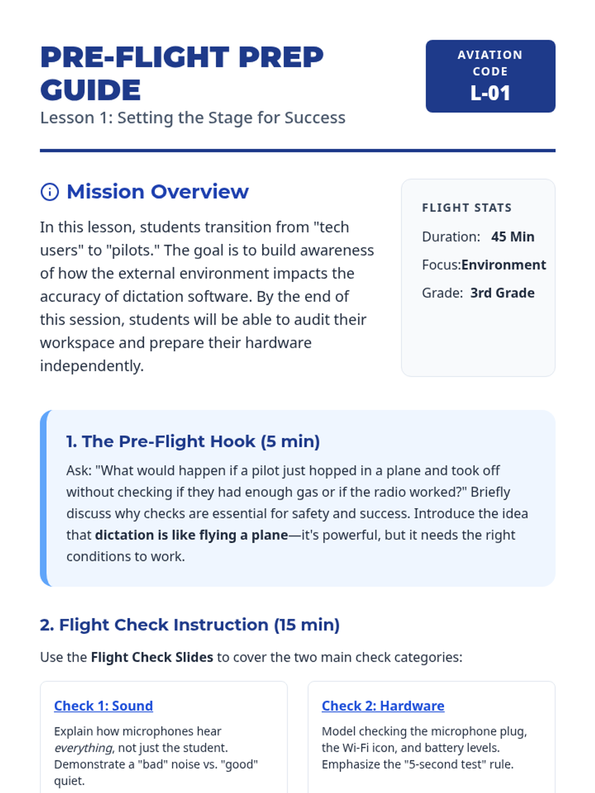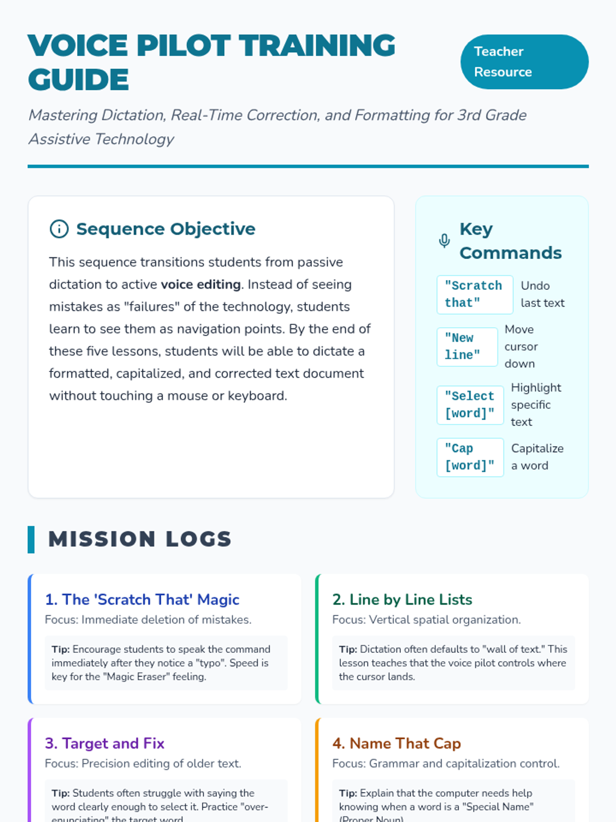 This sequence empowers 3rd-grade students to master assistive technology for writing. Through a 'flight school' theme, students develop the environmental awareness, physical stamina, and structured editing habits needed for independent dictation workflows.
