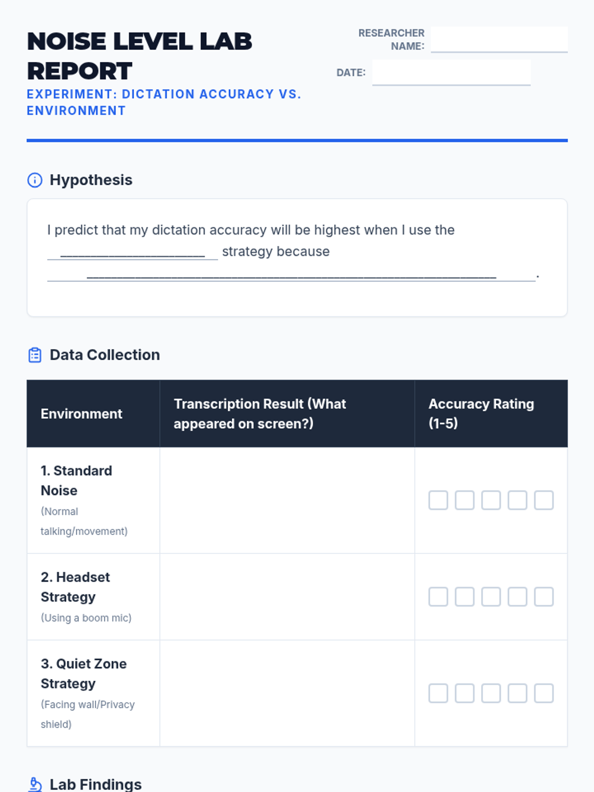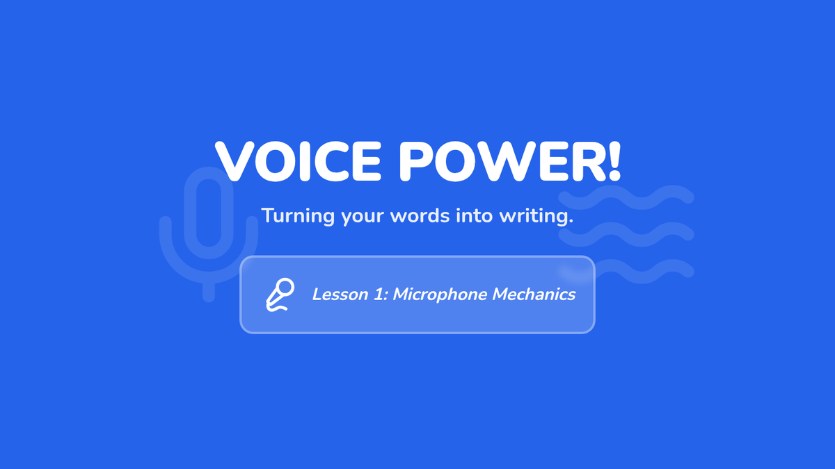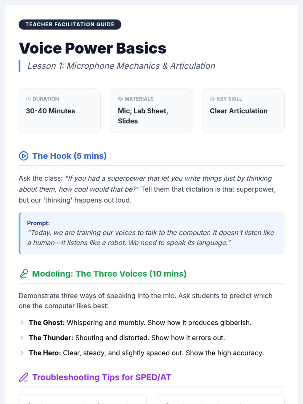 A foundational series for 3rd grade students to master speech-to-text technology, focusing on articulation, volume control, and basic punctuation commands (period, question mark, exclamation point).