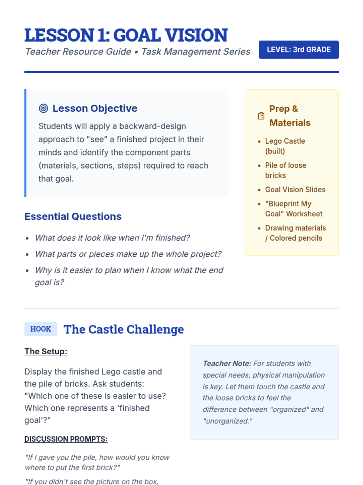 A 6-week Tier 2 executive functioning intervention focused on developing goal-setting and problem-solving skills. Students use an engineering/blueprint theme to "design" their success and navigate challenges.