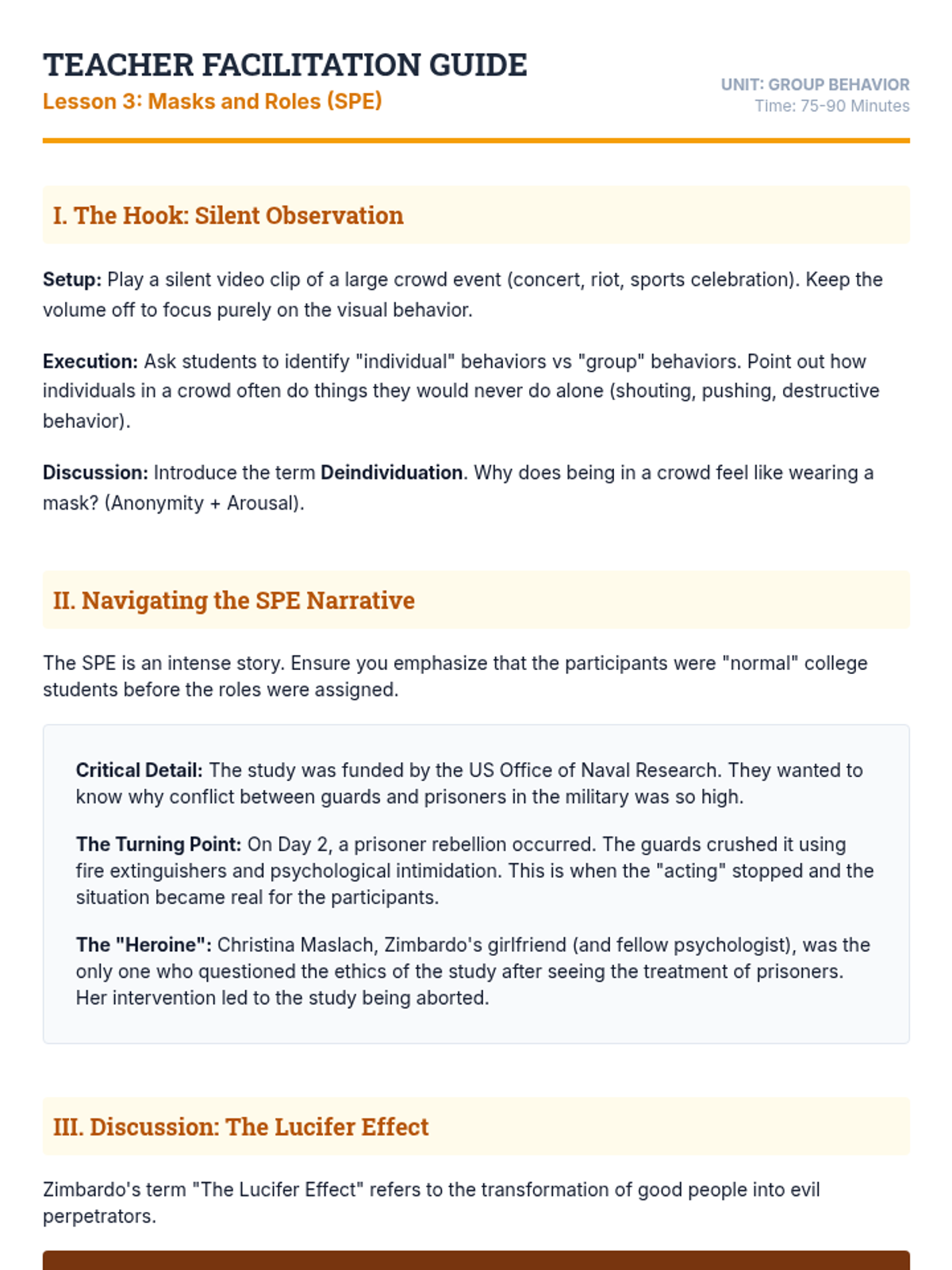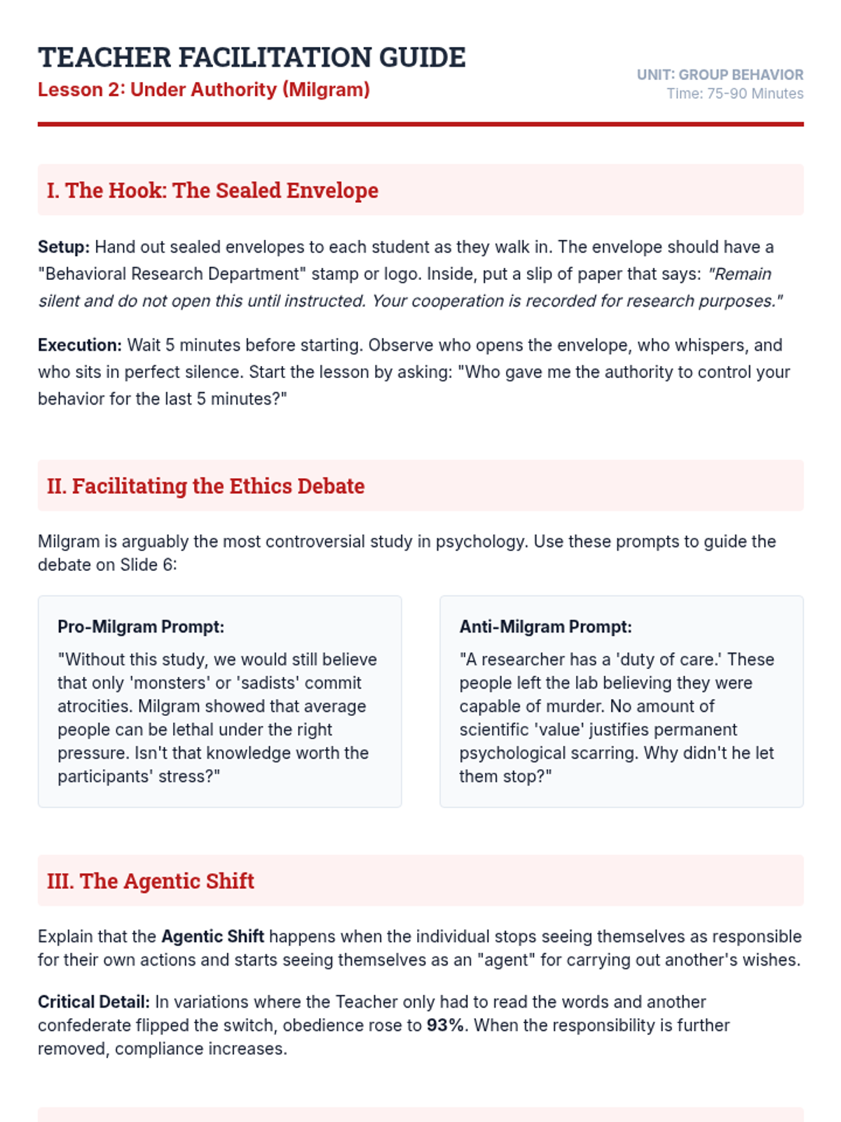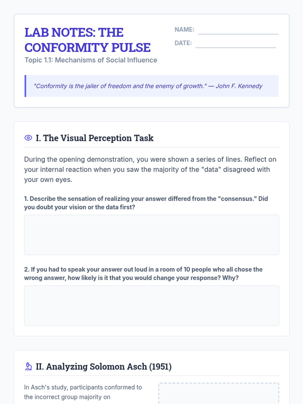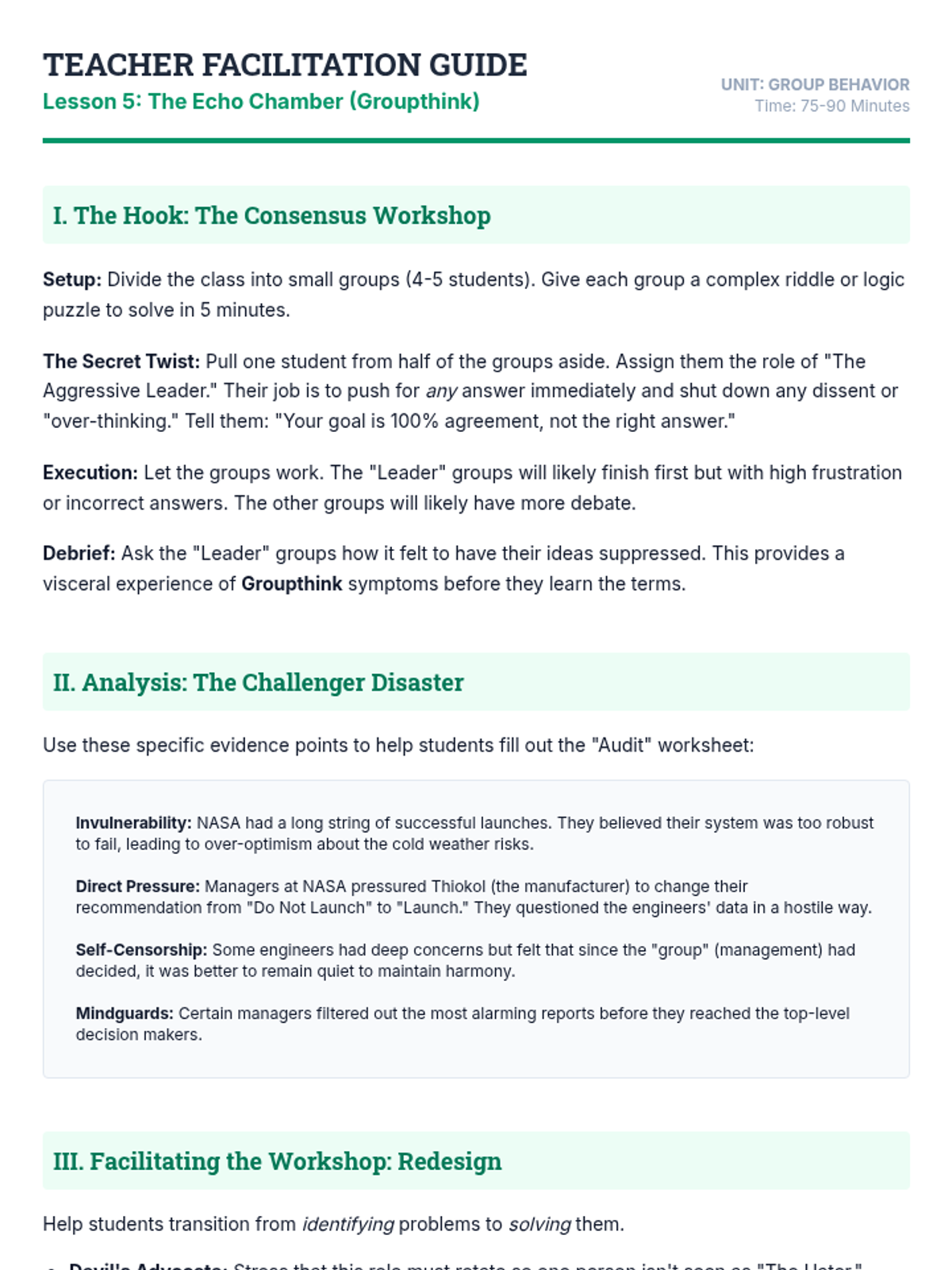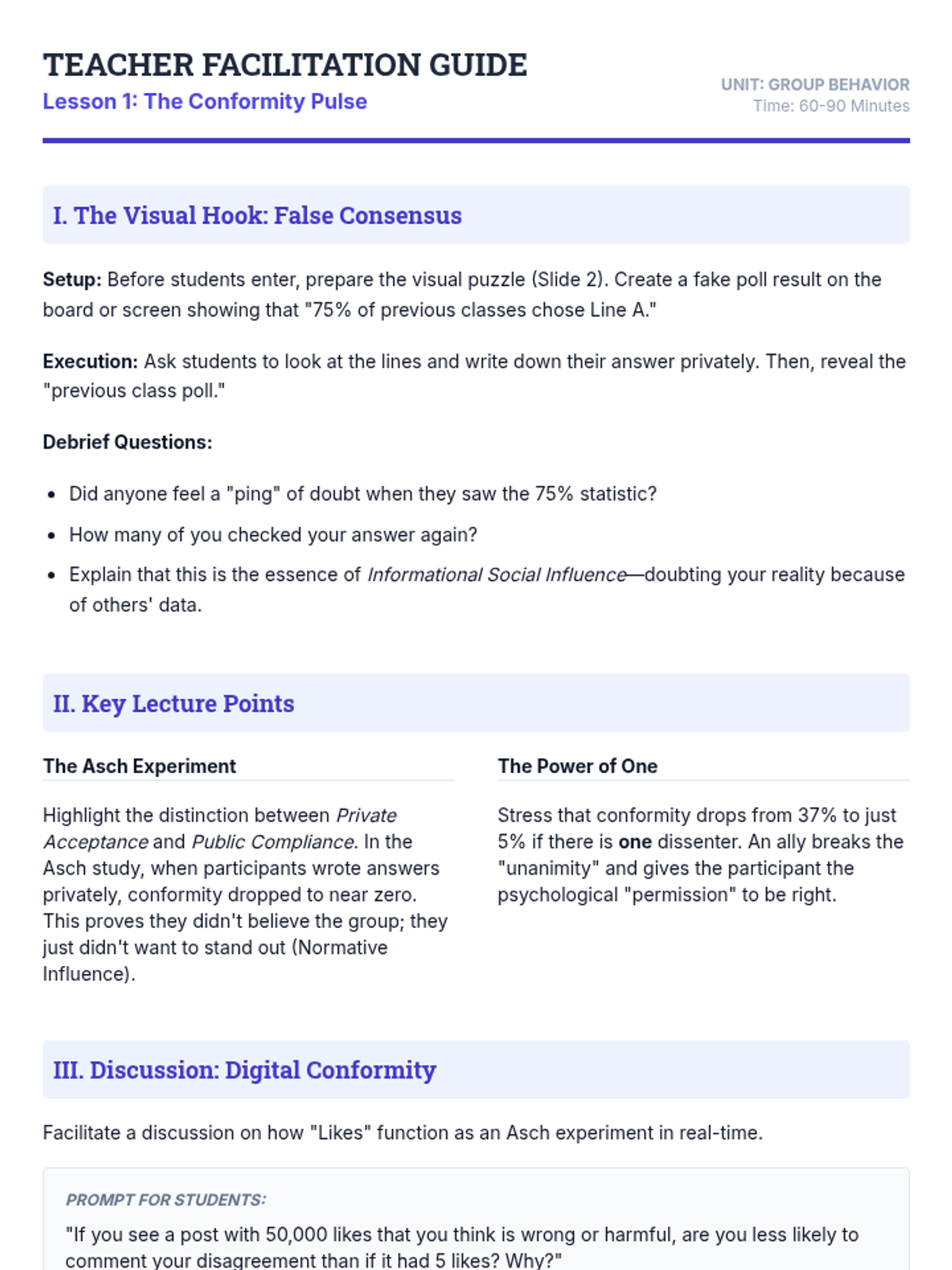 A comprehensive 5-lesson unit exploring the psychology of social influence, conformity, obedience, and group dynamics. Students analyze classic experiments and apply psychological theories to historical events and modern social behavior.