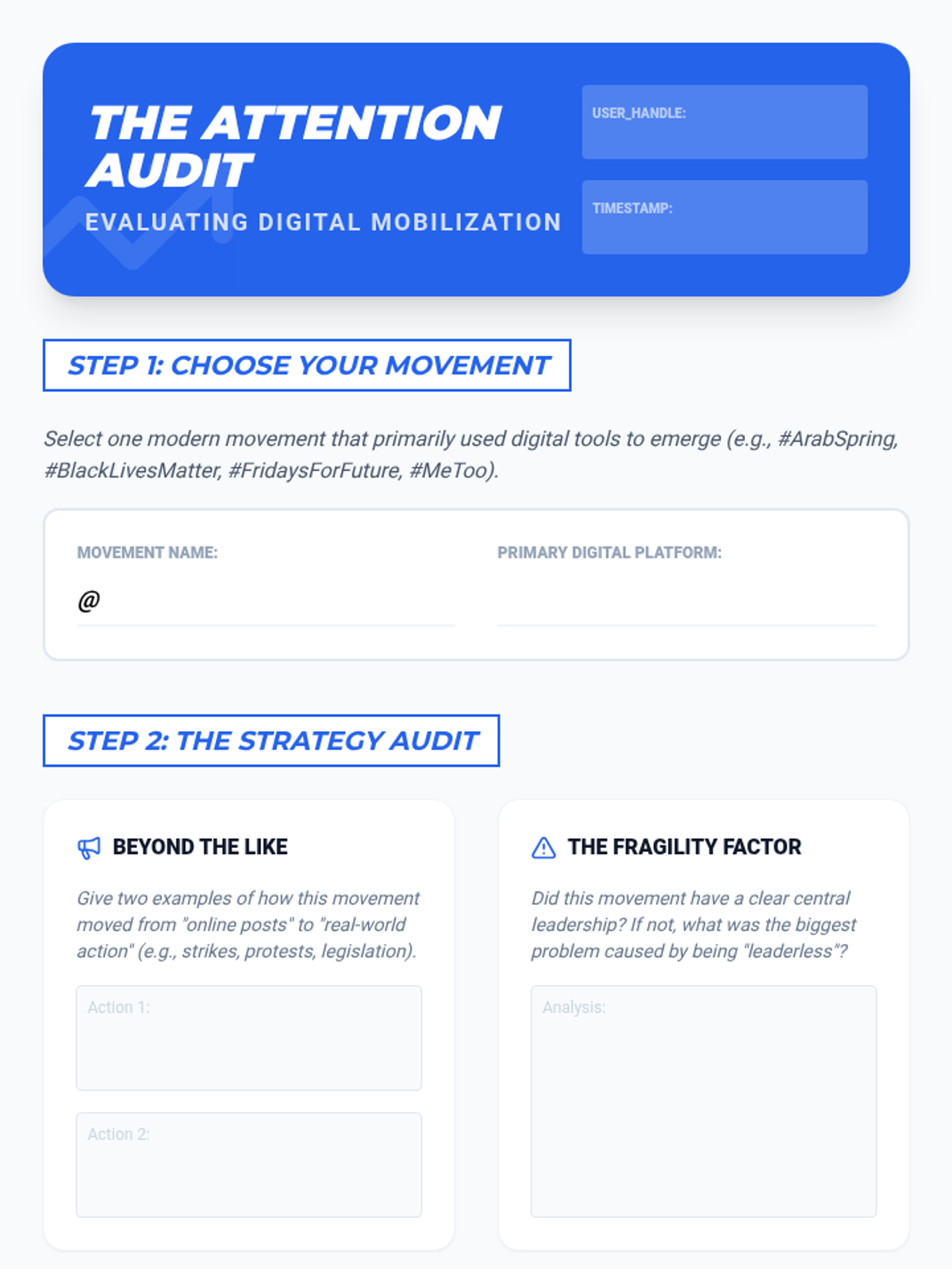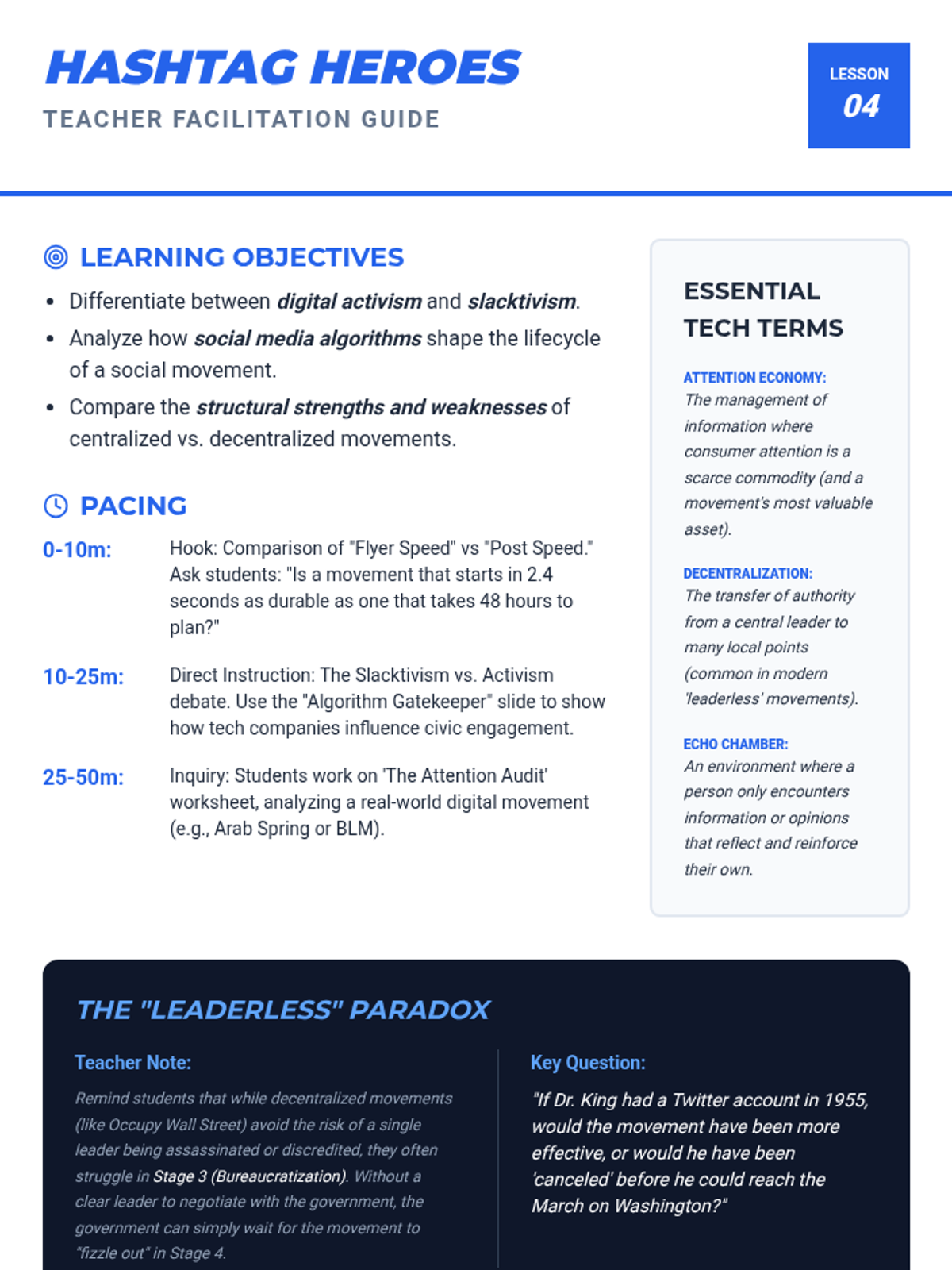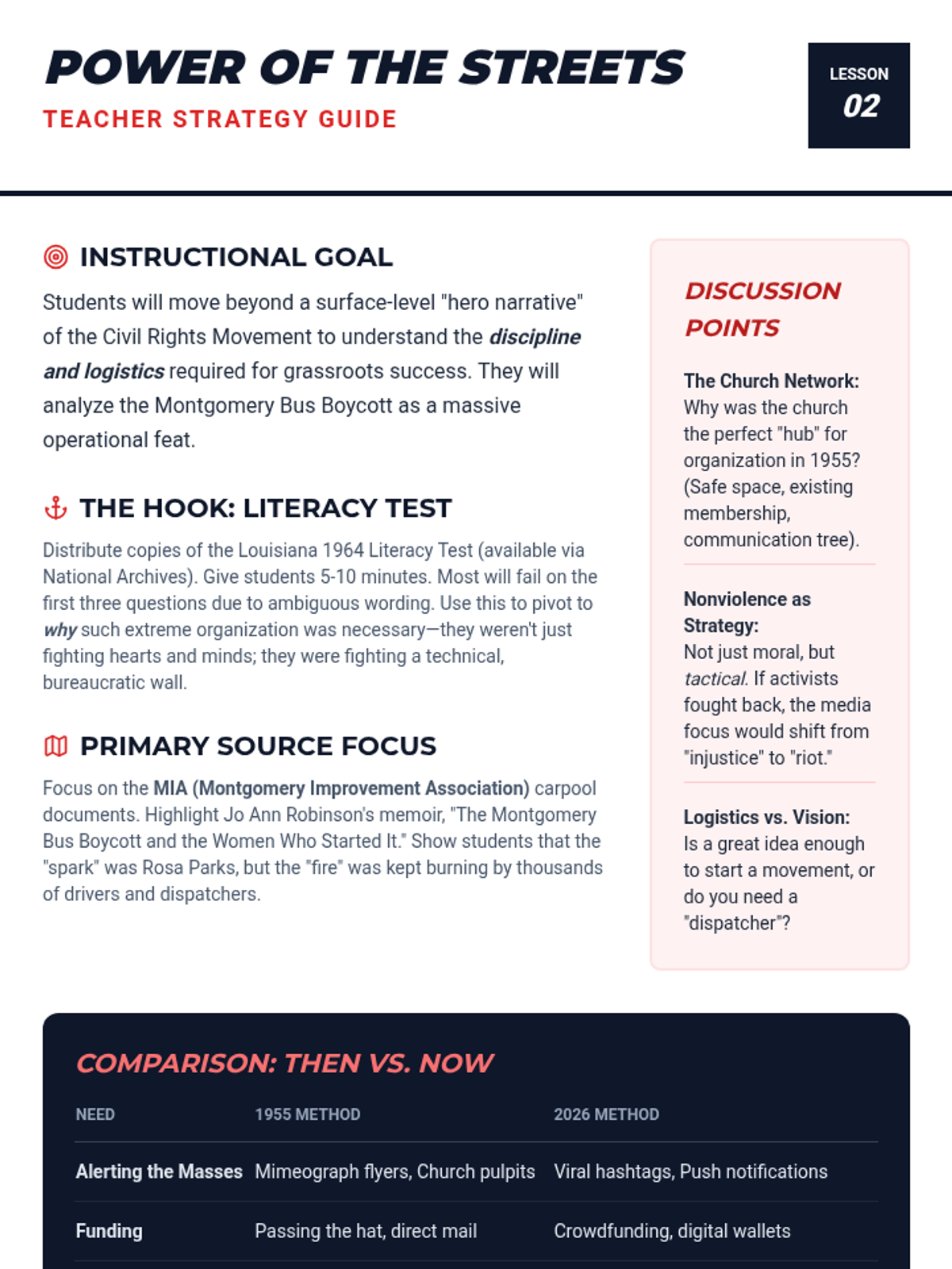 A comprehensive 5-lesson unit for 11th-grade students examining the evolution of social movements from 20th-century grassroots organizing to 21st-century digital activism. Students analyze the life cycle of movements, the power of litigation, and the effectiveness of modern decentralized campaigns through comparative study.