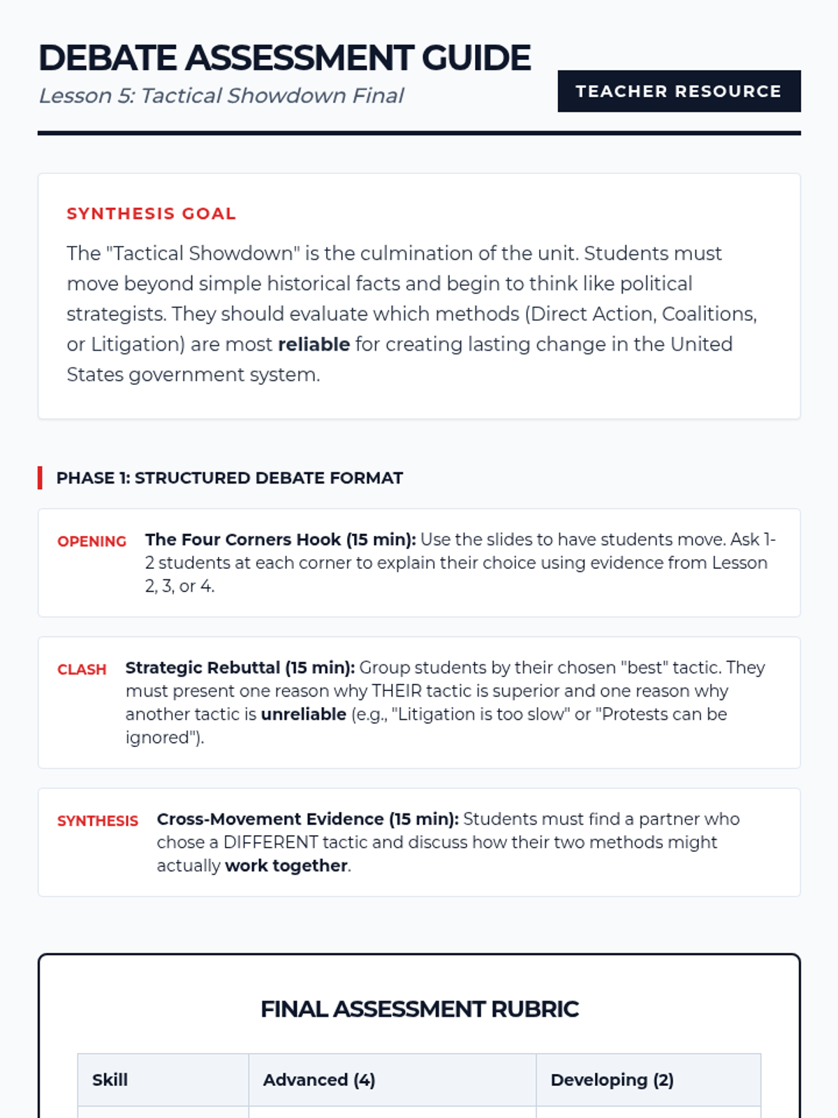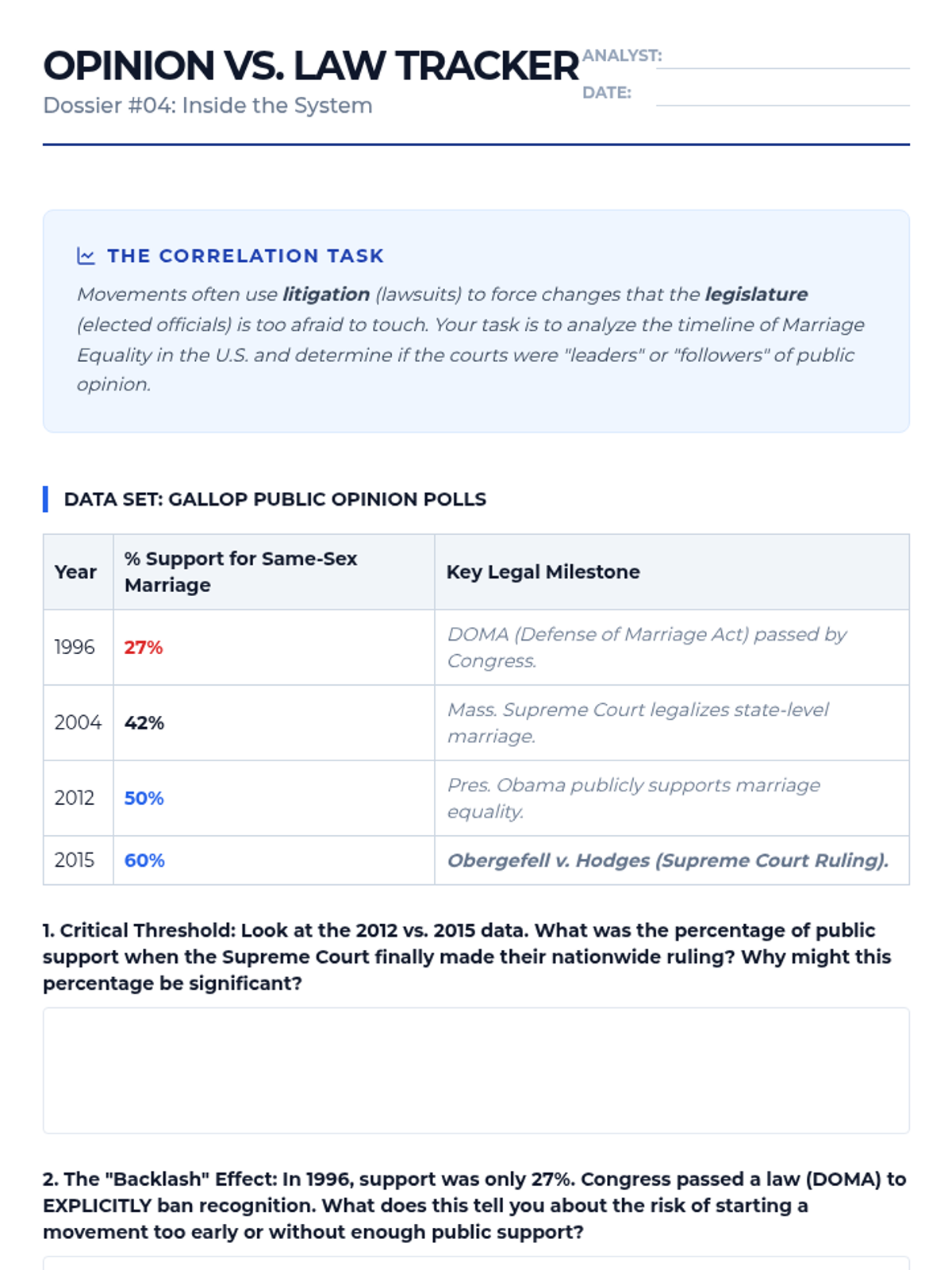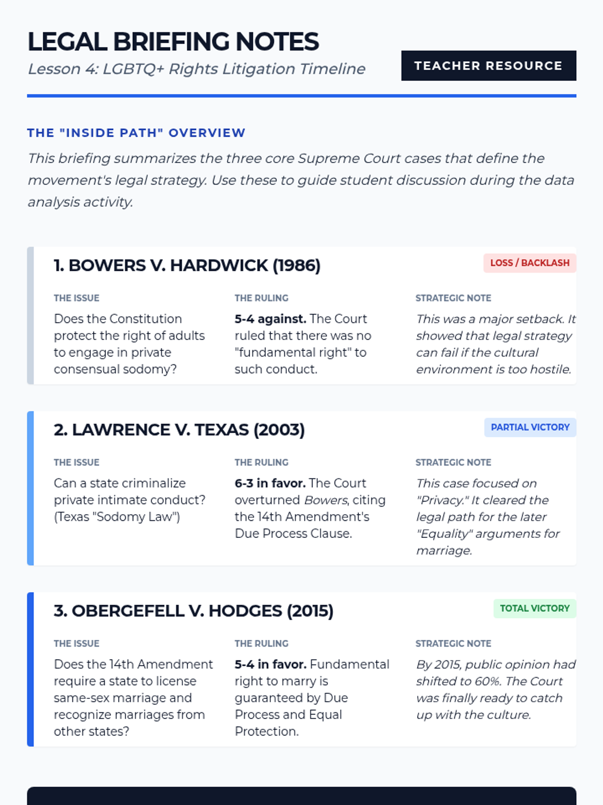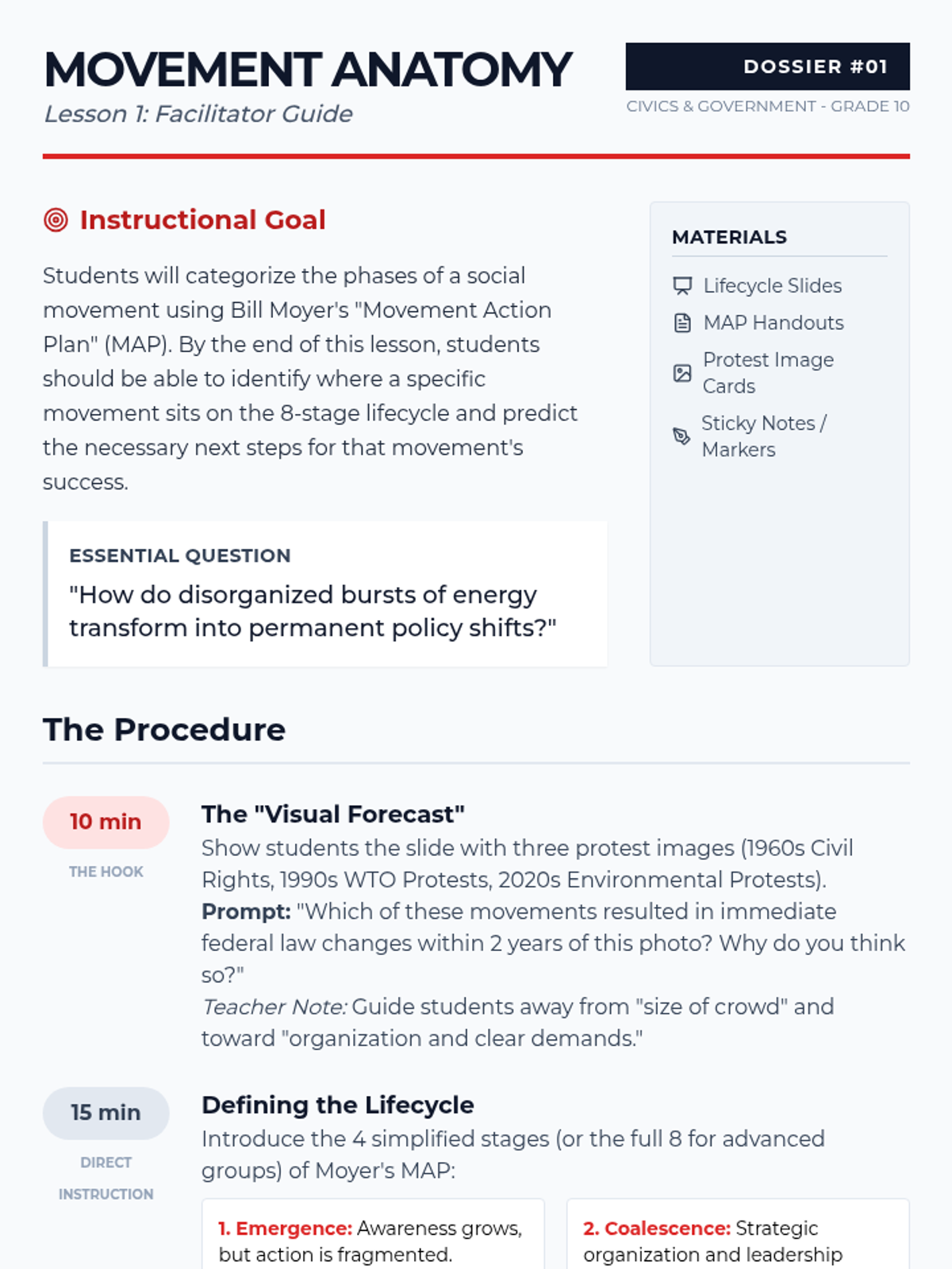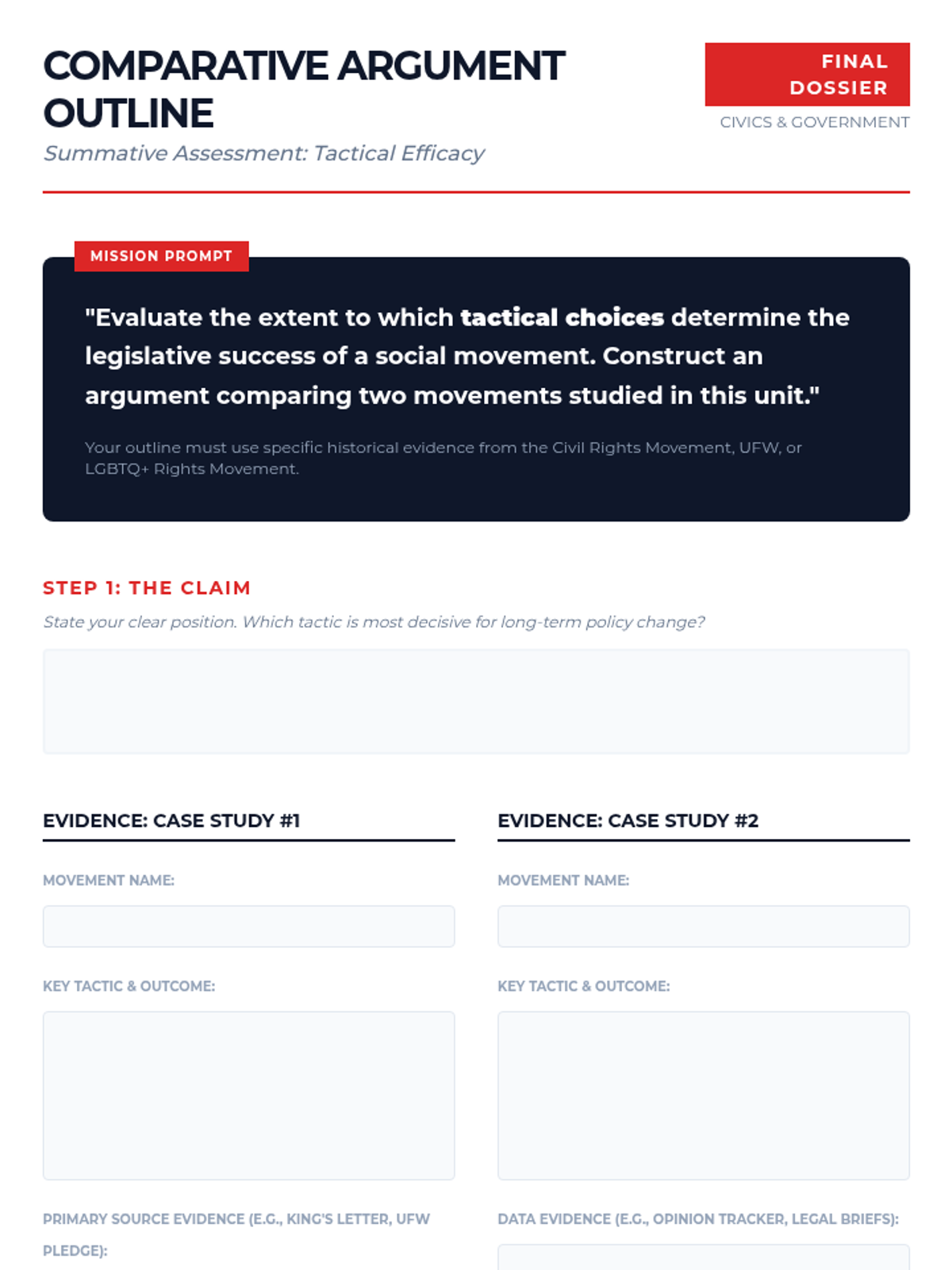This sequence guides 10th-grade students through a comparative study of social movements, focusing on the tactical choices (nonviolence, litigation, coalitions) that lead to legislative success. Students analyze historical case studies like the Civil Rights Movement, UFW, and LGBTQ+ rights to evaluate which strategies are most effective for influencing public policy in a democracy.