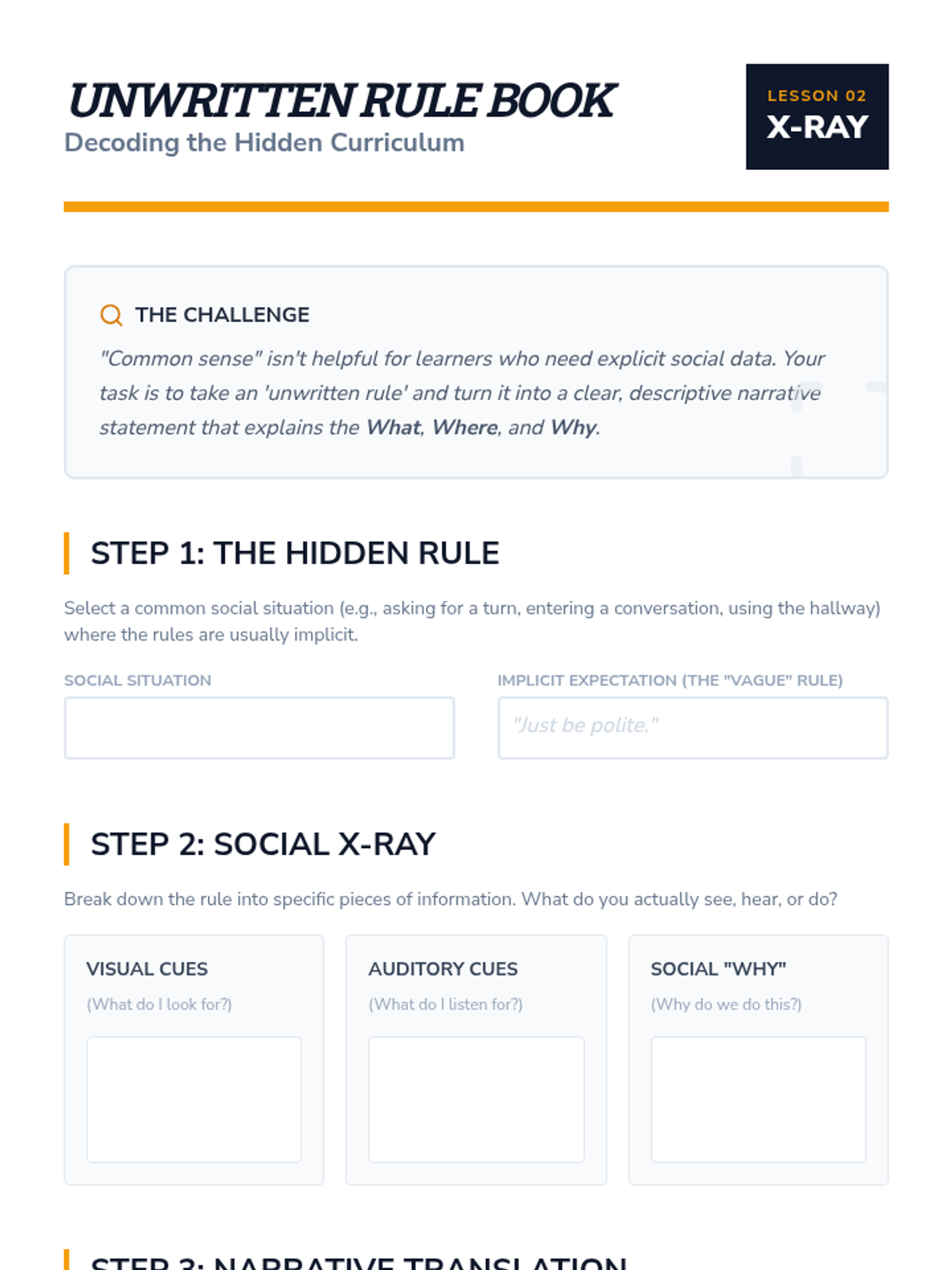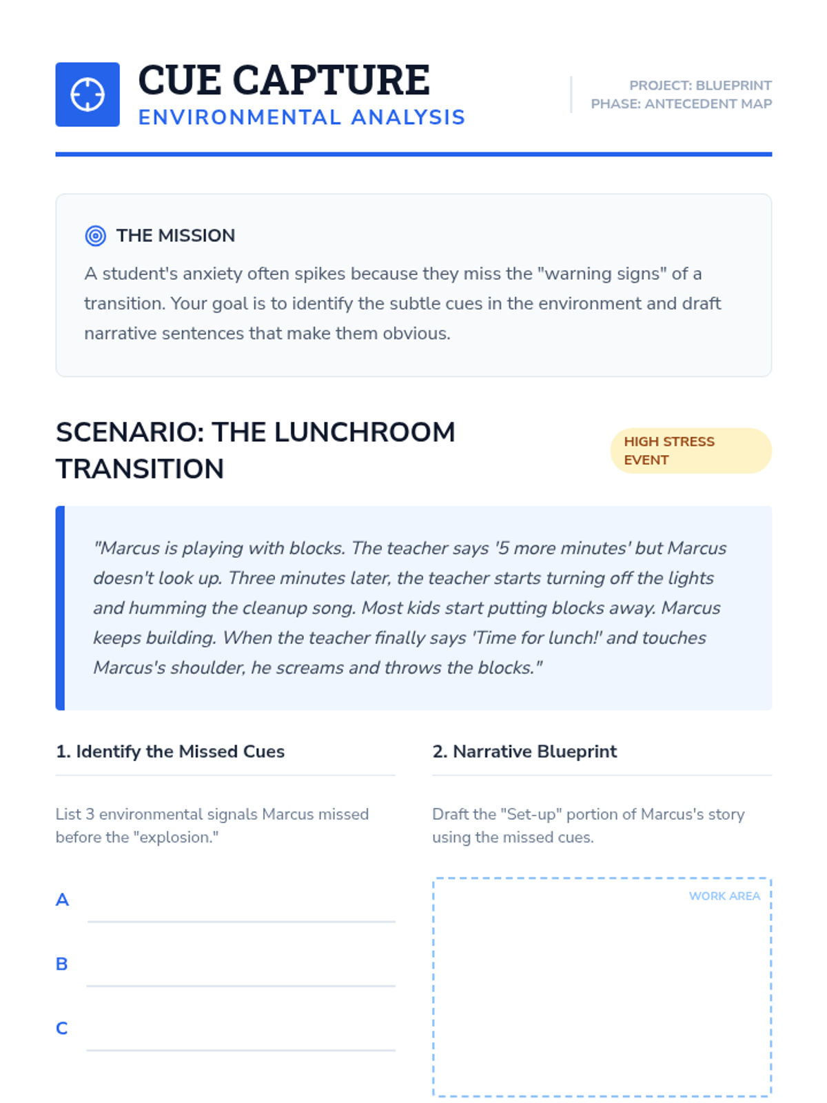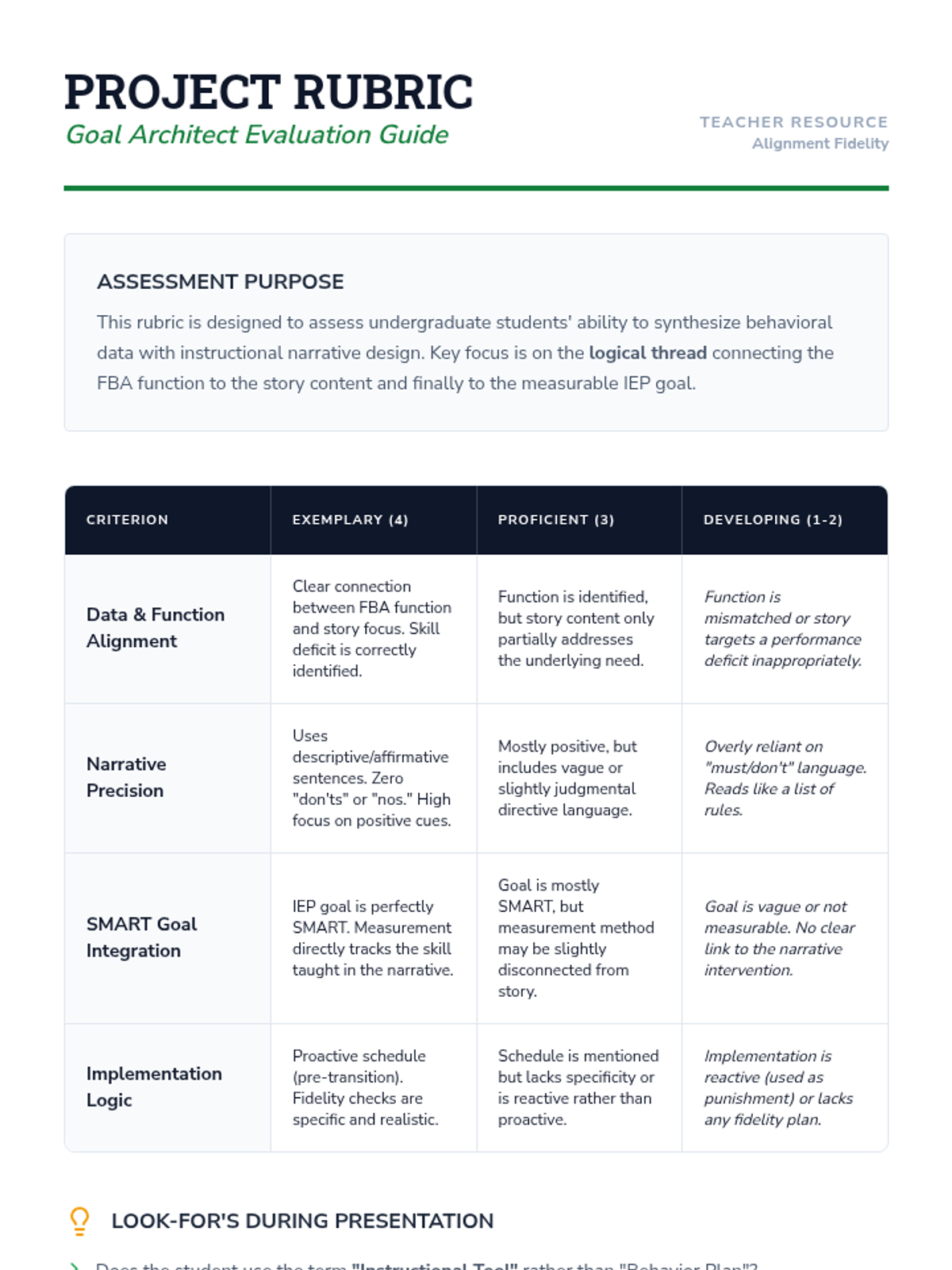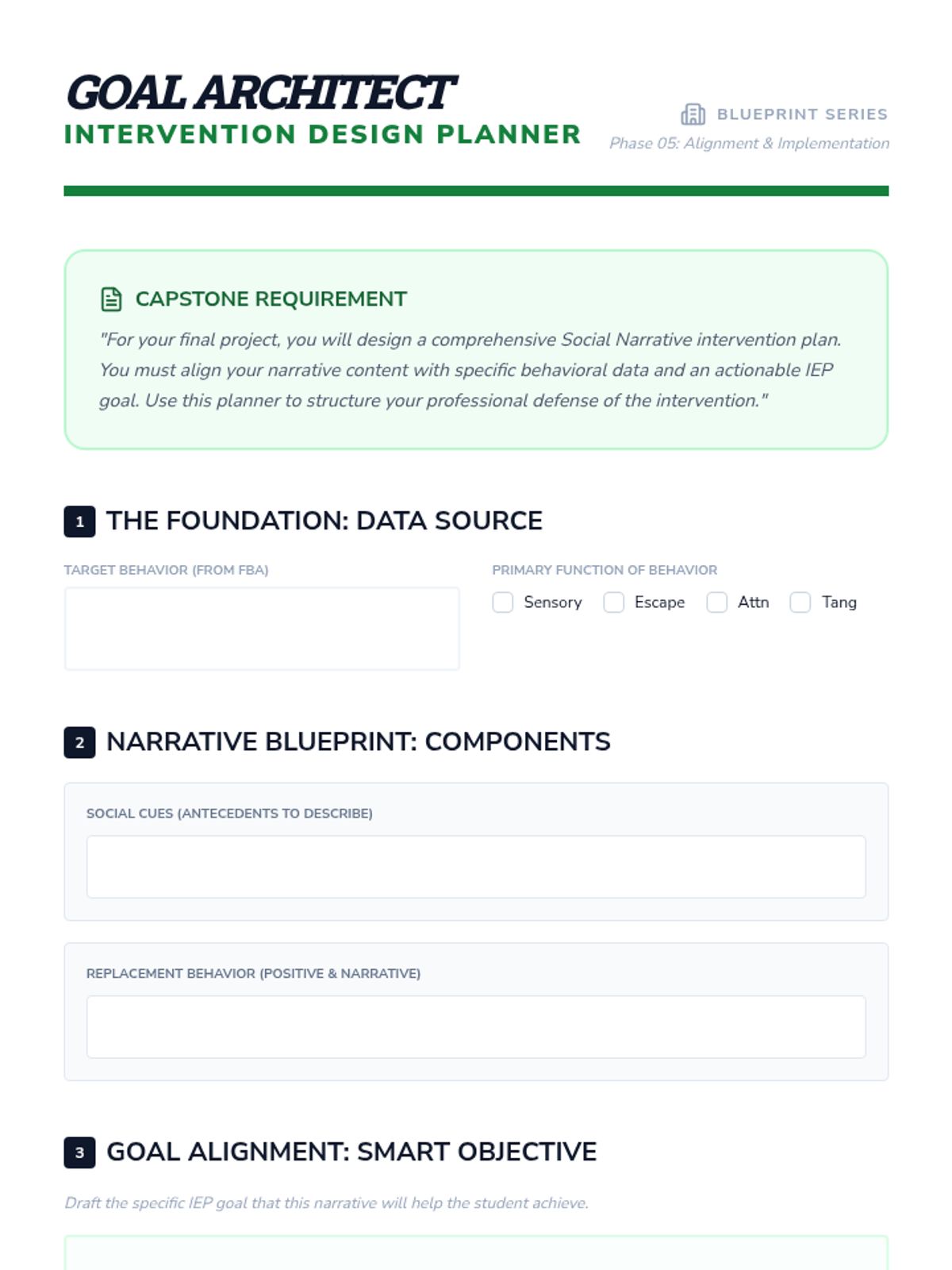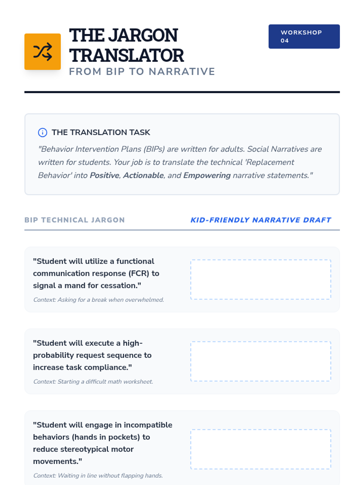 This sequence guides undergraduate students through the process of aligning social narratives with Functional Behavior Assessment (FBA) data. Students move from interpreting behavioral functions to drafting narrative cues and replacement behaviors, ensuring social stories serve as effective instructional tools for students with diverse needs.