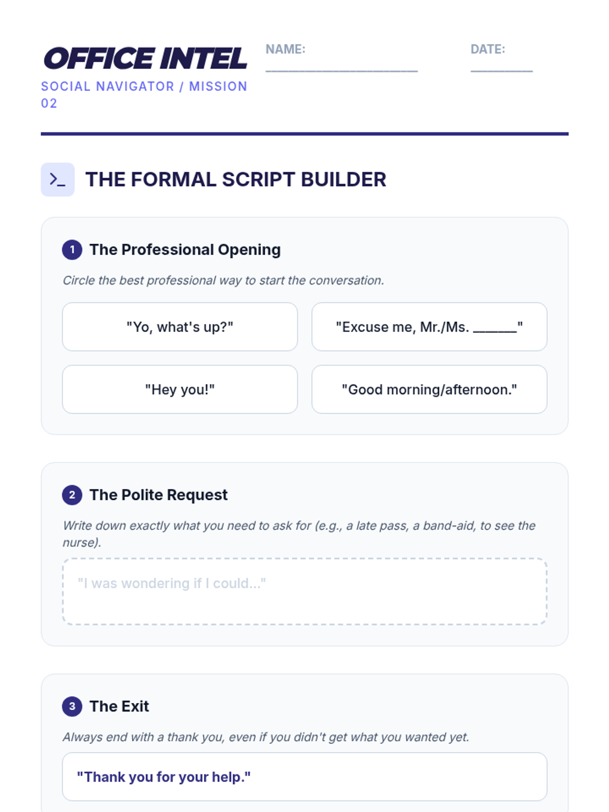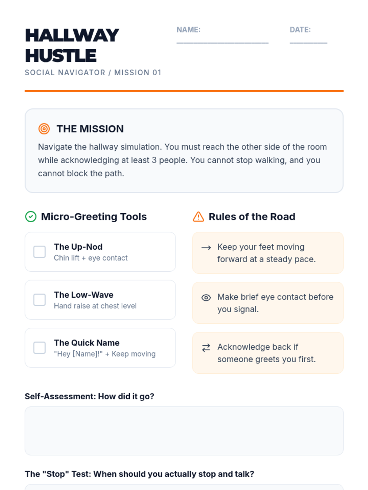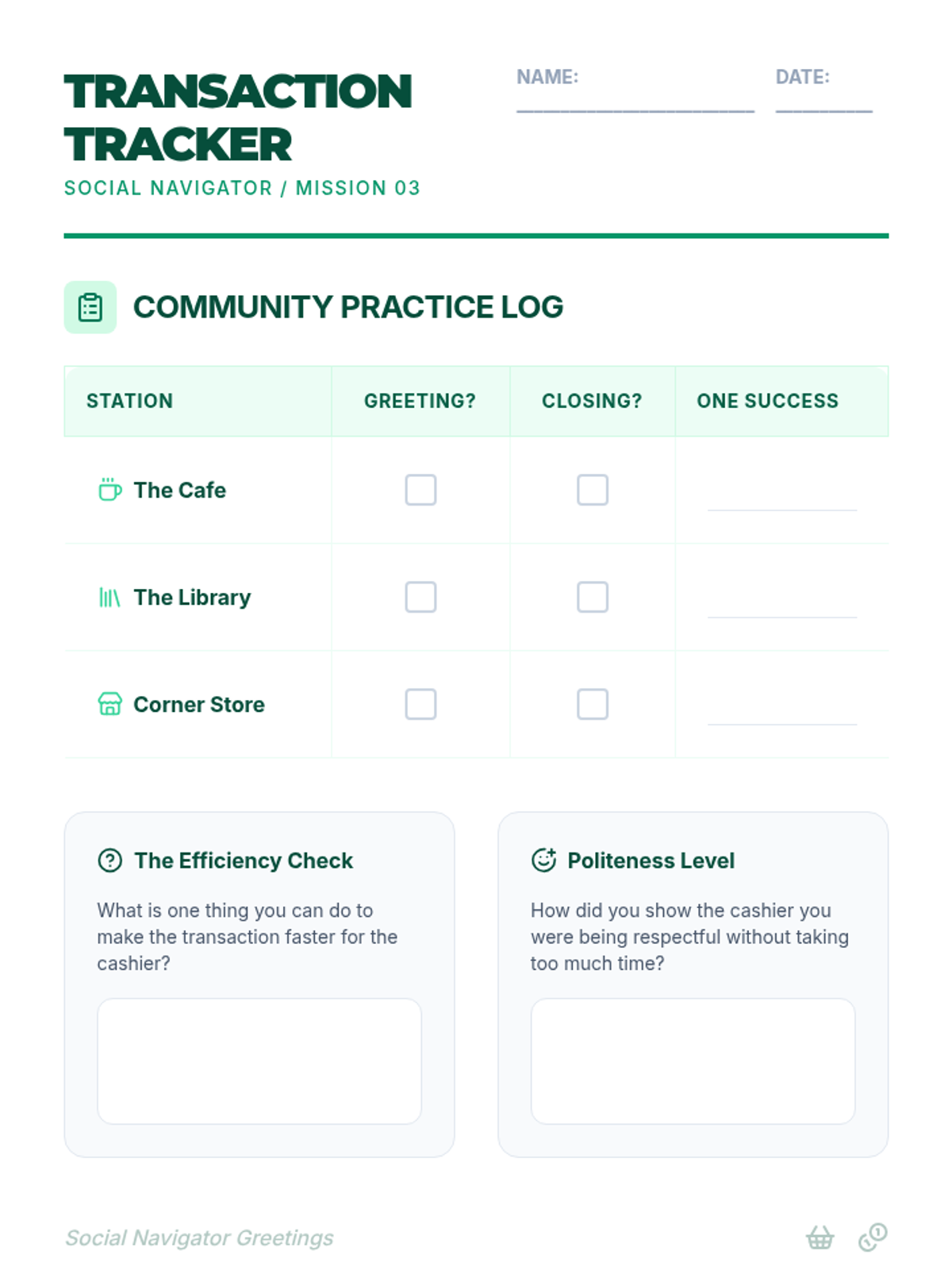 A social communication unit for 7th-grade students focused on mastering context-appropriate greetings through realistic simulations in school and community settings. Students develop a 'Social Playbook' to navigate transitions, formal requests, and unexpected encounters.