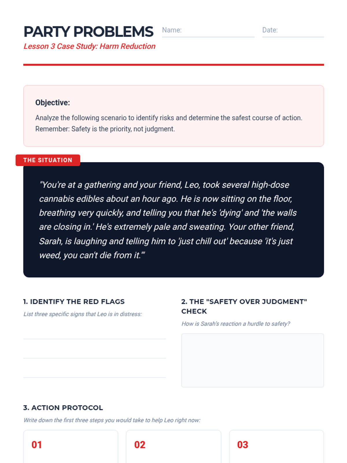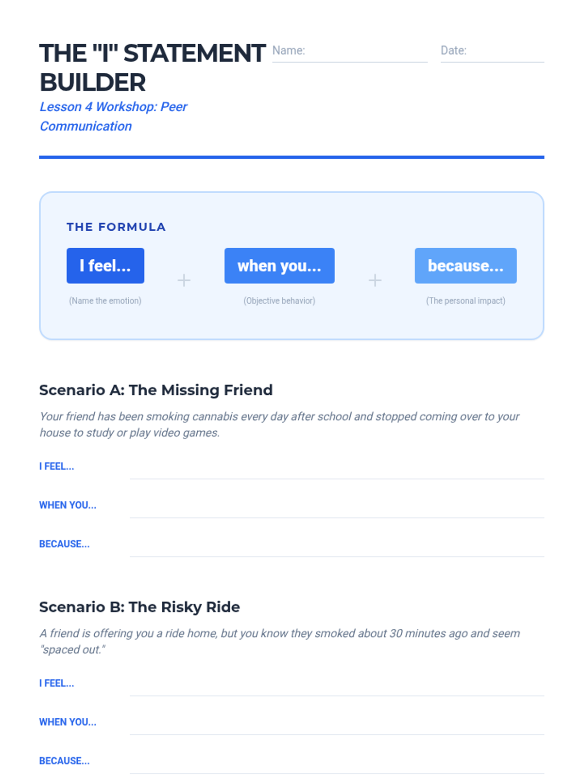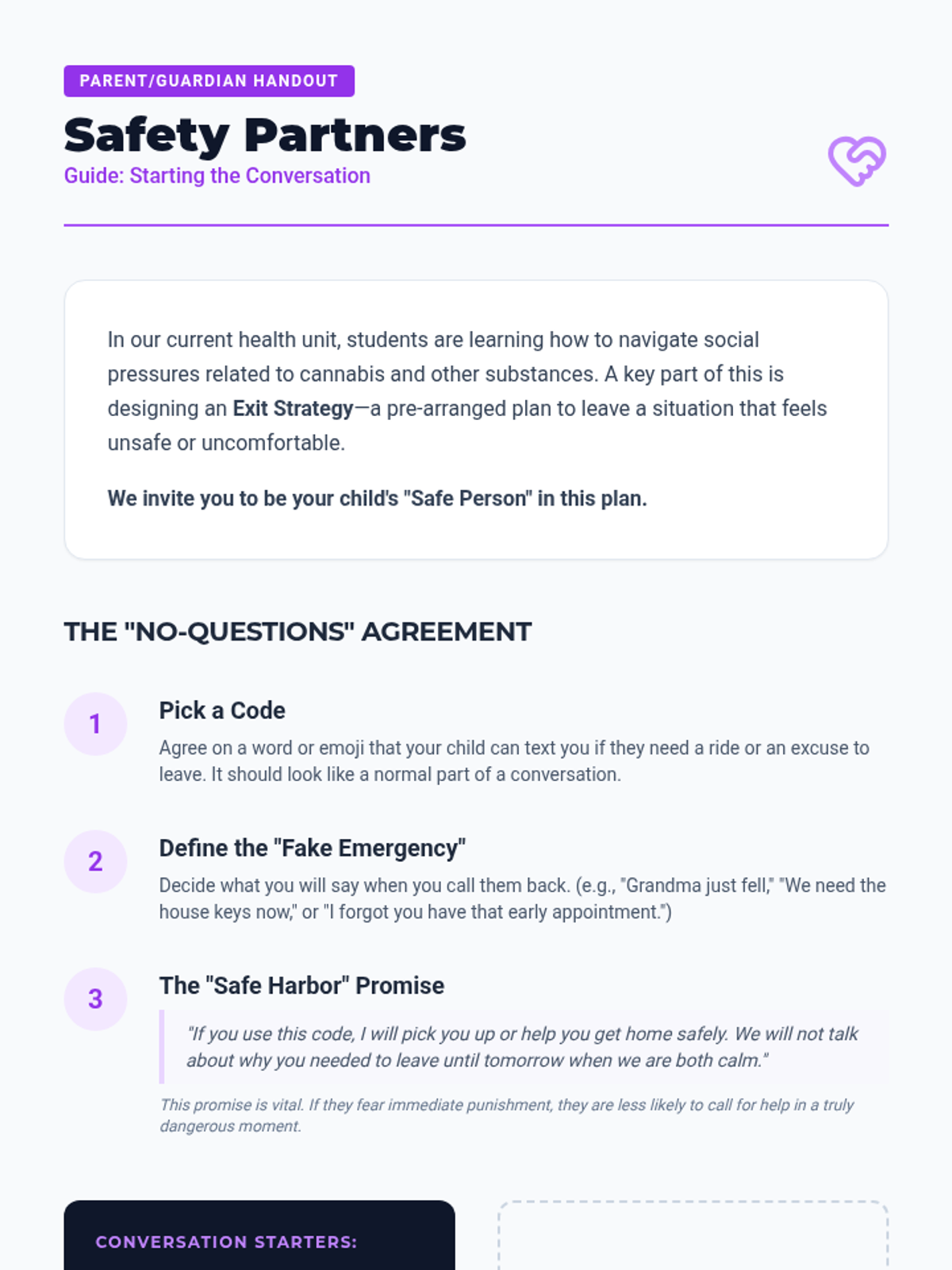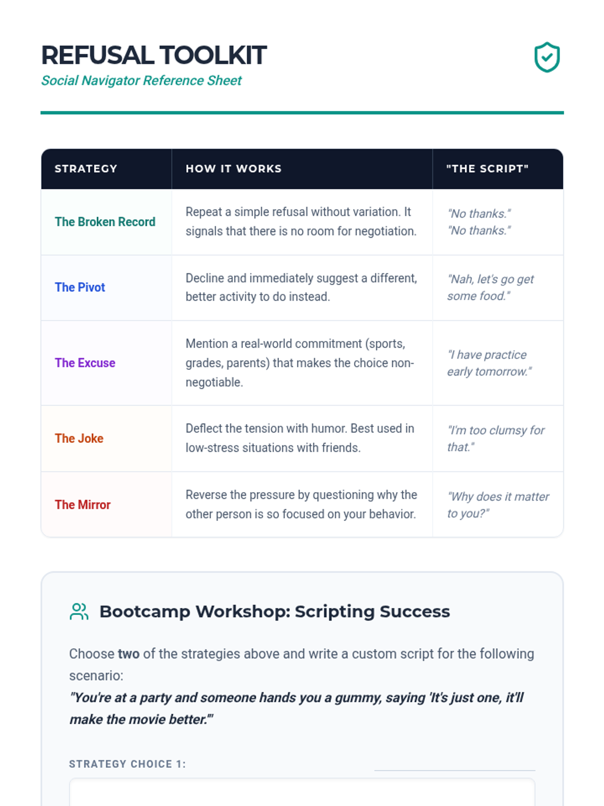 A 5-lesson health sequence for 9th graders focused on social navigation, refusal skills, and safety strategies regarding cannabis. Students develop practical tools to resist peer pressure, support friends, and create personal exit plans.