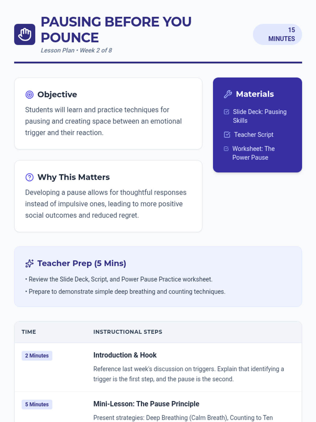 A high-impact 5-lesson sequence designed for credit-deficient high school sophomores to reclaim their academic path. The curriculum reframes impulse control as a strategic 'power move' for achieving independence, career success, and graduation through cognitive discipline and environmental awareness.
