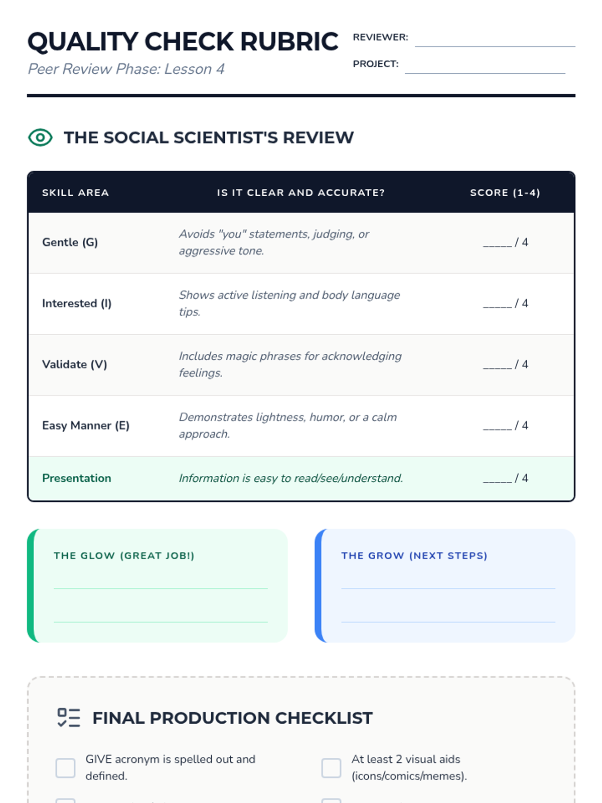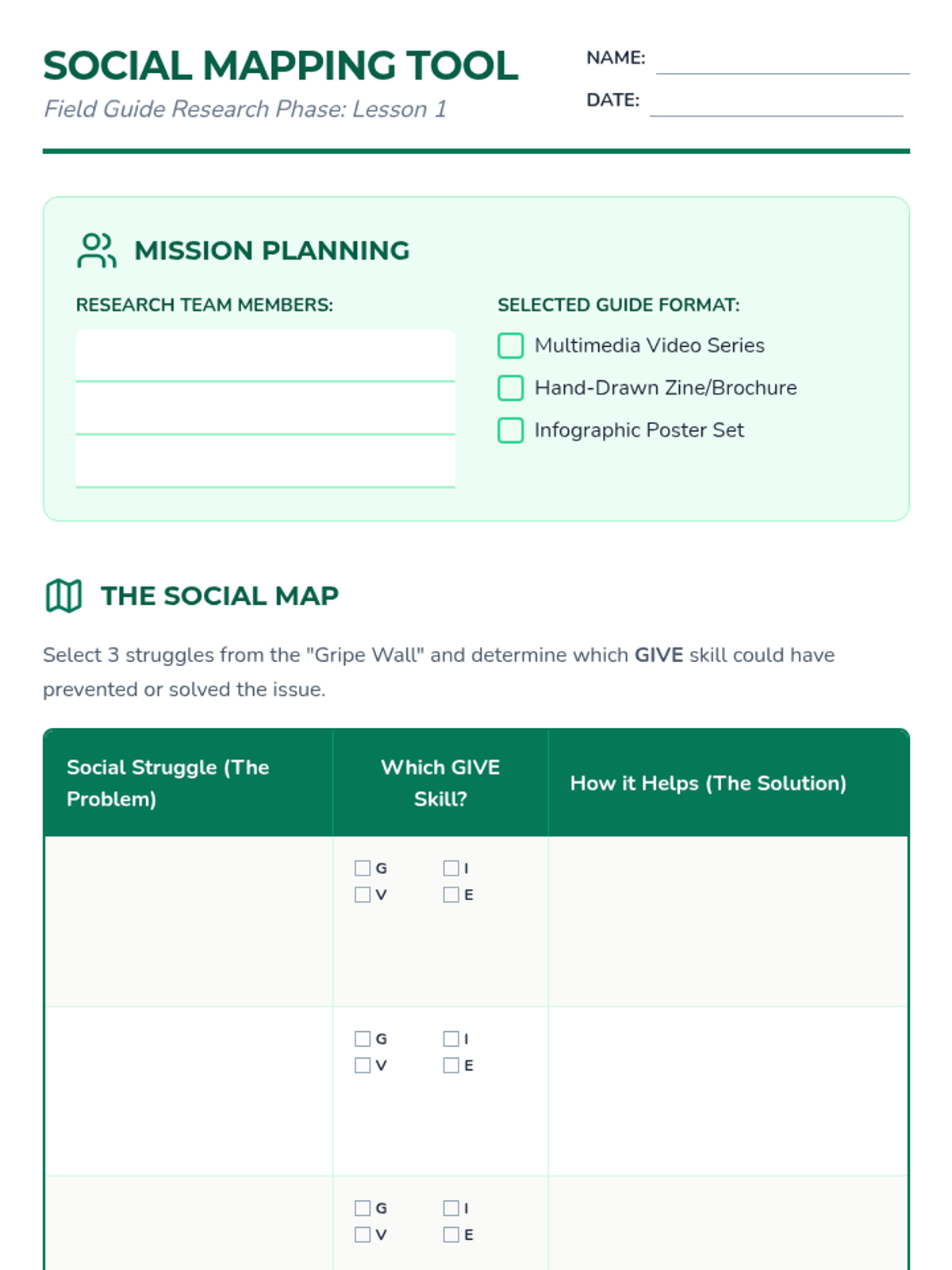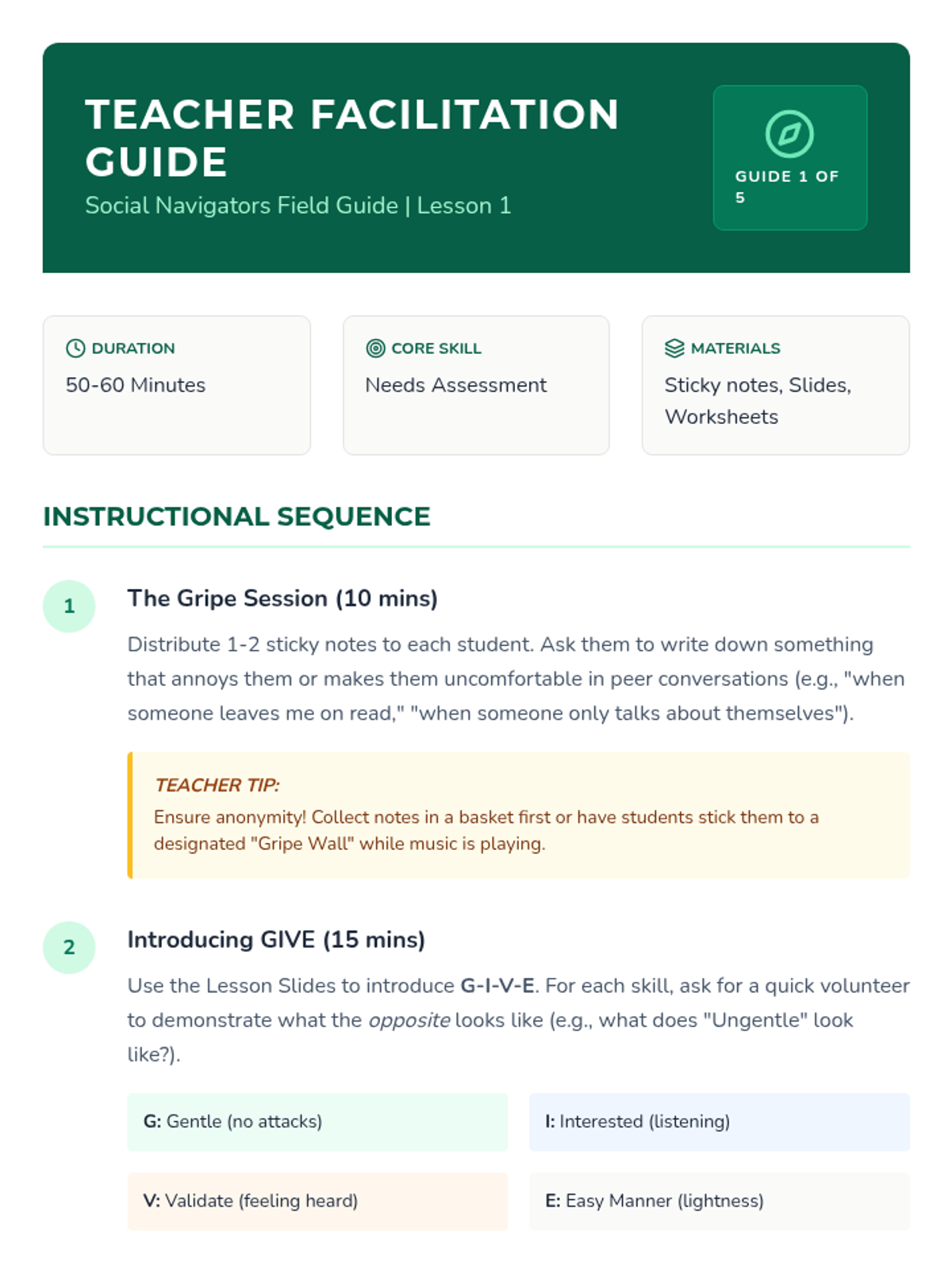 A project-based sequence where 6th-grade students research relationship pitfalls and create a 'Field Guide to Middle School Friendships' using the GIVE skills (Gentle, Interested, Validate, Easy Manner). Students synthesize DBT interpersonal effectiveness skills into peer-to-peer teaching tools like zines, videos, or posters.