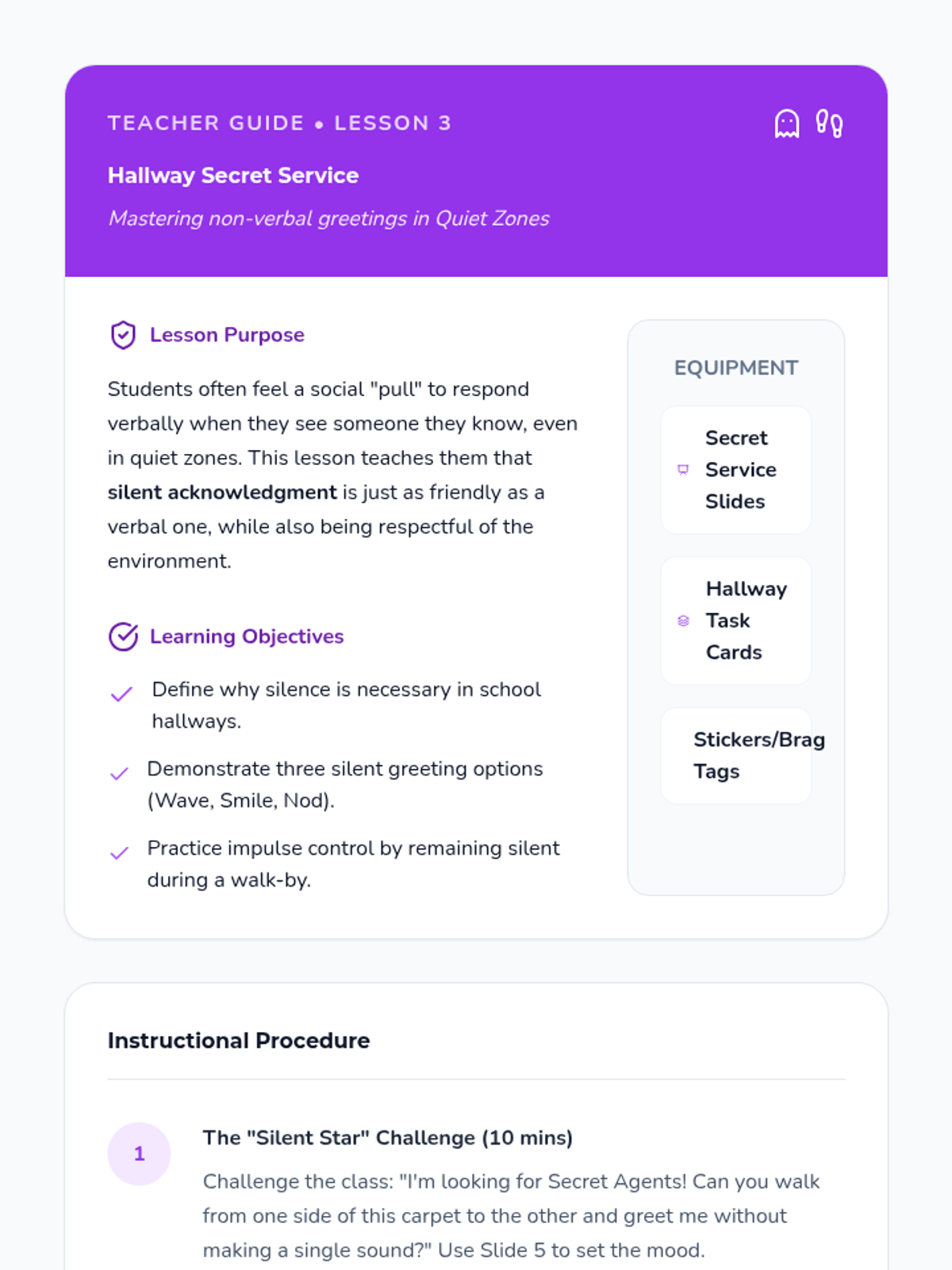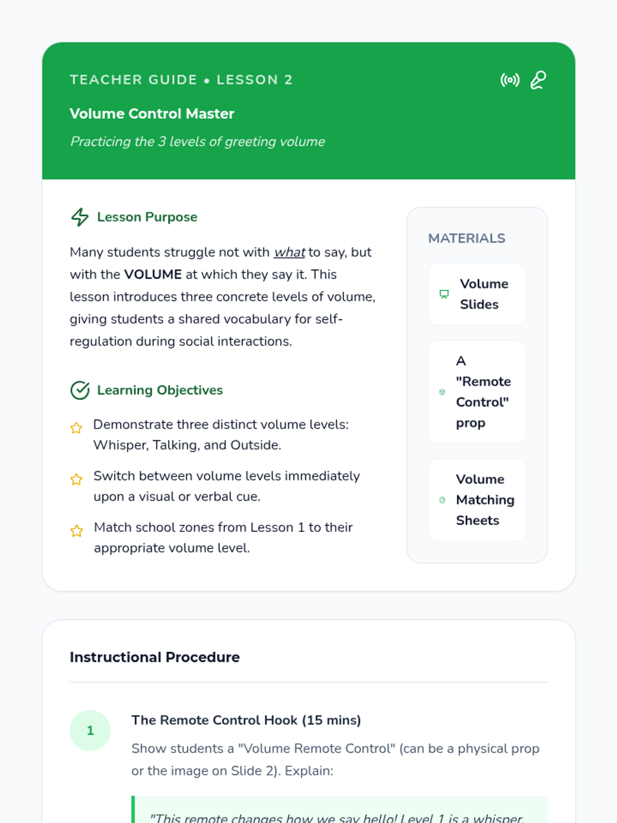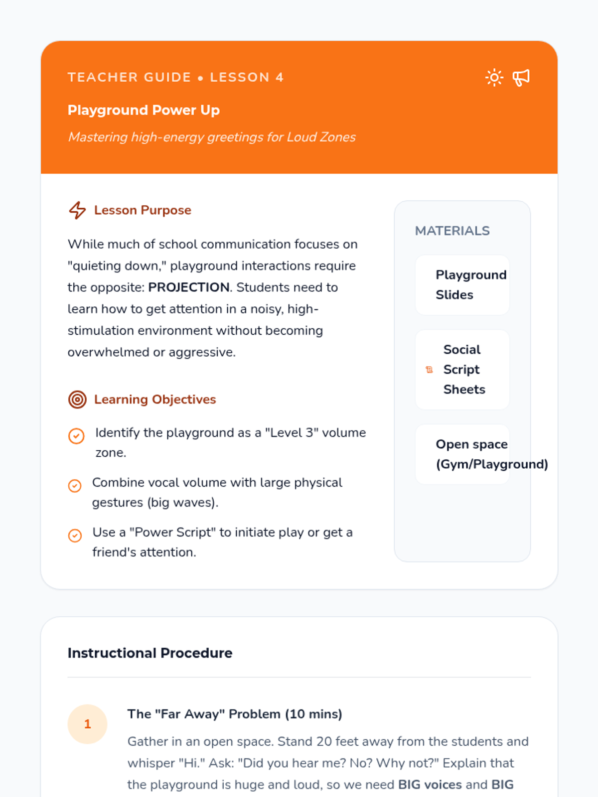A 5-lesson sequence for Kindergarten students focusing on modulating greeting volume and style based on their physical location within a school. Students move from identifying 'Quiet' and 'Loud' zones to mastering silent greetings in hallways and energetic greetings on the playground.