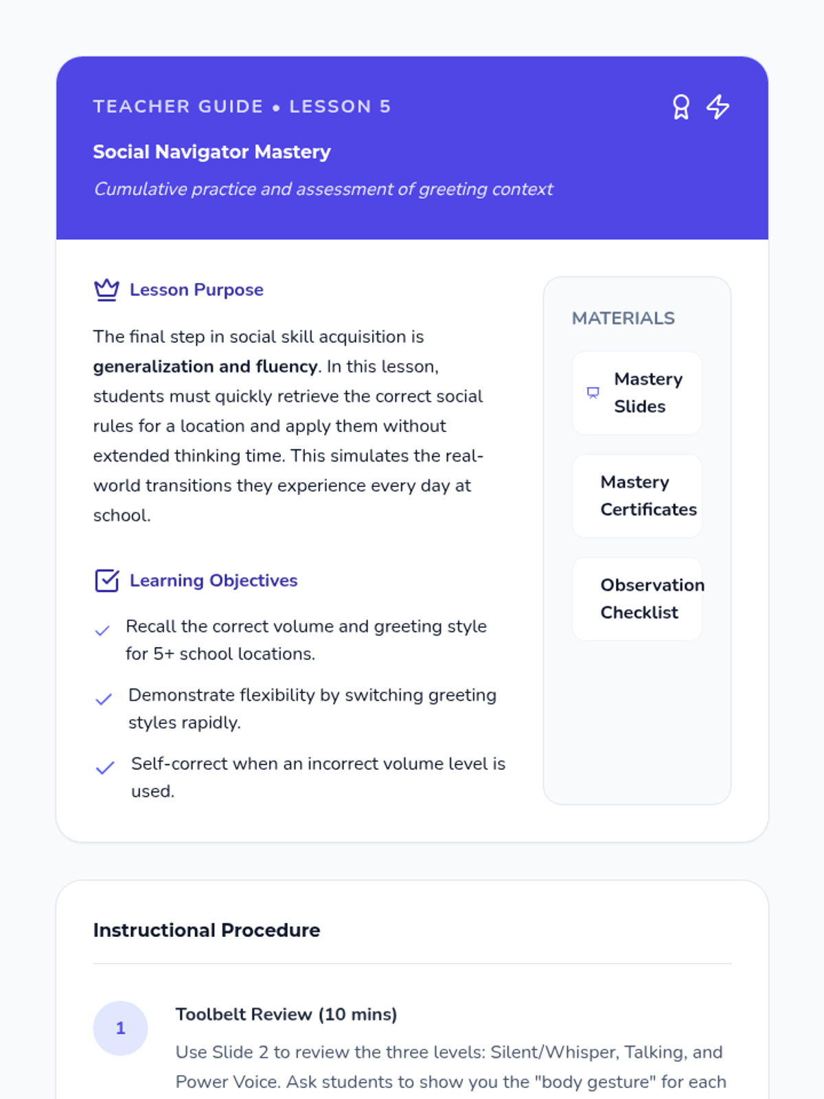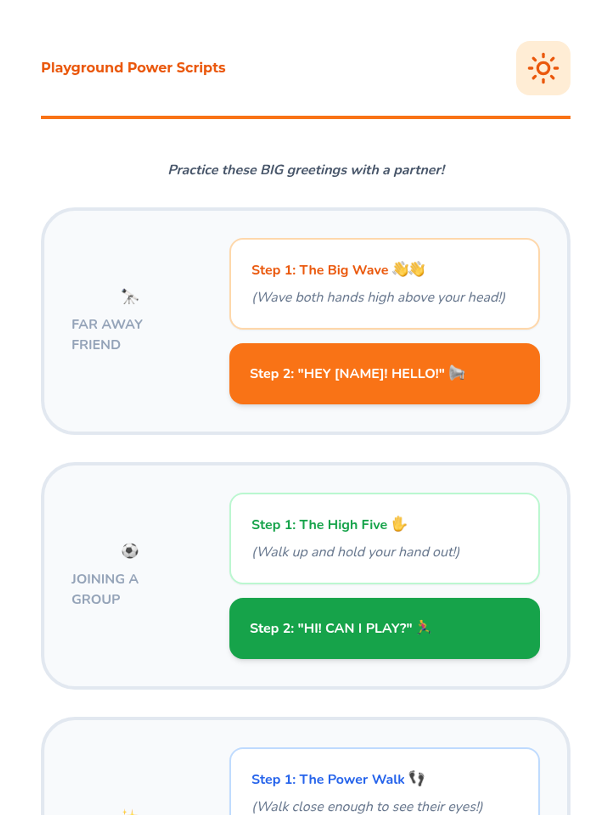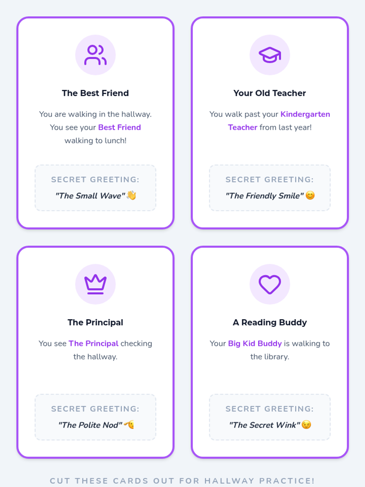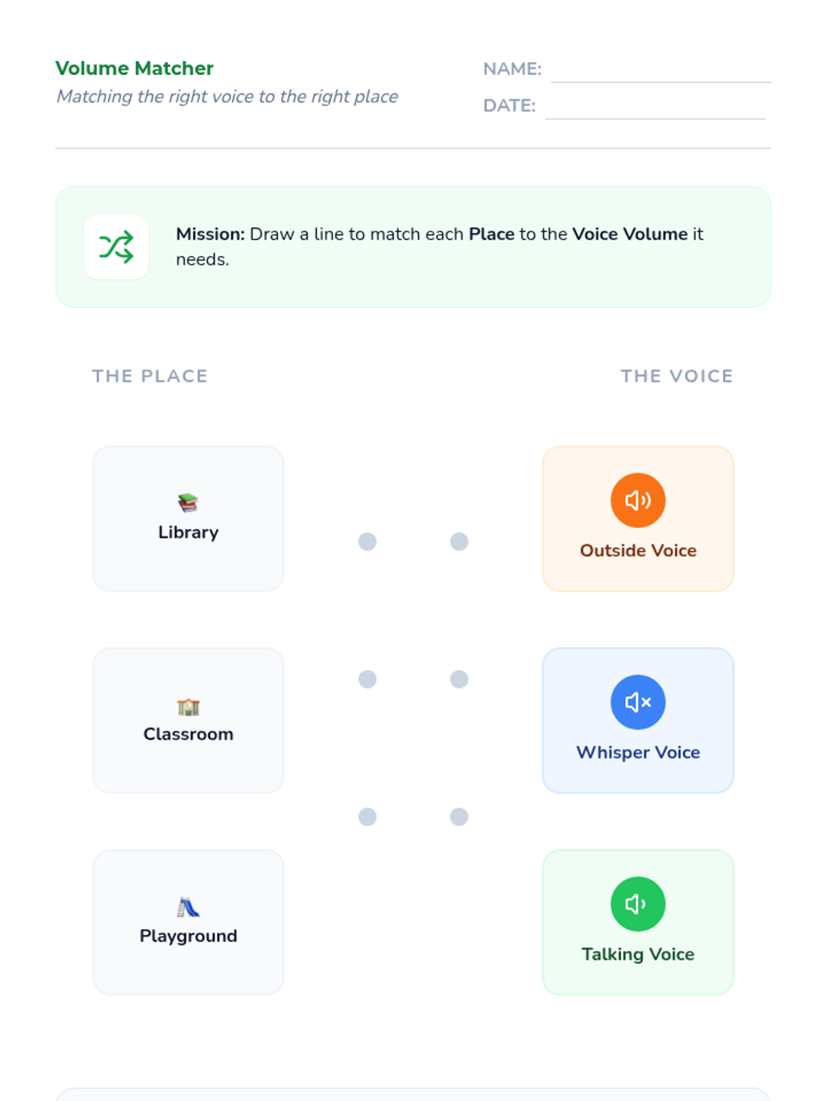 A 5-lesson sequence for Kindergarten students focusing on modulating greeting volume and style based on their physical location within a school. Students move from identifying 'Quiet' and 'Loud' zones to mastering silent greetings in hallways and energetic greetings on the playground.