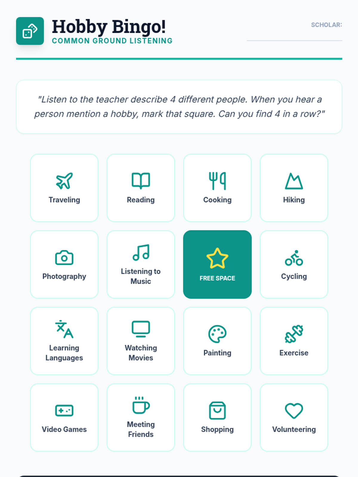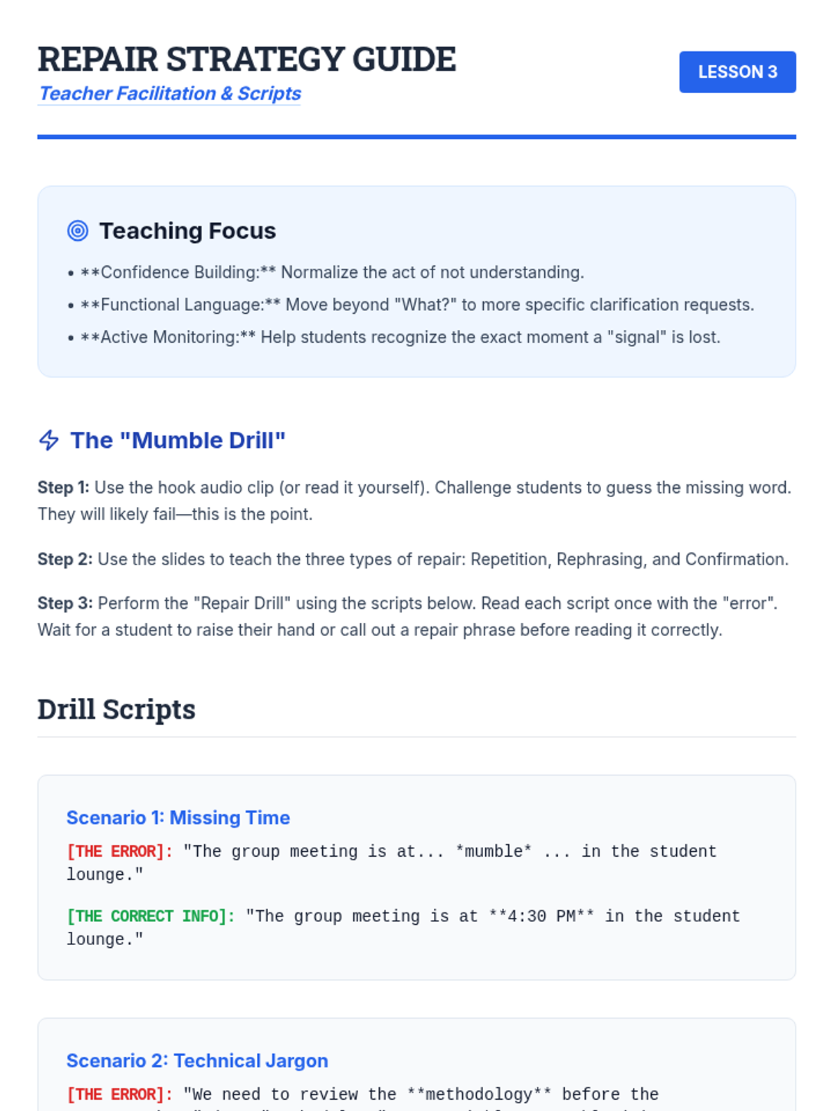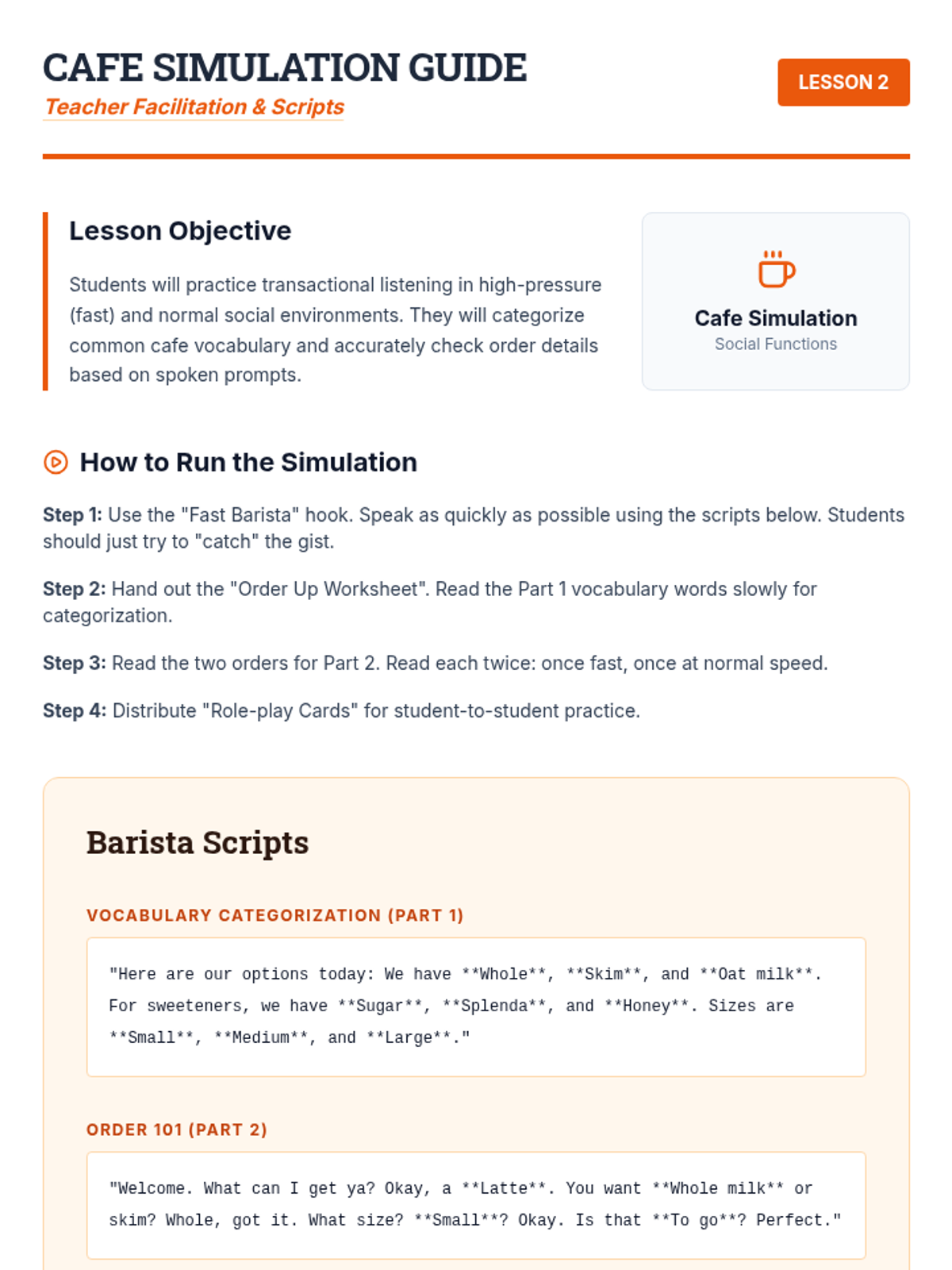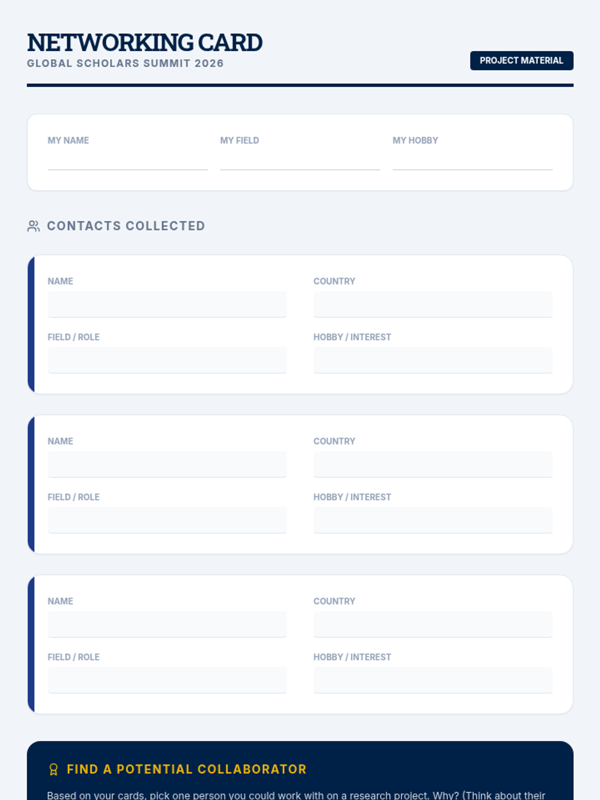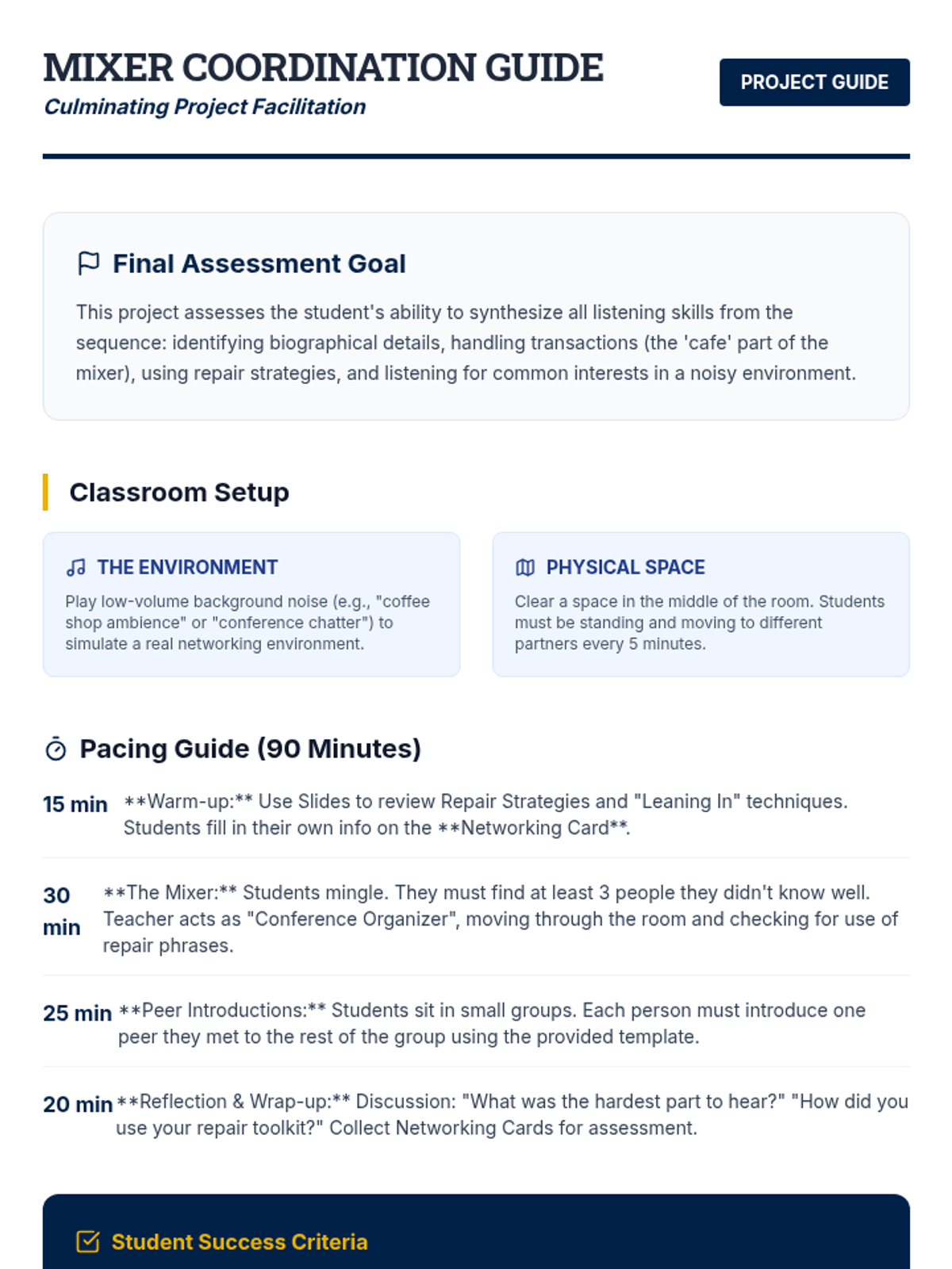 This sequence targets the social and networking needs of graduate students, focusing on high-frequency vocabulary for small talk and professional relationship building. Students progress from basic introductions to handling transactional requests, using clarification strategies, and participating in a mock networking mixer.